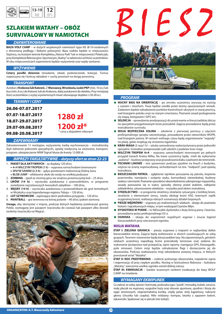 13-19 12 SZLAKIEM WATAHY – OBÓZ SURVIVALOWY W NAMIOTACH ZAKWATEROWANIE BAZA VOLF CAMP – w dużych wojskowych namiotach typu NS (8-10-osobowych z drewnianą podłogą i łóżkami polowymi). Baza rozbita będzie w miejscowości Stężnica, na lesistym terenie Kompleksu „Natura Park” lub w miejscowości Polańczyk, przy Kompleksie Rekreacyjno-Sportowym„Skalny” w zależności od ilości uczestników. W obu miejscowościach zapewnione będzie wyżywienie oraz węzły sanitarne. WYŻYWIENIE Cztery posiłki dziennie (śniadanie, obiad, podwieczorek, kolacja). Turnus rozpoczyna się i kończy obiadem + suchy prowiant na drogę powrotną. TRANSPORT Autokar z Krakowa lub Katowic. Z Warszawy, Wrocławia, Łodzi PKP (min. 10 os.) lub bus (min. 6 os.) do Katowic lub do Krakowa, dalej autokarem do obiektu. Przy mniejszej ilości uczestników z wyżej wymienionych miast obowiązuje dopłata (+50 zł/os.) PROGRAM TERMINY I CENY 26.06-07.07.2017 07.07-18.07.2017 18.07-29.07.2017 29.07-09.08.2017 09.08-20.08.2017 NOCNY BIEG NA ORIENTACJĘ – po zmroku uczestnicy wyruszą na wyścig z czasem i strachem. Trasa będzie wiodła przez tereny opuszczonych wiosek. Zadaniem będzie odnalezienie punktów kontrolnych ukrytych w starej piwnicy, nad brzegiem potoku oraz na starym cmentarzu. Poznanie zasad posługiwania się mapą, kompasem i GPS`em. SELEKCJA – sprawdzenie predyspozycji do przetrwania w bieszczadzkiej dziczy na specjalnie przygotowanym torze przeszkód. Zajęcia prowadzone będą przez instruktorów survivalu. MISJA BEZPIECZNA SOLINA – szkolenie z pierwszej pomocy z użyciem profesjonalnego sprzętu ratowniczego, prowadzone przez ratowników WOPR, nad brzegiem jeziora. W ramach wolnego czasu będą organizowane "wypady" na plażę, gdzie znajdują się strzeżone kąpieliska. KRAV-MAGA (3 razy1 h) – sztuka samoobrony wykorzystywana przez jednostki specjalne. Instruktor przeprowadzi cykl szkoleń z podstaw krav-magi. WILCZYM TROPEM 4×4 – wyprawa samochodami terenowymi po pełnych przygód trasach Krainy Wilka. Na trasie uczestnicy będą mieli do wykonania „zadania”– budowy przeprawy oraz poszukiwania baku z paliwem do terenówki. TECHNIKI LINOWE – test sprawności podczas zjazdów na linach z budynku, wejścia na ścianę wspinaczkową, wchodzeniach na tzw. "małpach", pod opieką instruktora. BIESZCZADZKI PATROL – zgłębienie tajników poruszania się patrolu, tropienia przeciwnika, rozwijania i zwijania szyku, komunikacji niewerbalnej, budowy szałasu i ziemianki. Poznanie sposobów obezwładnienia uzbrojonego napastnika, zasady poruszania się w walce, sposoby obrony przed atakiem, odbijanie zakładników, szturmowanie obiektów – wszystko pod okiem instruktora. STRZELECTWO – w programie strzelnicy strzelanie sytuacyjne z krótkiej broni, strzelanie z elementami stresu, nauka obsługi broni ASG (wiernych replik oryginalnej broni), realizacja różnych scenariuszy działań bojowych. PIESZE WĘDRÓWKI – wyprawy po malowniczych szlakach, okazja do poznania historii i najciekawszych miejsc, w tym wodospad Czartów Młyn. DYSKOTEKA W PIANIE – to NIEzwykłe dyskoteka z dużą ilością piany i laserów, prowadzona przez profesjonalnego DJ`a. OGNISKA – okazja do wspomnień wspólnych wypraw i snucia legend bieszczadzkich przy wieczornym ognisku. 1280 zł 1200 zł* * cena z dojazdem własnym ZAPEWNIAMY Zakwaterowanie 11 noclegów, wyżywienie, kadrę wychowawczo – instruktorską (byli żołnierze jednostek specjalnych), opiekę medyczną na wezwanie, transport, program, ubezpieczenie NNW Signal Iduna do kwoty 12.000 zł. IMPREZY FAKULTATYWNE – dotyczy ofert ze stron 22-23 1. PAKIET DLA AKTYWNYCH – za dopłatą 120 zł/os. ■ 4×4 WILCZYM TROPEM (1 h) – wyprawa samochodami terenowymi ■ SPŁYW SANEM (2-3 h) – spływ pontonami malowniczą Doliną Sanu ■ BLOB JUMP – efektowne skoki do wody na wielkiej poduszce 2. ZORBING – zjazd ze stromej góry we wnętrzu przezroczystej kuli – 25 zł/os. 3. LWÓW (14 h) – wycieczka autokarowa z przewodnikiem, w programie zwiedzanie najciekawszych lwowskich zabytków – 100 zł/os. 4. WĘGRY (14 h) – wycieczka autokarowa z przewodnikiem do grot termalnych w Miszkolcu oraz legendarnego regionu Tokaju – 120 zł/os. 5. LOT SZYBOWCEM – zapierająca dech podniebna przygoda – 120 zł/os. 6. PAINTBALL – gra terenowa na leśnej polanie – 40 zł/os./pakiet startowy. Uwaga, aby skorzystać z imprez, podczas których będziemy przekraczać granicę Polski, wymagany jest paszport (wycieczka do Lwowa) lub paszport albo dowód osobisty (wycieczka na Węgry). MISJA WATAHA ETAP I: ZIELONA GRANICA – piesza wyprawa z mapami w najbardziej dzikie bieszczadzkie tereny. Zajęcia będą realizowane w dwóch rywalizujących ze sobą grupach. Terenem manewrów będą bieszczadzkie lasy. Na zapomnianych, górskich szlakach uczestnicy napotkają liczne przeszkody terenowe oraz zadania do wykonania (przeprawa nad przepaścią, tajne raporty, nawigacja GPS, fotozagadki, pole minowe). Celem misji będzie odnalezienie flagi i dostarczenie jej do obozowiska. Podczas realizowania misji odwiedzone zostaną miejsca, w których powstawał serial "Wataha". ETAP II: NOC PRZETRWANIA – rozbicie polowego obozowiska, rozpalenie ognia i regeneracja sił przy ciepłym posiłku. Nocleg w leśniczówce Rebrowa – bohatera „Watahy”, wieczorne wielkie ognisko wśród dzikiej natury. ETAP III: EWAKUACJA – bardzo wczesnym rankiem ewakuacja do bazy WOLF CAMP na śniadanie. WYMAGANY EKWIPUNEK Co zabrać ze sobą: śpiwór i karimatę, poduszka typu "jasiek", menażkę, kubek, sztućce, mały plecak na wyprawy, wygodne buty oraz obuwie sportowe, spodnie i bluzę do zajęć terenowych, nieprzemakalną kurtkę, ciepły polar, strój kąpielowy, nakrycie głowy (chustka lub czapka). Mile widziany: kompas, latarka z zapasem baterii, rękawiczki. Spakować się w plecak (nie torbę!). ORGANIZATOR: A.T. Bieszczady Adventure 22