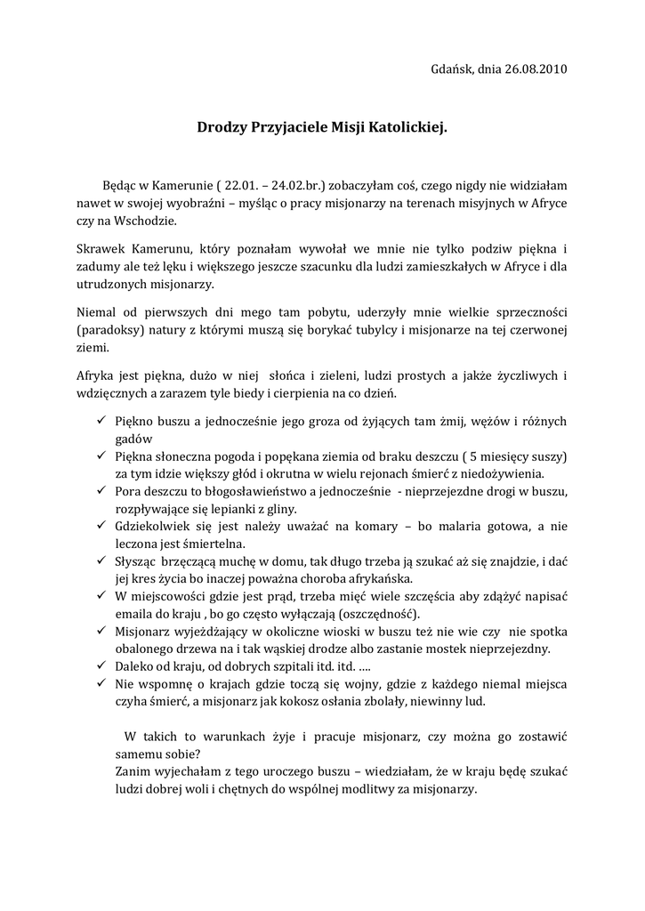 Gdańsk, dnia 26.08.2010 Drodzy Przyjaciele Misji Katolickiej. Będąc w Kamerunie ( 22.01. – 24.02.br.) zobaczyłam coś, czego nigdy nie widziałam nawet w swojej wyobraźni – myśląc o pracy misjonarzy na terenach misyjnych w Afryce czy na Wschodzie. Skrawek Kamerunu, który poznałam wywołał we mnie nie tylko podziw piękna i zadumy ale też lęku i większego jeszcze szacunku dla ludzi zamieszkałych w Afryce i dla utrudzonych misjonarzy. Niemal od pierwszych dni mego tam pobytu, uderzyły mnie wielkie sprzeczności (paradoksy) natury z którymi muszą się borykać tubylcy i misjonarze na tej czerwonej ziemi. Afryka jest piękna, dużo w niej słońca i zieleni, ludzi prostych a jakże życzliwych i wdzięcznych a zarazem tyle biedy i cierpienia na co dzień. Piękno buszu a jednocześnie jego groza od żyjących tam żmij, wężów i różnych gadów Piękna słoneczna pogoda i popękana ziemia od braku deszczu ( 5 miesięcy suszy) za tym idzie większy głód i okrutna w wielu rejonach śmierć z niedożywienia. Pora deszczu to błogosławieństwo a jednocześnie - nieprzejezdne drogi w buszu, rozpływające się lepianki z gliny. Gdziekolwiek się jest należy uważać na komary – bo malaria gotowa, a nie leczona jest śmiertelna. Słysząc brzęczącą muchę w domu, tak długo trzeba ją szukać aż się znajdzie, i dać jej kres życia bo inaczej poważna choroba afrykańska. W miejscowości gdzie jest prąd, trzeba mięć wiele szczęścia aby zdążyć napisać emaila do kraju , bo go często wyłączają (oszczędność). Misjonarz wyjeżdżający w okoliczne wioski w buszu też nie wie czy nie spotka obalonego drzewa na i tak wąskiej drodze albo zastanie mostek nieprzejezdny. Daleko od kraju, od dobrych szpitali itd. itd. …. Nie wspomnę o krajach gdzie toczą się wojny, gdzie z każdego niemal miejsca czyha śmierć, a misjonarz jak kokosz osłania zbolały, niewinny lud. W takich to warunkach żyje i pracuje misjonarz, czy można go zostawić samemu sobie? Zanim wyjechałam z tego uroczego buszu – wiedziałam, że w kraju będę szukać ludzi dobrej woli i chętnych do wspólnej modlitwy za misjonarzy. Opatrzność Boża jest im bardzo potrzebna! Dlatego pytam cię Dobry Człowieku i Przyjacielu Misji, czy chcesz się włączyć do „Adopcji Duchowej Misjonarzy” ? Na czym ona polega? Nazywa się „ Róża dla Misjonarza” Misjonarz otrzymuje 7 róż, każda róża przedstawia dzień tygodnia. Ty decydujesz jaki dzień chcesz ofiarować dla jednego misjonarza (możesz wziąć kilku misjonarzy) ja go Ci przydzielę. W tym dniu na swój sposób możesz go przeżyć, ważne jest aby był ofiarowany Bogu w intencji wyżej podanej. Podaję różne przykłady na dobre przeżycie: możesz ofiarować: cierpienie, radości, niepowodzenia, sukcesy, pójść na Mszę Św., zrobić dobry uczynek, pojednać się z kimś, zmówić różaniec w tej intencji, nałożyć sobie post itp. Inicjatywa w Twoich rękach. Jak się zdeklarujesz podasz mi wybrany dzień, wtedy otrzymasz ode mnie przygotowaną deklaracje ze zdjęciem misjonarza, adresem i krótką historią. Misjonarz otrzyma też Twój adres jeżeli będzie to możliwe Twoje zdjęcie i różę jako symbol modlitwy. Posłuchaj co Ci mówi serce i zgłoś się do mnie . Nr Tel. 693 802 707 email [email protected] . Na to apostolstwo otrzymałam błogosławieństwo od moich Wyższych Przełożonych. Serdecznie pozdrawiam i życzę Szczęść Boże S. Teresa Gieńko