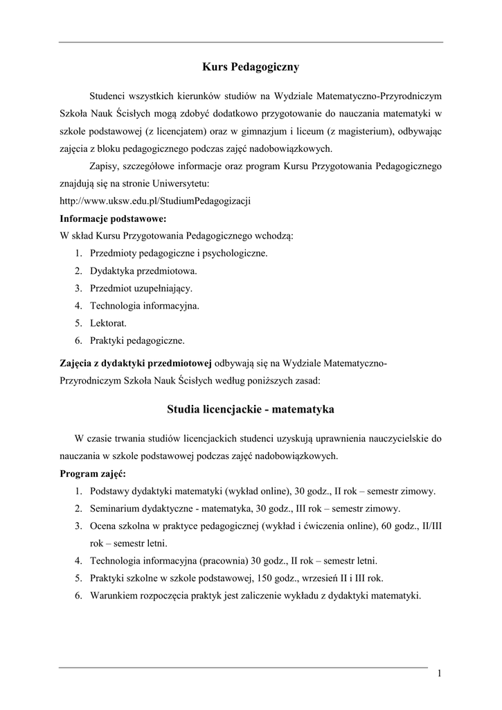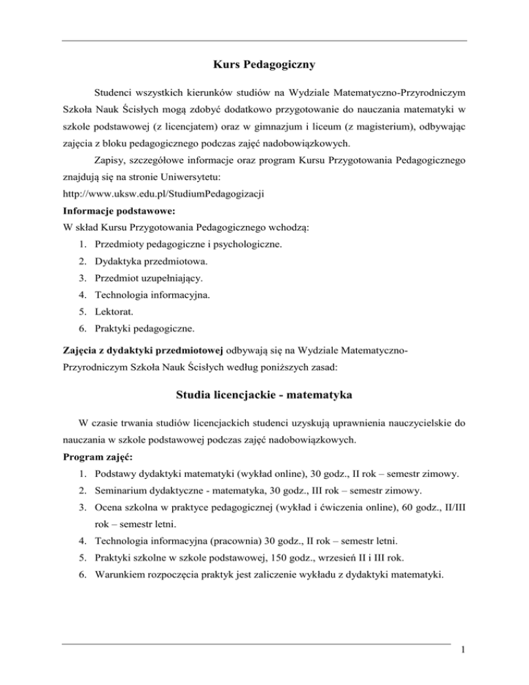 Kurs Pedagogiczny Studenci wszystkich kierunków studiów na Wydziale Matematyczno-Przyrodniczym Szkoła Nauk Ścisłych mogą zdobyć dodatkowo przygotowanie do nauczania matematyki w szkole podstawowej (z licencjatem) oraz w gimnazjum i liceum (z magisterium), odbywając zajęcia z bloku pedagogicznego podczas zajęć nadobowiązkowych. Zapisy, szczegółowe informacje oraz program Kursu Przygotowania Pedagogicznego znajdują się na stronie Uniwersytetu: http://www.uksw.edu.pl/StudiumPedagogizacji Informacje podstawowe: W skład Kursu Przygotowania Pedagogicznego wchodzą: 1. Przedmioty pedagogiczne i psychologiczne. 2. Dydaktyka przedmiotowa. 3. Przedmiot uzupełniający. 4. Technologia informacyjna. 5. Lektorat. 6. Praktyki pedagogiczne. Zajęcia z dydaktyki przedmiotowej odbywają się na Wydziale MatematycznoPrzyrodniczym Szkoła Nauk Ścisłych według poniższych zasad: Studia licencjackie - matematyka W czasie trwania studiów licencjackich studenci uzyskują uprawnienia nauczycielskie do nauczania w szkole podstawowej podczas zajęć nadobowiązkowych. Program zajęć: 1. Podstawy dydaktyki matematyki (wykład online), 30 godz., II rok – semestr zimowy. 2. Seminarium dydaktyczne - matematyka, 30 godz., III rok – semestr zimowy. 3. Ocena szkolna w praktyce pedagogicznej (wykład i ćwiczenia online), 60 godz., II/III rok – semestr letni. 4. Technologia informacyjna (pracownia) 30 godz., II rok – semestr letni. 5. Praktyki szkolne w szkole podstawowej, 150 godz., wrzesień II i III rok. 6. Warunkiem rozpoczęcia praktyk jest zaliczenie wykładu z dydaktyki matematyki. 1 Uzupełniające studia magisterskie na kierunku matematyka Studenci, którzy uzyskali uprawnienia nauczycielskie do nauczania w szkole podstawowej podczas studiów licencjackich, mogą je rozszerzyć na szkołę gimnazjalną i ponadpodstawową podczas zajęć nadobowiązkowych. Program zajęć: 1. Dydaktyka matematyki (wykład online), 30 godz., I/II rok – semestr zimowy. 2. Multimedialna pracownia dydaktyki matematyki (laboratorium), 30 godz. I/II rok – semestr zimowy. 3. Technologia informacyjna (pracownia) 30 godz., I/II rok – semestr letni. 4. Neomedia w edukacji matematycznej (wykład i ćwiczenia online), 60 godz., I/II rok – semestr letni. 5. Praktyki szkolne w szkole gimnazjalnej i ponadgimnazjalnej, 150 godz. 6. Warunkiem rozpoczęcia praktyk jest zaliczenie wykładu z dydaktyki matematyki. Zdobywanie uprawnień nauczycielskich - matematyka w czasie dwuletnich studiów magisterskich Studenci, którzy nie uzyskali uprawnień nauczycielskich podczas studiów licencjackich, mogą uzyskać je podczas uzupełniających studiów magisterskich podczas zajęć nadobowiązkowych. Program zajęć: 1. Dydaktyka matematyki (wykład online), 30 godz. 2. Technologia informacyjna (pracownia), 30 godz. 3. Multimedialna pracownia dydaktyki matematyki (laboratorium), 30 godz. 4. Ocena szkolna w praktyce pedagogicznej (wykład i ćwiczenia online), 60 godz. 5. Seminarium dydaktyczne, 30 godz. 6. Neomedia w edukacji matematycznej (wykład i ćwiczenia online), 60 godz. 7. Praktyki szkolne w szkole podstawowej, gimnazjalnej i ponadgimnazjalnej, 300 godz. 8. Warunkiem rozpoczęcia praktyk jest zaliczenie wykładu z dydaktyki matematyki. 2 Zdobywanie uprawnień nauczycielskich - chemia w czasie dwuletnich studiów magisterskich Studenci chemii mogą uzyskać uprawnienia do nauczania tego przedmiotu podczas uzupełniających studiów magisterskich podczas zajęć nadobowiązkowych. Program zajęć: 1. Dydaktyka chemii (wykład online), 30 godz., I/II rok – semestr zimowy. 2. Seminarium dydaktyczne, 30 godz., I/II rok – semestr zimowy. 3. Pracownia dydaktyki chemii (laboratorium), 30 godz. I/II rok – semestr letni. 4. Technologia informacyjna (pracownia) 30 godz., I/II rok – semestr letni. 5. Wykład specjalnościowy, 30 godz., I/II rok – semestr letni. 6. Praktyki szkolne, 150 godz. 7. Warunkiem rozpoczęcia praktyk jest zaliczenie wykładu z dydaktyki chemii. Kontakt: dr Joanna Kandzia, pokój nr 1226 budynek 12, [email protected] 3 Wytyczne dotyczące praktyk Ogólne dla studiów licencjackich i studiów II stopnia matematyki i chemii 1. Dziennik praktyk. 2. Karta kompetencji praktykanta: a. Obserwacje lekcji. b. Prowadzenie lekcji z wykorzystaniem różnych metod. c. Przygotowanie, przeprowadzenie, sprawdzenie i omówienie sprawdzianów (kartkówek). d. Zapoznanie z programem nauczania na danym poziomie. e. Udział w Radach Pedagogicznych.* f. Udział w wycieczkach szkolnych (wyjściach klasowych).* g. Udział w zebraniach z rodzicami.1 h. Zapoznanie z zasadami funkcjonowania dziennika elektronicznego* i. Zapoznanie z dokumentacją szkoły – PSO, WSO, Statut. j. Zapoznanie z zasadami BHP i instrukcją PPOŻ. Studia licencjackie 1. Zaliczenie praktyk, to 150 godzin dydaktycznych zajęć (w tym 30 godz. ogólnopedagogicznych2). 2. Należy przeprowadzić (samodzielnie) niemniej niż 50 godzin dydaktycznych w szkole podstawowej lub innych placówkach oświatowych na poziomie szkoły podstawowej (świetlicach społecznych, wolontariatach)3. 3. Konspekty lekcji według załączonego scenariusza. 4. Przygotować 2 konspekty z zajęć wraz z załącznikami 1 – 6. 5. Konspekty powinny dotyczyć różnych tematów. Studia II stopnia 1. Zaliczenie praktyk, to 150 godzin dydaktycznych zajęć (w tym 30 godz. ogólnopedagogicznych). W miarę mozliwości Mogą to być zajęcia wymienione w Karcie kompetencji praktykanta, podpunkty- e, f, g 3 Rozporządzenie Ministra Nauki i Szkolnictwa Wyższego z dnia 17 stycznia 2012r. 1 2 4 2. Należy przeprowadzić (samodzielnie) niemniej niż 50 godzin dydaktycznych w szkole gimnazjalnej lub ponadgimnazjalnej. 3. Konspekty lekcji według załączonego scenariusza. 4. Przygotować 2 konspekty z zajęć wraz z załącznikami 1 – 6. Tematy powinny być zróżnicowane. Powinny być zastosowane różne metody. Do jednego powinna być dołączona, np. gra dydaktyczna, krzyż
