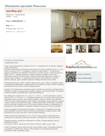 Mieszkanie sprzedaż Piaseczno 515-894-437 Piaseczno, Mazowieckie Polska (map) Price: zł480,000.00 PLN Size: 72 m² Property Type: Apartment Bedrooms: 3 | Bathrooms: 2 Property Description ::DODATKOWY OPIS | Ładne, dobrze zaaranżowane mieszkanie 72,29 m 2 , dwupoziomowe, na zielonym, zadbanym osiedlu w Piasecznie. Na parterze nowocześnie zaaranżowany salon otwarty na kuchnię i jadalnię, 30,23 m 2 , WC z pralnią i suszarnią 2,78 m 2 , przedpokój z wejściem na piętro 8,69m 2 . W salonie duże potrójne, przeszklone drzwi balkonowe skierowane na zachód, prawie w całości otwierane na balkon 1,45 m 2 . Podłoga drewniana, z orzecha włoskiego. W jadalni i kuchni okno skierowane na zachód. W oknach żaluzje. Meble kuchenne białe, lakierowane z blatem w kolorze orzecha włoskiego, w zabudowie sprzęt kuchenny firmy Elektrolux: zmywarka, lodówka, piekarnik, płyta z palnikami gazowymi. Podłoga drewniana orzech włoski. Przedpokój zabudowany: szafki i wieszak z litego drewna, lustra. Wnęka z wieszakami robiona na zamówienie, podświetlana, ze szklaną półką. Drzwi wejściowe w kolorze orzecha włoskiego, antywłamaniowe firmy Dierre z pełnym zabezpieczeniem. Łazienka z WC podwieszanym, umywalką, pralką. Ceramika firmy Keramag z powłoką KeraTec. Zabudowa z koszem na brudną bieliznę, szafką na proszek, marmurowym blatem. Na ścianach kamienna mozaika. Na podłodze gres. Ogrzewanie podłogowe. Na poddaszu trzy sypialnie: 9,91 m 2 , 6,51 m 2 , 6,24 m 2 , z oknami dachowymi i skosami, łazienka 4,06 m 2 , hal 3,87 m 2 . W największej sypialni okno na wschód. Dwie potrójne szafy zabudowane, jedna z lustrem. Dwie mniejsze sypialnie z oknami na zachód. Okna dachowe i rolety firmy Velux. Rolety podwójne: jedna zupełnie zaciemniająca, druga żakardowa. Łazienka z wanną i kabiną prysznicową firmy Huppe, z baterią podtynkową z termostatem, umywalką i WC firmy Keramag z powłoką KeraTec. Na ścianach kamienna mozaika, na podłodze gres. W przedpokoju i trzech sypialniach na podłodze wykładzina welurowa na filcowym podkładzie. Schody prowadzące na drugi poziom drewniane. w kolorze buku. W mieszkaniu pozostaje pełne oświetlenie i karnisze. W salonie możliwość pozostawienia za dopłatą zestawu mebli drewnianych firmy Klose, seria Milo w kolorze orzecha włoskiego. Własne pomieszczenie gospodarcze 1,33 m 2 na tym samym piętrze, naprzeciwko drzwi wejściowych od mieszkania, wykończone panelami i wykładziną PCV w szarej kolorystyce. Ogrzewanie gazowe, regulowane indywidualnie na osiedlu. Telewizja kablowa, Internet, całodobowa ochrona. W czynszu, ok. 380 zł, zawarty jest już fundusz remontowy, opłaty za gaz i wodę. Osiedle ze sklepami, placem zabaw dla dzieci, pełne młodych rodzin. Przyjacielska atmosfera na podwórku. W pobliżu park, bazarek, Tesco, Kaufland, Lidl, przystanki autobusowe, przychodnie, żłobki, przedszkola, szkoły. Scan or Visit For More Information FreeRealEstateSite.com/194883 Mieszkanie było projektowane na poziomie budowy przez projektanta i jest zrobione z dbałością o każdy szczegół oraz rodzaj materiału. Gotowe do wprowadzenia po ewentualnym odmalowaniu ścian. Aneta: 606 272 980; www.sadurscy.com ::DODATKOWE INFORMACJE | Rodzaj budynku: nowe budownictwo | Parking strzeżony (odległość w metrach) [m]: 150,00 | Dozór budynku: Ochroniarz - osiedle strzeżone | Głośność: ciche | Plac zabaw: TAK | Widok: park/skwer | Gaz: tak - miejski | Woda: tak - miejska | Dojazd: asfalt | Otoczenie: działki zabudowane | Ogrzewanie: własne dla budynku | Linie telefoniczne: TAK | Internet: TAK | Telewizja kablowa: TAK | Komunikacja publ.: autobus | Winda: NIE | Rozkład: rozkładowe | Usytuowanie: dwustronne | Drzwi antywłamaniowe: TAK | Teren ogrodzony: TAK | Opłaty wg liczników: prąd, gaz, woda ciepła i zimna | Rodzaj mieszkania: dwupoziomowe | Piwnica [m2]: 1,33 | Stan lokalu: bardzo dobry | Okna: nowe PCV | Instalacje: nowa | Balkon: mały | Ilość balkonów: 1 | Powierzchnia balkonów/tarasów [m2]: 1,45 | Powierzchnia użytkowa [m2]: 72,29 | Rok budowy: 2000 | Ilość pokoi: 4 | Wysokość pomieszczeń [m]: 2,65 | Ilość sypialni: 3 | Powierzchnia pokoi [m2]: 30,23; 9,91; 6,51; 6,24 | Security: Building's custody: bodyguard - guarded housing estate ,break-prooven ... Year Built: 2000 Floors: 4