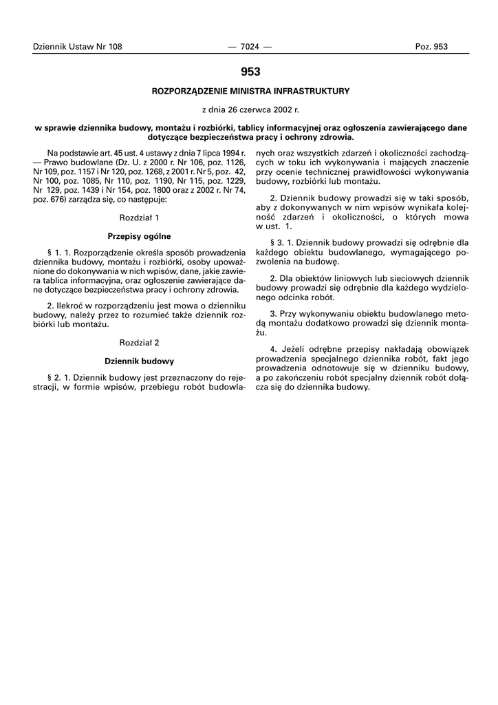 Dziennik Ustaw Nr 108 — 7024 — Poz. 953 953 ROZPORZÑDZENIE MINISTRA INFRASTRUKTURY z dnia 26 czerwca 2002 r. w sprawie dziennika budowy, monta˝u i rozbiórki, tablicy informacyjnej oraz og∏oszenia zawierajàcego dane dotyczàce bezpieczeƒstwa pracy i ochrony zdrowia. Na podstawie art. 45 ust. 4 ustawy z dnia 7 lipca 1994 r. — Prawo budowlane (Dz. U. z 2000 r. Nr 106, poz. 1126, Nr 109, poz. 1157 i Nr 120, poz. 1268, z 2001 r. Nr 5, poz. 42, Nr 100, poz. 1085, Nr 110, poz. 1190, Nr 115, poz. 1229, Nr 129, poz. 1439 i Nr 154, poz. 1800 oraz z 2002 r. Nr 74, poz. 676) zarzàdza si´, co nast´puje: Rozdzia∏ 1 Przepisy ogólne § 1. 1. Rozporzàdzenie okreÊla sposób prowadzenia dziennika budowy, monta˝u i rozbiórki, osoby upowa˝nione do dokonywania w nich wpisów, dane, jakie zawiera tablica informacyjna, oraz og∏oszenie zawierajàce dane dotyczàce bezpieczeƒstwa pracy i ochrony zdrowia. 2. Ilekroç w rozporzàdzeniu jest mowa o dzienniku budowy, nale˝y przez to rozumieç tak˝e dziennik rozbiórki lub monta˝u. Rozdzia∏ 2 Dziennik budowy § 2. 1. Dziennik budowy jest przeznaczony do rejestracji, w formie wpisów, przebiegu robót budowla- nych oraz wszystkich zdarzeƒ i okolicznoÊci zachodzàcych w toku ich wykonywania i majàcych znaczenie przy ocenie technicznej prawid∏owoÊci wykonywania budowy, rozbiórki lub monta˝u. 2. Dziennik budowy prowadzi si´ w taki sposób, aby z dokonywanych w nim wpisów wynika∏a kolejnoÊç zdarzeƒ i okolicznoÊci, o których mowa w ust. 1. § 3. 1. Dziennik budowy prowadzi si´ odr´bnie dla ka˝dego obiektu budowlanego, wymagajàcego pozwolenia na budow´. 2. Dla obiektów liniowych lub sieciowych dziennik budowy prowadzi si´ odr´bnie dla ka˝dego wydzielonego odcinka robót. 3. Przy wykonywaniu obiektu budowlanego metodà monta˝u dodatkowo prowadzi si´ dziennik monta˝u. 4. Je˝eli odr´bne przepisy nak∏adajà obowiàzek prowadzenia specjalnego dziennika robót, fakt jego prowadzenia odnotowuje si´ w dzienniku budowy, a po zakoƒczeniu robót specjalny dziennik robót do∏àcza si´ do dziennika budowy. Dziennik Ustaw Nr 108 — 7025 — § 4. 1. Inwestor, sk∏adajàc zawiadomienie o zamiarze rozpocz´cia robót budowlanych lub wznowienia robót budowlanych, wyst´puje do w∏aÊciwego organu o wydanie dziennika budowy. 2. Organ, o którym mowa w ust. 1, wydaje dziennik budowy w terminie 3 dni od dnia, w którym decyzja o pozwoleniu na budow´ sta∏a si´ ostateczna, za zwrotem kosztów zwiàzanych z jego przygotowaniem. § 5. 1. Dziennik budowy ma format A-4, ponumerowane strony i jest zabezpieczony przed zdekompletowaniem. Strony dziennika budowy przeznaczone do wpisów sà podwójne — orygina∏ i kopia z perforacjà umo˝liwiajàcà ∏atwe jej wyrywanie. 2. Na poszczególne strony dziennika budowy organ wydajàcy dziennik nanosi piecz´cie. § 6. 1. Na stronie tytu∏owej dziennika budowy organ, o którym mowa w § 4 ust. 1, zamieszcza numer, dat´ wydania oraz liczb´ stron dziennika, imi´ i nazwisko lub nazw´ (firm´) inwestora, rodzaj i adres budowy, rozbiórki lub monta˝u, numer i dat´ wydania pozwolenia na budow´ oraz pouczenie o sposobie prowadzenia dziennika i odpowiedzialnoÊci okreÊlonej w art. 93 pkt 4 ustawy z dnia 7 lipca 1994 r. — Prawo budowlane. 2. Na pierwszej stronie dziennika budowy inwestor zamieszcza imi´ i nazwisko lub nazw´ (firm´) wykonawcy lub wykonawców oraz osób sprawujàcych kierownictwo budowy i robót budowlanych, nadzór autorski i inwestorski, podajàc ich specjalnoÊci i numery uprawnieƒ budowlanych. Osoby te potwierdzajà podpisem i datà przyj´cie powierzonych im obowiàzków. 3. Kolejne strony dziennika budowy przeznacza si´ na wpisy dotyczàce przebiegu robót budowlanych. Ka˝dy wpis oznacza datà i podpisuje osoba dokonujàca wpisu, z podaniem imienia, nazwiska, wykonywanej funkcji i nazwy jednostki organizacyjnej lub organu, który reprezentuje. 4. Je˝eli w trakcie wykonywania robót budowlanych nast´puje zmiana kierownika budowy, kierownika robót, inspektora nadzoru inwestorskiego lub projektanta sprawujàcego nadzór autorski, w dzienniku budowy dokonuje si´ wpisu okreÊlajàcego stan zaawansowania i zabezpieczenia przekazywanej budowy, rozbiórki lub monta˝u. Wpis ten potwierdza si´ datà i podpisami osoby przekazujàcej i przejmujàcej obowiàzki. Poz. 953 2. W razie koniecznoÊci wprowadzenia poprawek do dokonanych ju˝ wpisów, nale˝y niew∏aÊciwy tekst skreÊliç w sposób umo˝liwiajàcy jego odczytanie i wprowadziç w∏aÊciwà treÊç, z uzasadnieniem wprowadzonej zmiany. SkreÊlenia i poprawki sà dokonywane w formie wpisu do dziennika budowy. 3. Dokonywanie wpisów na odwrocie ponumerowanych stron jest zabronione. § 8. 1. Protoko∏y zwiàzane z budowà lub sporzàdzane w trakcie wykonywania robót budowlanych wpisuje si´ do dziennika budowy. 2. Dopuszcza si´ sporzàdzanie protoko∏ów, o których mowa w ust. 1, na oddzielnych arkuszach. Arkusze te nale˝y do∏àczyç w sposób trwa∏y do orygina∏u dziennika budowy i jego kopii lub zamieÊciç w oddzielnym zbiorze, dokonujàc w dzienniku budowy wpisu o fakcie ich prowadzenia. § 9. 1. Do dokonywania wpisów w dzienniku budowy upowa˝nieni sà: 1) inwestor, 2) inspektor nadzoru inwestorskiego, 3) projektant, 4) kierownik budowy, 5) kierownik robót budowlanych, 6) osoby wykonujàce czynnoÊci geodezyjne na terenie budowy, 7) pracownicy organów nadzoru budowlanego i innych organów uprawnionych do kontroli przestrzegania przepisów na budowie — w ramach dokonywanych czynnoÊci kontrolnych. 2. Osoby, o których mowa w § 6 ust. 5, upowa˝nione sà do dokonywania wpisów w dzienniku budowy w zakresie, o którym mowa w tym przepisie. § 10. Pracownicy organów nadzoru budowlanego potwierdzajà ka˝dorazowo, wpisem do dziennika budowy, swojà obecnoÊç na budowie. § 11. 1. Dziennik budowy znajduje si´ na sta∏e na terenie budowy lub rozbiórki i jest dost´pny dla osób up