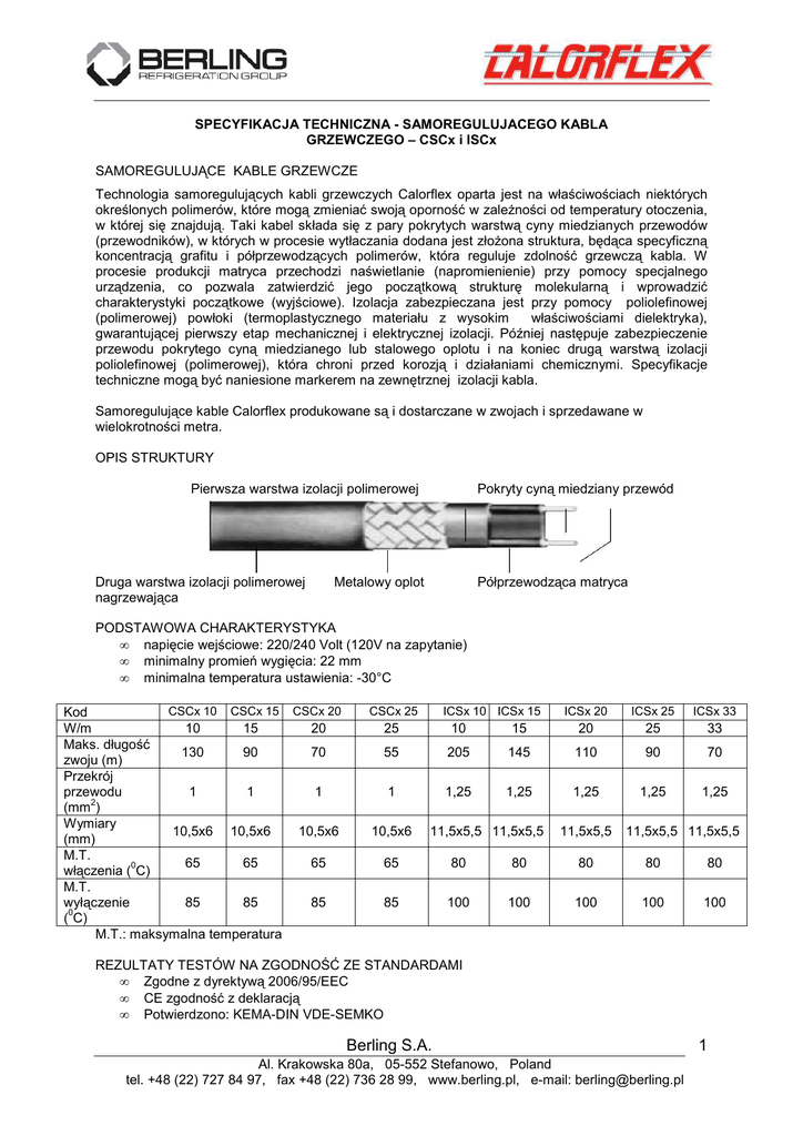 SPECYFIKACJA TECHNICZNA - SAMOREGULUJACEGO KABLA GRZEWCZEGO – CSCx i ISCx SAMOREGULUJĄCE KABLE GRZEWCZE Technologia samoregulujących kabli grzewczych Calorflex oparta jest na właściwościach niektórych określonych polimerów, które mogą zmieniać swoją oporność w zależności od temperatury otoczenia, w której się znajdują. Taki kabel składa się z pary pokrytych warstwą cyny miedzianych przewodów (przewodników), w których w procesie wytłaczania dodana jest złożona struktura, będąca specyficzną koncentracją grafitu i półprzewodzących polimerów, która reguluje zdolność grzewczą kabla. W procesie produkcji matryca przechodzi naświetlanie (napromienienie) przy pomocy specjalnego urządzenia, co pozwala zatwierdzić jego początkową strukturę molekularną i wprowadzić charakterystyki początkowe (wyjściowe). Izolacja zabezpieczana jest przy pomocy poliolefinowej (polimerowej) powłoki (termoplastycznego materiału z wysokim właściwościami dielektryka), gwarantującej pierwszy etap mechanicznej i elektrycznej izolacji. Później następuje zabezpieczenie przewodu pokrytego cyną miedzianego lub stalowego oplotu i na koniec drugą warstwą izolacji poliolefinowej (polimerowej), która chroni przed korozją i działaniami chemicznymi. Specyfikacje techniczne mogą być naniesione markerem na zewnętrznej izolacji kabla. Samoregulujące kable Calorflex produkowane są i dostarczane w zwojach i sprzedawane w wielokrotności metra. OPIS STRUKTURY Pierwsza warstwa izolacji polimerowej Druga warstwa izolacji polimerowej nagrzewająca Pokryty cyną miedziany przewód Metalowy oplot Półprzewodząca matryca PODSTAWOWA CHARAKTERYSTYKA • napięcie wejściowe: 220/240 Volt (120V na zapytanie) • minimalny promień wygięcia: 22 mm • minimalna temperatura ustawienia: -30°C CSCx 10 CSCx 15 CSCx 20 Kod W/m 10 15 20 Maks. długość 130 90 70 zwoju (m) Przekrój przewodu 1 1 1 2 (mm ) Wymiary 10,5x6 10,5x6 10,5x6 (mm) M.T. 65 65 65 0 włączenia ( C) M.T. wyłączenie 85 85 85 0 ( C) M.T.: maksymalna temperatura CSCx 25 ICSx 20 ICSx 25 ICSx 33 25 10 15 20 25 33 55 205 145 110 90 70 1 1,25 1,25 1,25 1,25 1,25 10,5x6 ICSx 10 ICSx 15 11,5x5,5 11,5x5,5 11,5x5,5 11,5x5,5 11,5x5,5 65 80 80 80 80 80 85 100 100 100 100 100 REZULTATY TESTÓW NA ZGODNOŚĆ ZE STANDARDAMI • Zgodne z dyrektywą 2006/95/EEC • CE zgodność z deklaracją • Potwierdzono: KEMA-DIN VDE-SEMKO Berling S.A. Al. Krakowska 80a, 05-552 Stefanowo, Poland tel. +48 (22) 727 84 97, fax +48 (22) 736 28 99, www.berling.pl, e-mail: [email protected] 1