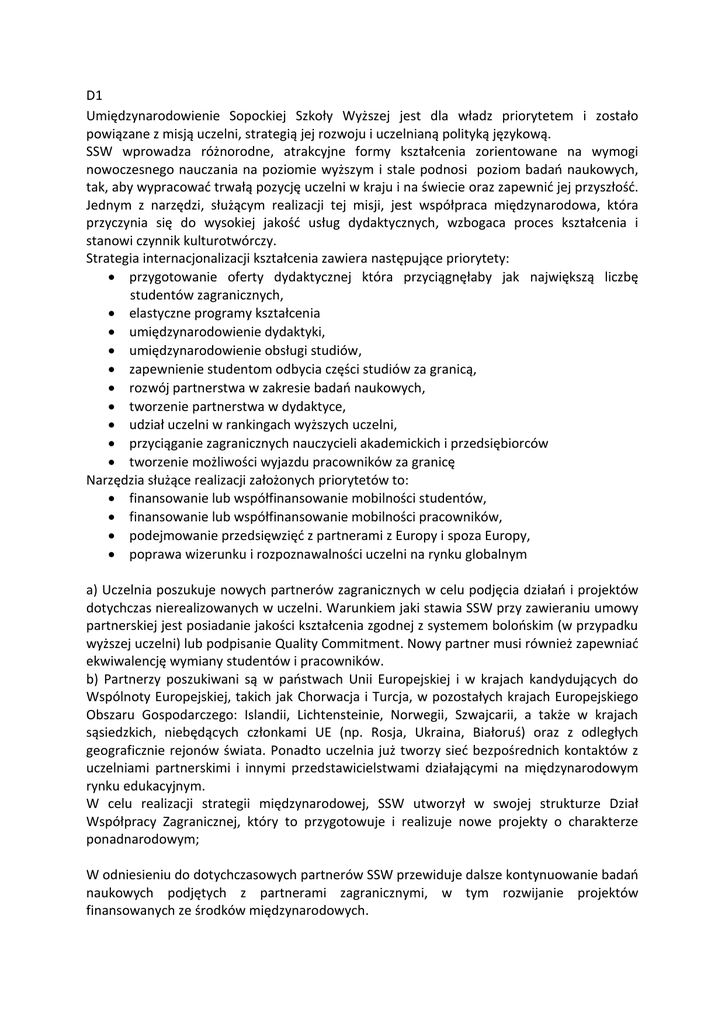 D1 Umiędzynarodowienie Sopockiej Szkoły Wyższej jest dla władz priorytetem i zostało powiązane z misją uczelni, strategią jej rozwoju i uczelnianą polityką językową. SSW wprowadza różnorodne, atrakcyjne formy kształcenia zorientowane na wymogi nowoczesnego nauczania na poziomie wyższym i stale podnosi poziom badań naukowych, tak, aby wypracować trwałą pozycję uczelni w kraju i na świecie oraz zapewnić jej przyszłość. Jednym z narzędzi, służącym realizacji tej misji, jest współpraca międzynarodowa, która przyczynia się do wysokiej jakość usług dydaktycznych, wzbogaca proces kształcenia i stanowi czynnik kulturotwórczy. Strategia internacjonalizacji kształcenia zawiera następujące priorytety:  przygotowanie oferty dydaktycznej która przyciągnęłaby jak największą liczbę studentów zagranicznych,  elastyczne programy kształcenia  umiędzynarodowienie dydaktyki,  umiędzynarodowienie obsługi studiów,  zapewnienie studentom odbycia części studiów za granicą,  rozwój partnerstwa w zakresie badań naukowych,  tworzenie partnerstwa w dydaktyce,  udział uczelni w rankingach wyższych uczelni,  przyciąganie zagranicznych nauczycieli akademickich i przedsiębiorców  tworzenie możliwości wyjazdu pracowników za granicę Narzędzia służące realizacji założonych priorytetów to:  finansowanie lub współfinansowanie mobilności studentów,  finansowanie lub współfinansowanie mobilności pracowników,  podejmowanie przedsięwzięć z partnerami z Europy i spoza Europy,  poprawa wizerunku i rozpoznawalności uczelni na rynku globalnym a) Uczelnia poszukuje nowych partnerów zagranicznych w celu podjęcia działań i projektów dotychczas nierealizowanych w uczelni. Warunkiem jaki stawia SSW przy zawieraniu umowy partnerskiej jest posiadanie jakości kształcenia zgodnej z systemem bolońskim (w przypadku wyższej uczelni) lub podpisanie Quality Commitment. Nowy partner musi również zapewniać ekwiwalencję wymiany studentów i pracowników. b) Partnerzy poszukiwani są w państwach Unii Europejskiej i w krajach kandydujących do Wspólnoty Europejskiej, takich jak Chorwacja i Turcja, w pozostałych krajach Europejskiego Obszaru Gospodarczego: Islandii, Lichtensteinie, Norwegii, Szwajcarii, a także w krajach sąsiedzkich, niebędących członkami UE (np. Rosja, Ukraina, Białoruś) oraz z odległych geograficznie rejonów świata. Ponadto uczelnia już tworzy sieć bezpośrednich kontaktów z uczelniami partnerskimi i innymi przedstawicielstwami działającymi na międzynarodowym rynku edukacyjnym. W celu realizacji strategii międzynarodowej, SSW utworzył w swojej strukturze Dział Współpracy Zagranicznej, który to przygotowuje i realizuje nowe projekty o charakterze ponadnarodowym; W odniesieniu do dotychczasowych partnerów SSW przewiduje dalsze kontynuowanie badań naukowych podjętych z partnerami zagranicznymi, w tym rozwijanie projektów finansowanych ze środków międzynarodowych. c) Celem ogólnym działań mobilnościowych jest umożliwienie: pracownikom podniesienie kwalifikacji zawodowych podczas staży i szkoleń realizowanych za granicą, studentom multiplikowanie efektów kształcenia przez udział w międzynarodowych praktykach i studiach na zagranicznych uczelniach oraz poprzez internacjonalizację procesu kształcenia. Sopocka Szkoła Wyższa wypracowuje model podnoszenia kompetencji zawodowych i językowych studentów, kadry dydaktycznej i administracyjnej z wykorzystaniem mobilności zagranicznej. W ten sposób prowadzone projekty przyczynią się do doskonalenia kwalifikacji kadry dydaktycznej i do podniesienia jakości kształcenia. Celem szczegółowym działań mobilnościowych jest: tworzenie profesjonalnej struktury organizowania wyjazdów zagranicznych dla studentów i pracowników uczelni, uzyskanie znacznego wpływu mobilności na podniesienie znajomość języków obcych, jak również osiągnięcie istotnego oddziaływania mobilności na zdobycie dodatkowych kompetencji zawodowych przez uczestników projektu. Powyższe cele zostaną osiągnięte przez:  rozszerzenie oferty wykładów w językach obcych, w tym wykładów pracowników naukowych z uczelni partnerskich,  zorganizowanie cyklu wykładów prowadzonych przez uznane autorytety zagraniczne,  wydawanie - wspólnie z partnerami zagranicznymi, w ramach podpisanych umów periodyków - monografii w językach obcych,  stworzenie systemu rekrutacji kandydatów na studia z obszaru Europy Wschodniej i z niektórych krajów azjatyckich,  rozszerzenie możliwości odbywania staży naukowych za granicą w uczelniach partnerskich dla młodych pracowników uczelni (staże zagraniczne dla asystentów i adiunktów),  pozyskanie nowych parterów zagranicznych do realizacji programu Erasmus,  stopniowe zwiększanie zatrudnienia wykładowców-obcokrajowców (umiędzynarodowienie kadry naukowo-dydaktycznej),  przygotowanie oferty studiów w formule wspólnego kształcenia z partnerami zagranicznymi (wspólne programy studiów, wspólne kryteria naboru studentów, uznawanie wyników sprawdzania efektów kształcenia, wspólne/podwójne/ dyplomy). D2 Uczelnia w swojej strategii przewiduje organizację i wdrażanie międzynarodowych projektów współpracy w dziedzinie nauczania, kształcenia ustawicznego i szkoleń. Wychodząc z założenia, że otoczeniem dla Sopockiej Szkoły Wyższej jest cała akademicka Europa, uczelnia będzie dążyć do rozwijania współdziałania z uczelniami i sieciami uczelni zarówno z UE jak i z europejskimi szkołami wyższymi spoza Wspólnoty. Wzbogacenie tematyki badawczej, edukacyjnej i podnoszenie prestiżu Uczelni odbędzie się również poprzez wzrost więzi ze środowiskiem pozauczelnianym. Na uczelni tworzone będą zespoły złożone z nauczycieli akademickich, studentów i pracodawców oraz podjęte zostaną działania mające na celu odpowiedzieć na konkretne potrzeby i wyzwania gospodarcze oraz społeczne regionu, ale