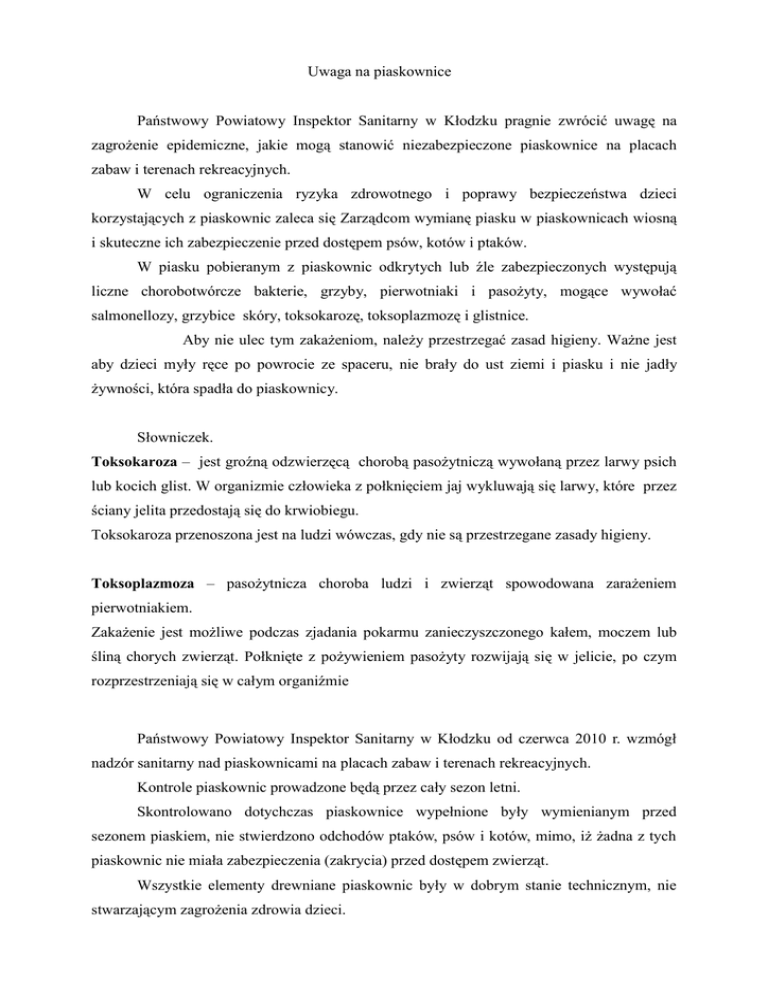 Uwaga na piaskownice Państwowy Powiatowy Inspektor Sanitarny w Kłodzku pragnie zwrócić uwagę na zagrożenie epidemiczne, jakie mogą stanowić niezabezpieczone piaskownice na placach zabaw i terenach rekreacyjnych. W celu ograniczenia ryzyka zdrowotnego i poprawy bezpieczeństwa dzieci korzystających z piaskownic zaleca się Zarządcom wymianę piasku w piaskownicach wiosną i skuteczne ich zabezpieczenie przed dostępem psów, kotów i ptaków. W piasku pobieranym z piaskownic odkrytych lub źle zabezpieczonych występują liczne chorobotwórcze bakterie, grzyby, pierwotniaki i pasożyty, mogące wywołać salmonellozy, grzybice skóry, toksokarozę, toksoplazmozę i glistnice. Aby nie ulec tym zakażeniom, należy przestrzegać zasad higieny. Ważne jest aby dzieci myły ręce po powrocie ze spaceru, nie brały do ust ziemi i piasku i nie jadły żywności, która spadła do piaskownicy. Słowniczek. Toksokaroza – jest groźną odzwierzęcą chorobą pasożytniczą wywołaną przez larwy psich lub kocich glist. W organizmie człowieka z połknięciem jaj wykluwają się larwy, które przez ściany jelita przedostają się do krwiobiegu. Toksokaroza przenoszona jest na ludzi wówczas, gdy nie są przestrzegane zasady higieny. Toksoplazmoza – pasożytnicza choroba ludzi i zwierząt spowodowana zarażeniem pierwotniakiem. Zakażenie jest możliwe podczas zjadania pokarmu zanieczyszczonego kałem, moczem lub śliną chorych zwierząt. Połknięte z pożywieniem pasożyty rozwijają się w jelicie, po czym rozprzestrzeniają się w całym organiźmie Państwowy Powiatowy Inspektor Sanitarny w Kłodzku od czerwca 2010 r. wzmógł nadzór sanitarny nad piaskownicami na placach zabaw i terenach rekreacyjnych. Kontrole piaskownic prowadzone będą przez cały sezon letni. Skontrolowano dotychczas piaskownice wypełnione były wymienianym przed sezonem piaskiem, nie stwierdzono odchodów ptaków, psów i kotów, mimo, iż żadna z tych piaskownic nie miała zabezpieczenia (zakrycia) przed dostępem zwierząt. Wszystkie elementy drewniane piaskownic były w dobrym stanie technicznym, nie stwarzającym zagrożenia zdrowia dzieci.