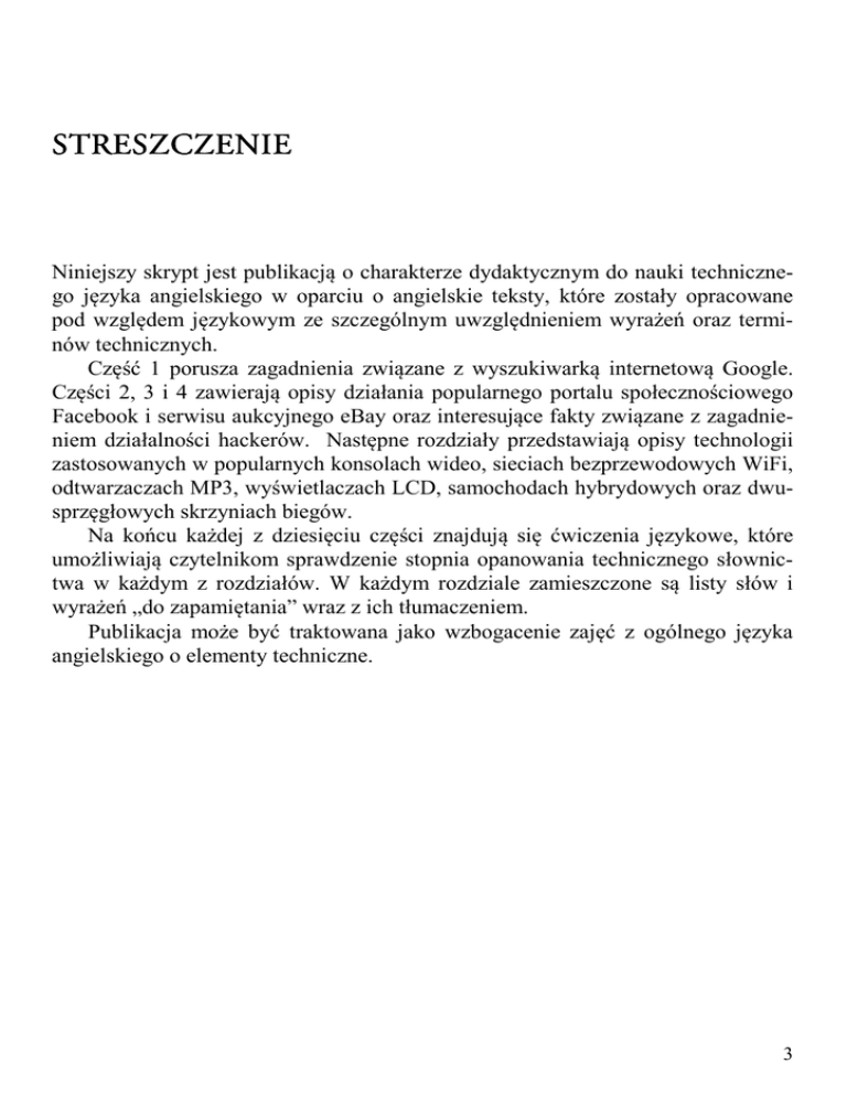 STRESZCZENIE Niniejszy skrypt jest publikacją o charakterze dydaktycznym do nauki technicznego języka angielskiego w oparciu o angielskie teksty, które zostały opracowane pod względem językowym ze szczególnym uwzględnieniem wyrażeń oraz terminów technicznych. Część 1 porusza zagadnienia związane z wyszukiwarką internetową Google. Części 2, 3 i 4 zawierają opisy działania popularnego portalu społecznościowego Facebook i serwisu aukcyjnego eBay oraz interesujące fakty związane z zagadnieniem działalności hackerów. Następne rozdziały przedstawiają opisy technologii zastosowanych w popularnych konsolach wideo, sieciach bezprzewodowych WiFi, odtwarzaczach MP3, wyświetlaczach LCD, samochodach hybrydowych oraz dwusprzęgłowych skrzyniach biegów. Na końcu każdej z dziesięciu części znajdują się ćwiczenia językowe, które umożliwiają czytelnikom sprawdzenie stopnia opanowania technicznego słownictwa w każdym z rozdziałów. W każdym rozdziale zamieszczone są listy słów i wyrażeń „do zapamiętania” wraz z ich tłumaczeniem. Publikacja może być traktowana jako wzbogacenie zajęć z ogólnego języka angielskiego o elementy techniczne. 3 ABSTRACT The book can be used to teach English technical vocabulary on the basis of authentic texts which have been linguistically adapted for teaching purposes. The popular search engine Google is the topic of Chapter 1. Chapters 2, 3 and 4 include descriptions of how the social networking site Facebook and the online auction site EBay work as well as certain interesting facts concerning the activities of hackers. The following chapters shed some light on the technologies applied in popular video consoles, WiFi wireless devices, MP3 players, LCD monitors, hybrid cars and dual-clutch transmissions. Each chapter includes glossaries of words and expressions to remember and technical vocabulary exercises. 4