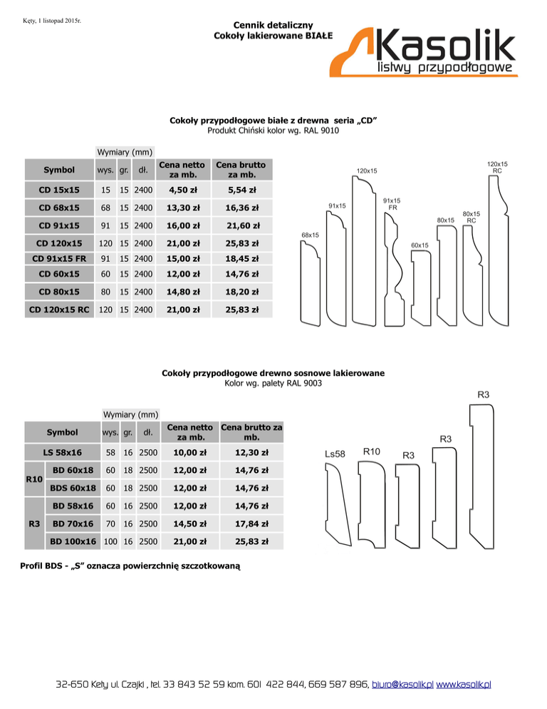 Kęty, 1 listopad 2015r. Cennik detaliczny Cokoły lakierowane BIAŁE Cokoły przypodłogowe białe z drewna seria „CD” Produkt Chiński kolor wg. RAL 9010 Wymiary (mm) Symbol CD 15x15 CD 68x15 CD 91x15 CD 120x15 wys. gr. 15 68 91 dł. 15 2400 15 2400 15 2400 Cena netto za mb. Cena brutto za mb. 4,50 zł 5,54 zł 13,30 zł 16,00 zł 120x15 91x15 FR 91x15 16,36 zł 80x15 21,60 zł 120 15 2400 21,00 zł 25,83 zł CD 91x15 FR 91 15 2400 15,00 zł 18,45 zł CD 60x15 60 15 2400 12,00 zł 14,76 zł CD 80x15 80 15 2400 14,80 zł 18,20 zł 120 15 2400 21,00 zł 25,83 zł CD 120x15 RC 120x15 RC 80x15 RC 68x15 60x15 Cokoły przypodłogowe drewno sosnowe lakierowane Kolor wg. palety RAL 9003 R3 Wymiary (mm) Symbol LS 58x16 R10 R3 wys. gr. dł. Cena netto Cena brutto za za mb. mb. 58 16 2500 10,00 zł 12,30 zł BD 60x18 60 18 2500 12,00 zł 14,76 zł BDS 60x18 60 18 2500 12,00 zł 14,76 zł BD 58x16 60 16 2500 12,00 zł 14,76 zł BD 70x16 70 16 2500 14,50 zł 17,84 zł BD 100x16 100 16 2500 21,00 zł 25,83 zł R3 Ls58 R10 R3 Profil BDS - „S” oznacza powierzchnię szczotkowaną 32-650 Kety ul. Czajki , tel. 33 843 52 59 kom. 601 422 844, 669 587 896, [email protected] www.kasolik.pl Cokoły przypodłogowe białe z MDF'u W standardzie tył listwy zabezpieczony przed wilgocią. Wymiary (mm) Symbol R3 KOLOR STANDARD RAL 9003 Cena netto za mb. wys. gr. dł. 70x12 70 12 2600 10,50 zł 80x12 80 12 2600 11,00 zł 100x12 100 12 2600 11,50 zł 60x16 60 16 2600 10,50 zł 80x16 80 16 2600 11,30 zł 100x16 100 16 2600 12,50 zł 60x18 60 18 2600 11,00 zł R10 80x18 80 18 2600 11,50 zł 100x18 100 18 2600 14,00 zł R25 80x16 80 16 2600 12,40 zł RS 80x16 80 16 2600 12,50 zł RF 80x18 80 18 2600 14,00 zł 80x16 80 16 2600 12,50 zł 80x12 80 12 2600 11,00 zł 80x16 80 16 2600 12,50 zł 80x12 80 12 2600 11,00 zł 80x18 80 18 2600 15,00 zł 100x18 100 18 2600 16,00 zł 120x18 120 18 2600 18,50 zł F1 F2 F3 F4 Cena za kolor RAL lub NCS zależna od wielkości zamówienia 2,6-20,8 mb. + 200zł netto 23,4-52 mb. Powyżej 106,6 54,6-104 mb. mb. +6 zł/mb. +5 zł/mb. +4 zł/mb. +8 zł/mb. +7 zł/mb. +5 zł/mb. +6 zł/mb. +5 zł/mb. +4 zł/mb. +8 zł/mb. +7 zł/mb. +5 zł/mb. +6 zł/mb. +5 zł/mb. +4 zł/mb. +8 zł/mb. +7 zł/mb. +5 zł/mb. +6 zł/mb. +5 zł/mb. +4 zł/mb. +8 zł/mb. +7 zł/mb. +5 zł/mb. (koszt wykonania zamówienia bez względu na ilość mb.) Termin realizacji listwy w kolorach RAL i NCS od 7-15 dni roboczych. Wymagana zaliczka 40% wartości zamówienia. F4 F3 R10 R25 RS RF F1 F2 R3 32-650 Kety ul. Czajki , tel. 33 843 52 59 kom. 601 422 844, 669 587 896, [email protected] www.kasolik.pl