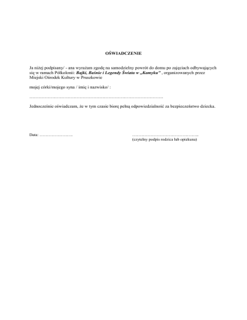 OŚWIADCZENIE Ja niżej podpisany/ - ana wyrażam zgodę na samodzielny powrót do domu po zajęciach odbywających się w ramach Półkolonii: Bajki, Baśnie i Legendy Świata w ,,Kamyku” , organizowanych przez Miejski Ośrodek Kultury w Pruszkowie mojej córki/mojego syna / imię i nazwisko/ : ……………………………………………………………………………. Jednocześnie oświadczam, że w tym czasie biorę pełną odpowiedzialność za bezpieczeństwo dziecka. Data: …………………. …………………………………….. (czytelny podpis rodzica lub opiekuna)