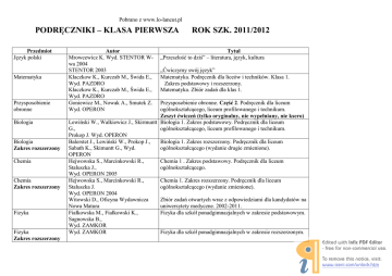 Pobrano z www.lo-lancut.pl PODRĘCZNIKI – KLASA PIERWSZA Przedmiot Język polski Matematyka Przysposobienie obronne Biologia Biologia Zakres rozszerzony Chemia Chemia Zakres rozszerzony Fizyka Fizyka Zakres rozszerzony Autor Mrowcewicz K. Wyd. STENTOR Wwa 2004 STENTOR 2003 Kłaczkow K., Kurczab M., Świda E., Wyd. PAZDRO Kłaczkow K., Kurczab M., Świda E., Wyd. PAZDRO Goniewicz M., Nowak A., Smutek Z. Wyd. OPERON ROK SZK. 2011/2012 Tytuł „Przeszłość to dziś” – literatura, język, kultura „Ćwiczymy swój język” Matematyka. Podręcznik dla liceów i techników. Klasa 1. Zakres podstawowy i rozszerzony. Matematyka. Zbiór zadań dla klas 1. Przysposobienie obronne. Część 2. Podręcznik dla liceum ogólnokształcącego, liceum profilowanego i technikum. Zeszyt ćwiczeń (tylko oryginalny, nie wypełniany, nie ksero) Lewiński W., Walkiewicz J., Skirmuntt Biologia 1. Zakres podstawowy. Podręcznik dla liceum G., ogólnokształcącego, liceum profilowanego i technikum. Prokop J. Wyd. OPERON Balerstet J., Lewiński W., Prokop J., Biologia 1. Zakres rozszerzony. Podręcznik dla liceum Sabath K., Skimuntt G., Wyd. ogólnokształcącego (wydanie drugie zmienione). OPERON Hejwowska S., Marcinkowski R., Chemia 1 . Zakres podstawowy. Podręcznik dla liceum Staluszka J., ogólnokształcącego. Wyd. OPERON 2005 Hejwowska S., Marcinkowski R., Chemia 1. Zakres rozszerzony. Podręcznik dla liceum Staluszka J. ogólnokształcącego (wydanie zmienione). Wyd. OPERON 2004 Witowski D., Oficyna Wydawnicza Zbiór zadań otwartych wraz z odpowiedziami dla kandydatów na Nowa Matura uniwersytety medyczne. 2002-2011. Fiałkowska M., Fiałkowski K., Fizyka dla szkół ponadgimnazjalnych w zakresie podstawowym. Sagnowska B., Wyd. ZAMKOR Wyd. ZAMKOR Fizyka dla szkół ponadgimnazjalnych w zakresie rozszerzonym. `Ìi`ÊÜÌ ÊvÝÊ*Ê`ÌÀÊ ÊvÀiiÊvÀÊViÀV>ÊÕÃi° /ÊÀiÛiÊÌ ÃÊÌVi]ÊÛÃÌ\Ê ÜÜܰVi°VÉÕV° Ì Pobrano z www.lo-lancut.pl Historia Burda B., Halczak B., Józefiak R. M., Szymczak M., Wyd. OPERON Historia Zakres rozszerzony Burda B., Halczak B., Józefiak R. M., Szymczak M. Wyd. OPERON Burda B., Halczak B., Józefiak R. M., Szymczak M Wyd. OPERON Burda B., Halczak B., Józefiak R. M., Szymczak M Wyd. OPERON Język angielski Historia 1. Część II. Średniowiecze. Zakres podstawowy. Podręcznik dla liceum ogólnokształcącego, liceum profilowane i technikum. Wydanie zmienione. Od dziejów najdawniejszych do schyłku starożytności. Historia 1, cz. I. Zakres podstawowy. Podręcznik dla liceum ogólnokształcącego, liceum profilowanego i technikum. Średniowiecze. Historia 1, cz. II. Zakres rozszerzony. Podręcznik dla liceum ogólnokształcącego. Od czasów najdawniejszych do schyłku starożytności. Historia 1, cz. 1. Zakres rozszerzony. Podręcznik dal liceum ogólnokształcącego. Wybór poziomu uzależniony jest od wyników testu wstępnego przyporządkowującego do odpowiedniej grupy zaawansowania. Salla T., Paul A.Davies, Wieruszewska Poziom podstawowy: M. Matura Solutions pre-intermediate Wyd. OXFORD 2007 Matura Solutions intermediate Poziom rozszerzony: Virginia Evans, Jenny Dooley Upstream Intermediate Express Publishing 2002 Upstream Upper-intermediate UWAGA !!! Prosimy o nie dokonywanie zakupu książek do j. angielskiego przed przeprowadzeniem testu przyporządkowującego do odpowiedniej grupy zaawansowania Pobrano z www.lo-lancut.pl Język niemiecki Wąsik Z., Łuniewska K., Tworek U., Zagórna M. WSiP 2006 wydanie zmienione i uzupełnione M.Wiatr-Kmieciak, S.Wujec „Alles Klar” cz. 1a, 1b Język francuski Menand, Capelle HACHETTE LIVRE 2003 Le Nouveau TAXI! 1 – podręczniki Le Nouveau TAXI! 1 – zeszyty ćwiczeń Podstawy przedsiębiorczości Belka M. (red.) Wyd. Fundacja Młodzieżowej Przedsiębiorczości Majchrowski Z., Mrowcewicz K., Sitarski P., Szwarcman D. Wyd. STENTOR Smutek Z., Maleska J., Surmacz B. Wyd. OPERON Ekonomia stosowana. Podręcznik do podstaw przedsiębiorczości dla liceów ogólnokształcących, liceów profilowanych i techników. (wydanie II uaktualnione) Człowiek – twórca kultury. Podręcznik dla liceum ogólnokształcącego, liceum profilowanego i technikum. Zakres podstawowy i rozszerzony. Wiedza o społeczeństwie 1. Zakres podstawowy. Podręcznik dla liceum ogólnokształcącego, liceum profilowanego i technikum. Smutek Z., Maleska J., Surmacz B. Wyd. OPERON Wiedza o społeczeństwie 1. Część 1. Część 2. Zakres rozszerzony. Podręcznik dla liceum ogólnokształcącego. Krawczyński, Talaga wyd. PWN Technologia informacyjna nie tylko dla uczniów. Kop J., Kucharska M., Szkurłat E., Wyd. PWN Kop J., Kucharska M., Szkurłat E., Wyd. PWN Red. S. Łabendowicz Geografia. Część 1. Zakres podstawowy. Język rosyjski Wiedza o kulturze Wiedza o społeczeństwie Wiedza o społeczeństwie Zakres rozszerzony Technologia informacyjna Geografia Geografia Zakres rozszerzony Religia „Bom u ... 1” – wydawnictwo PWN, podręcznik + zeszyt ćwiczeń. Geografia. Część 1. Zakres rozszerzony. Świadectwo wiary `Ìi`ÊÜÌ ÊvÝÊ*Ê`ÌÀÊ ÊvÀiiÊvÀÊViÀV>ÊÕÃi° /ÊÀiÛiÊÌ ÃÊÌVi]ÊÛÃÌ\Ê ÜÜܰVi°VÉÕV° Ì