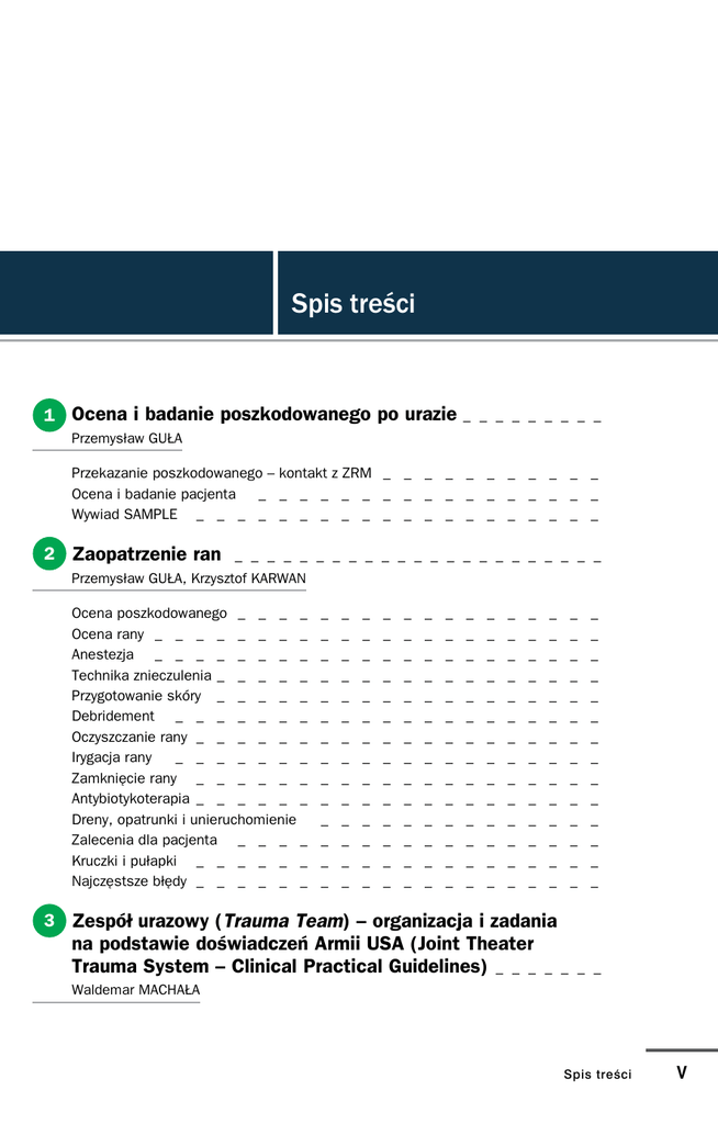 Spis treści 1 Ocena i badanie poszkodowanego po urazie _ _ _ _ _ _ _ _ _ Przemysław Guła Przekazanie poszkodowanego – kontakt z ZRM _ _ _ _ _ _ _ _ _ _ _ Ocena i badanie pacjenta _ _ _ _ _ _ _ _ _ _ _ _ _ _ _ _ _ Wywiad SAMPLE _ _ _ _ _ _ _ _ _ _ _ _ _ _ _ _ _ _ _ _ 2 Zaopatrzenie ran _ _ _ _ _ _ _ _ _ _ _ _ _ _ _ _ _ _ _ _ _ _ _ _ Przemysław Guła, Krzysztof Karwan Ocena poszkodowanego _ _ _ _ _ Ocena rany _ _ _ _ _ _ _ _ _ Anestezja _ _ _ _ _ _ _ _ _ Technika znieczulenia _ _ _ _ _ _ Przygotowanie skóry _ _ _ _ _ _ Debridement _ _ _ _ _ _ _ _ Oczyszczanie rany _ _ _ _ _ _ _ Irygacja rany _ _ _ _ _ _ _ _ Zamknięcie rany _ _ _ _ _ _ _ Antybiotykoterapia _ _ _ _ _ _ _ Dreny, opatrunki i unieruchomienie _ Zalecenia dla pacjenta _ _ _ _ _ Kruczki i pułapki _ _ _ _ _ _ _ Najczęstsze błędy _ _ _ _ _ _ _ _ _ _ _ _ _ _ _ _ _ _ _ _ _ _ _ _ _ _ _ _ _ _ _ _ _ _ _ _ _ _ _ _ _ _ _ _ _ _ _ _ _ _ _ _ _ _ _ _ _ _ _ _ _ _ _ _ _ _ _ _ _ _ _ _ _ _ _ _ _ _ _ _ _ _ _ _ _ _ _ _ _ _ _ _ _ _ _ _ _ _ _ _ _ _ _ _ _ _ _ _ _ _ _ _ _ _ _ _ _ _ _ _ _ _ _ _ _ _ _ _ _ _ _ _ _ _ _ _ _ _ _ _ _ _ _ _ _ _ _ _ _ _ _ _ _ _ _ _ _ _ _ _ _ _ _ _ _ _ _ _ _ _ _ _ _ _ _ _ _ _ _ _ _ _ _ _ _ _ _ _ _ 3 Zespół urazowy (Trauma Team) – organizacja i zadania na podstawie doświadczeń Armii USA (Joint Theater Trauma System – Clinical Practical Guidelines) _ _ _ _ _ _ _ Waldemar Machała Spis treści V 4 Triage szpitalny – segregacja rannych i chorych w szpitalnym oddziale ratunkowym (SOR) _ _ _ _ _ _ _ _ _ _ Waldemar Machała Segregacja na miejscu zdarzenia – triage przedszpitalny _ _ Segregacja w szpitalnym oddziale ratunkowym (SOR) _ _ _ 5 _ _ _ _ _ _ _ _ Damage control – doraźne tymczasowe opanowanie bezpośrednich zagrożeń _ _ _ _ _ _ _ _ _ _ _ _ _ _ _ _ _ _ _ _ _ _ _ Leszek Brongel Damage control w obrażeniach jamy brzusznej _ _ _ _ Damage control w obrażeniach klatki piersiowej_ _ _ Damage control w złamaniach miednicy _ _ _ _ _ _ Damage control w obrażeniach czaszkowo-mózgowych. Abbreviated craniotomy _ _ _ _ _ _ _ _ _ _ _ Radiologia interwencyjna w ciężkich obrażeniach _ _ _ Doraźna stabilizacja złamań kości długich _ _ _ _ _ 6 _ _ _ _ _ _ _ _ _ _ _ _ _ _ _ _ _ _ _ _ _ _ _ _ _ _ _ _ _ _ _ _ _ _ _ _ _ _ _ _ _ _ _ Ostateczne przywrócenie drożności dróg oddechowych i wstępne leczenie niewydolności oddechowej _ _ _ _ _ _ _ Waldemar Machała Intubacja w szpitalnym oddziale ratunkowym – wskazania _ _ _ _ _ _ _ _ Trudne drogi oddechowe_ _ _ _ _ _ _ _ _ _ _ _ _ _ _ _ _ _ Czynności związane z udrożnieniem dróg oddechowych _ _ _ _ _ _ _ _ Sytuacje szczególne – konikopunkcja i tracheopunkcja ratunkowa _ _ _ _ _ Zestaw do trudnej intubacji _ _ _ _ _ _ _ _ _ _ _ _ _ _ _ _ _ Wytyczne dotyczące postępowania w trudnej intubacji opracowane przez Sekcję Przyrządowego Udrażniania Dróg Oddechowych (SPUDO) Polskiego Towarzystwa Anestezjologii i Intensywnej Terapii – Andrzej Basiński _ _ _ _ _ _ _ _ _ 7 Dostęp naczyniowy (tryb ratunkowy) _ _ _ _ _ _ _ _ _ _ _ _ Waldemar Machała Dostęp obwodowy i centralny _ _ _ _ _ _ _ _ _ _ _ Charakterystyka kaniul (długość, średnica, przepływ) _ _ _ _ Technika wprowadzenia kaniul _ _ _ _ _ _ _ _ _ _ _ Kaniulacja żył obwodowych (w tym żyły szyjnej zewnętrznej) _ _ Zmiana opatrunku na kaniuli centralnej _ _ _ _ _ _ _ _ Urządzenia do szybkiego przetaczania płynów infuzyjnych i krwi_ Color coding – oznaczanie leków w strzykawkach _ _ _ _ _ Kaniulacja tętnic _ _ _ _ _ _ _ _ _ _ _ _ _ _ _ VI Spis treści _ _ _ _ _ _ _ _ _ _ _ _ _ _ _ _ _ _ _ _ _ _ _ _ _ _ _ _ _ _ _ _ _ _ _ _ _ _ _ _ 8 Przygotowanie i rozcieńczanie leków w SOR _ _ _ _ _ _ _ _ Marta Kwiatoń, Jacek Kleszczyński Drogi podawania leków 9 Wybrane elementy uzupełniania ostrej utraty krwi _ _ _ _ _ Jolanta Korsak Masywna transfuzja – leczenie składnikami krwi _ _ _ _ _ _ _ _ _ _ Procedury postępowania w przypadku masywnej transfuzji u chorych po urazach wielonarządowych _ _ _ _ _ _ _ _ _ _ _ _ _ _ _ _ 10 Elektroterapia _ _ _ _ _ _ _ _ _ _ _ _ _ _ _ _ _ _ _ _ _ _ _ _ Waldemar Machała Defibrylacja _ _ _ _ _ _ _ _ _ _ _ Kardiowersja _ _ _ _ _ _ _ _ _ _ _ Elektryczna stymulacja serca _ _ _ _ _ _ Czynna kompresja – dekompresja (ACD – active compression – dekompression) _ _ _ _ _ _ _ _ _ _ _ _ _ _ _ _ _ _ _ _ _ _ _ _ _ _ _ _ _ _ _ _ _ _ _ _ _ _ _ _ _ _ 11 Pośredni masaż serca _ _ _ _ _ _ _ _ _ _ _ _ _ _ _ _ _ _ _ _ Waldemar Machała Pośredni masaż serca (pompa płucna i pompa sercowa) _ _ Automatyczne urządzenia do pośredniego masażu serca _ _ _ _ _ _ _ _ _ _ _ _ _ _ 12 Leczenie bólu pourazowego w warunkach SOR _ _ _ _ _ _ _ Jerzy Wordliczek, Renata Zajączkowska, Jarosław Woroń Zasady leczenia bólu w SOR _ _ _ _ _ _ _ _ _ _ _ _ _ _ _ _ _ 13 Niewydolność krążenia u chorych po urazie spowodowana: tamponadą serca, stłuczeniem serca i uszkodzeniem dużych naczyń _ _ _ _ _ _ _ _ _ _ _ _ _ _ _ _ _ _ _ _ _ _ _ _ Waldemar Machała Obrażenia serca _ _ _ _ _ _ _ _ _ _ _ _ _ _ _ _ _ _ _ _ Uszkodzenie dużych naczyń _ _ _ _ _ _ _ _ _ _ _ _ _ _ _ _ _ 14 Urazy ośrodkowego układu nerwowego. Postępowanie wczesnoszpitalne _ _ _ _ _ _ _ _ _ _ _ _ _ _ _ Maciej Radek Urazy głowy_ _ _ _ _ _ _ _ _ _ _ _ _ _ _ _ _ _ _ _ _ _ Nadzór nad chorymi po urazach czaszkowo-mózgowych _ _ _ _ _ _ _ _ Leczenie neurochirurgiczne pacjentów z urazami głowy _ _ _ _ _ _ _ _ Spis treści VII Następstwa urazów głowy wymagające postępowania neurochirurgicznego _ _ Zespół ciasnoty wewnątrzczaszkowej _ _ _ _ _ _ _ _ _ _ _ _ _ _ Urazy kręgosłupa i rdzenia kręgowego _ _ _ _ _ _ _ _ _ _ _ _ _ _ Najczęstrze błędy i pułapki _ _ _ _ _ _ _ _ _ _ _ _ _ _ _ _ _ 15 Obrażenia szyi _ _ _ _ _ _ _ _ _ _ _ _ _ _ _ _ _ _ _ _ _ _ _ _ Robert Brzozowski Badania diagnostyczne _ _ _ _ _ _ _ _ _ _ _ _ _ _ _ _ _ _ Dostęp operacyjny i techniki chirurgiczne _ _ _ _ _ _ _ _ _ _ _ _ _ 16 Urazy klatki piersiowej _ _ _ _ _ _ _ _ _ _ _ _ _ _ _ _ _ _ _ _ Robert Brzozowski Ocena wstępna _ _ _ _ _ _ 