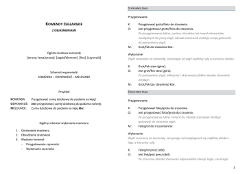 STAWIANIE ŻAGLI Przygotowanie KOMENDY ŻEGLARSKIE Z OBJAŚNIENIAMI K: O: M: Ogólna budowa komendy *strona: lewa/prawa+ *żagiel/element+ *lina+ *czynnośd+ Schemat wypowiedzi KOMENDA – ODPOWIEDŹ – MELDUNEK Wykonanie Żagle stawiamy na komendę, zaczynając od żagli najbliżej rufy w kierunku dziobu. K: O: M: Przykład KOMENDA: Przygotowad cumę dziobową do podania na keję! ODPOWIEDŹ: Jest przygotowad cumę dziobową do podania na keję. MELDUNEK: Cuma dziobowa do podania na keję klar. Ogólny schemat wykonania manewru 1. Omówienie manewru 2. Obsadzenie stanowisk 3. Wydanie komend Przygotowanie czynności Wykonanie czynności Przygotowad grota/foka do stawienia. Jest przygotowad grota/foka do stawienia. Po przygotowaniu fałów, szotów, bloczków lub innych elementów niezbędnych do pracy żagli, obsada stanowisk melduje swoją gotowośd do postawienia żagli: Grot/fok do stawiania klar. Grot/fok staw (góra). Jest grot/fok staw (góra). Po postawieniu żagli, obłożeniu i sklarowaniu fałów obsada stanowisk melduje: Grot/fok (po stawieniu) klar. ZRZUCANIE ŻAGLI Przygotowanie K: O: M: Przygotowad foka/grota do zrzucenia. Jest przygotowad foka/grota do zrzucenia. Po przygotowaniu fałów i innych lin, obsada stanowisk melduje gotowośd do zrzucenia żagli: Fok/grot do zrzucenia klar. Wykonanie Żagle zrzucamy na komendę, zaczynając od znajdujących się najbliżej dziobu i idąc w kierunku rufy. K: O: Fok/grot precz (dół). Jest fok/grot precz (dół). Po zrzuceniu obsada stanowisk odpowiednio klaruje żagle, zwracając 1 uwagę na ich „gaszenie”, tak by nie pracowały na wietrze oraz zabezpieczenie ich przez zanurzeniem w wodzie. M: Po sklarowaniu żagli obsada stanowisk melduje: Fok/grot (po zrzuceniu) klar. WYBIERANIE ŻAGLI Maksymalne wybranie szotów żagla K: O: Prawy/lewy grota/foka szot wybierz. Jest prawy/lewy grota/foka szot wybierz. Optymalne wybranie szotów żagla K: O: Prawy/lewy grota/foka szot wybieraj. Jest prawy/lewy grota/foka szot wybieraj. Zgodnie z ogólna zasadą (wybieramy szot foka ze strony nawietrznej, luzujemy szot foka po stronie zawietrznej) zabezpieczamy żagiel przed niekontrolowanym owinięciem się na sztagu. WYSTAWIENIE ŻAGLA NA WIATR K: O: Fok/grot lewo/prawo na wiatr. Jest fok/grot lewo/prawo na wiatr. K: O: Fok/grot luz. Prawy/lewy foka szot wybieraj. Jest fok/grot luz. Jest prawy/lewy foka/grota szot wybieraj. WIOSŁA Obsada stanowisk: Wybieranie żagli (np. przy ostrzeniu) zaczyna się od żagli tylnych do przednich. Optymalnie wybrany żagiel pracuje na granicy łopotu. LUZOWANIE ŻAGLI Sternik Dwaj wzorowi Wioślarze burtowi Bosakowi prowadzący łódź, na ławce najbliżej rufy – obsługują cumy rufowe, trap, obsługują odbijacze, na pierwszej ławce od dziobu – obsługują bosak, cumę dziobową. Maksymalne zluzowanie szotów żagla K: O: Prawy/lewy foka/grota szot luz. Jest prawy/lewy foka/grota szot luz. Optymalne zluzowanie szotów żagla K: O: Prawy/lewy foka/grota szot luzuj. Jest prawy/lewy foka/grota szot luzuj. Luzowanie żagli (np. przy odpadaniu) zaczyna się od żagli przednich do tylnych. Wiosła wzorowych i bosakowych są ułożone na środku, wzdłuż osi łodzi między wioślarzami, przy czym wiosła wzorowych „patrzą” piórami w stronę dziobu, natomiast dziobowych w stronę rufy. Wiosła burtowych leżą na ławkach burtowych skierowane piórami do dziobu. K: K: PRZERZUCENIA FOKA NA STRONĘ PRZECIWNĄ NIŻ GROT („NA MOTYLA”) K: O: Lewy/prawy foka szot wybieraj. Prawy/lewy foka szot luzuj. Jest lewy/prawy foka szot wybieraj. Jest prawy/lewy foka szot luzuj. K: Obsada do łodzi. Obsada zajmuje wyznaczone stanowiska, kolejno: dziobowi, burtowi, wzorowi, sternik. Wiosła chwyd. Przygotowanie dulek, burtowi i wzorowi wynoszą wiosła i ustawiają je prostopadle do burt, na płasko, równolegle do wody. Wiosła! Wzorowi i burtowi wkładają wiosła do dulek. W trakcie wiosłowania komenda kooczy wiosłowanie. Komenda poprzedza również każdą zmianę 2 K: K: K: K: K: K: K: K: K: K: K: wiosłowania: Wiosła obie/lewa/prawa naprzód/wstecz. Wiosła lewa/prawa naprzód, prawa/lewa wstecz. Wiosła lewa/prawa wstecz, prawa/lewa naprzód. Wiosła obie/lewa/prawa hamuj. Wiosła spław. Wioślarze wynoszą wiosła całkowicie poza burtę i trzymają je wewnętrzną ręką. Wiosła płyną wzdłuż burt obrócone piórami ku rufie. Wiosła skród. Wioślarze krzyżują ręce i przesuwają wiosła w dulkach aż do oparcia ich rękojeści o przeciwną burtę. Wiosła na wiatr. Wioślarze ustawiają wiosła piórami prostopadle do wody w celu wykorzystania wiatru wiejącego od rufy. Wiosła na pych. Wioślarze wstają z ławek i spychają łódź z mielizny opierając wiosła o dno. Wiosła wzwyż (salut). Wioślarze podnoszą wisła stawiając je rękojeściami na dnie łodzi, trzymają wiosło ręką zewnętrzną na wysokości barku, a drugą na wysokości kolan, pióra równolegle do diametralnej łodzi. Wiosła basta. Wioślarze składają wiosła na ławkach. Obsada z łodzi. Bosakowi podają cumę dziobową, wioślarze zabezpieczają burtę odbijaczami, obsada opuszcza sklarowaną łódź w kolejności odwrotnej do: Obsada do łodzi. STER, STERNIK Komendy na ster definiują utrzymanie płetwy sterowej w żądanym położeniu, aż do chwili podania następnej komendy. K: O: K: O: K: O: K: O: K: O: Ster lewo/prawo. Wychylenie płetwy sterowej o ok. 25 - 40° na wskazaną burtę. Jest ster lewo/prawo. Ster lekko lewo/prawo. Wychylenie płetwy sterowej o ok. 10 - 15° na wskazaną burtę. Jest ster lekko lewo/prawo. Ster bardziej (mniej) prawo/lewo. Zmiana wychylenia płetwy sterowej o ok. 5° w stosunku do dotychczasowego położenia. Jest ster bardziej (mniej) prawo/lewo. Ster lewo/prawo na burt. Maksymalne wychylenie płetwy sterowej na wskazaną burtę. Jest ster lewo /prawo na burt. Rozkaz dla sternika; wychylenie płetwy sterowej, tj. spowodowanie określonej zmiany kursu jachtu. K: O: Sternik ta