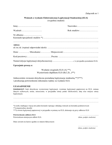 Załącznik nr 1 Wniosek o wydanie Elektronicznej Legitymacji Studenckiej (ELS) (wypełnia student) Imię:…………………………. Nazwisko:………………………. Wydział:……………………… Rok studiów:…………………… Nr albumu:…………………… Kierunek/specjalność studiów *) ………………………………………………………………. …………………………………………………………………………………………………... Adres: ul./os./al. (wpisać odpowiedni skrót): ………………………………………………………….. Dom: ………….. Mieszkanie:…………. Miejscowość:……………………………………….. Kod pocztowy:………….. ………………Poczta: …………………………………………….. Numer/edycja legitymacji dotychczasowej:………………………..( w przypadku posiadania ELS) Uprzejmie proszę o: Wydanie oryginału ELS (A) **) Wystawienie duplikatu ELS (B,C,D,..)**) Jednocześnie zwracam dotychczas posiadaną legitymację studencką **)***) i przekazuję potwierdzenie dokonania wpłaty za wydanie ELS. UZASADNIENIE (zaznaczyć: brak dotychczas wystawionej legitymacji, wymiana legitymacji papierowej na ELS, zmiana danych osobowych, utrata, zniszczenie; w przypadku utraty podać okoliczności, datę oraz miejsce utraty legitymacji). …………………………………………………………………………………………………………………......... ………………………………………………………………………………………………………………………. *) osoby studiujące więcej niż jeden kierunek wpisują i składają wniosek na kierunku podstawowym **) niepotrzebne skreślić ***) zwrotu legitymacji papierowej w przypadku wymiany na ELS, dokonuje się przy odbiorze ELS Potwierdzenie odbioru ELS Potwierdzam niniejszym odbiór ELS. ……………………........ (data, podpis studenta) Dane zawarte na karcie zgodne ze stanem faktycznym: ………………………….. (data, podpis studenta) Załącznik nr 2 …………………......., dn…….20…r. ( miejsce wystawienia) …………………………………………………………… ( imię i nazwisko studenta, nr albumu) …………………………………………………………… …………………………………………………………… …………………………………………………………… (wydział, kierunek/specjalność studiów, rok studiów, stopień i system studiów) OŚWIADCZENIE O ODPOWIEDZIALNOŚCI ZA ZBYCIE LUB UDOSTĘPNIENIE LEGITYMACJI STUDENCKIEJ Przyjmuję do wiadomości zakaz zbywania oraz udostępniania w jakiejkolwiek formie legitymacji studenckiej osobom trzecim, który zagrożony jest w każdym przypadku odpowiedzialnością dyscyplinarną na zasadach określonych w art. 211 i nast. ustawy z dnia 27 lipca 2005 r. – Prawo o szkolnictwie wyższym ( Dz. U. Nr 64, poz. 1365 ze zm.). Nadto zbycie własnej lun cudzej legitymacji studenckiej podlega odpowiedzialności karnej na podstawie art. 274 ustawy z dnia 6 czerwca 1997 r. Kodeks Karny ( Dz. U Nr 88 poz. 553 ze zm.) i zagrożone jest karą grzywny, ograniczenia wolności albo kary pozbawienia wolności do lat 2. Jednocześnie oświadczam, że w przypadku szkody powstałej w wyniku zbycia lub udostępnienia legitymacji w jakiejkolwiek formie osobom trzecim, zobowiązuję się do pokrycia tej szkody zasadach przepisami kodeksu cywilnego. ………………………………………….. (podpis studenta)