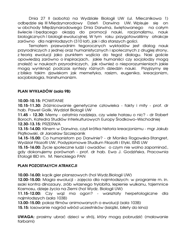 Dnia 27 II (sobota) na Wydziale Biologii UW (ul. Miecznikowa 1) odbędzie się III Międzynarodowy Dzień Darwina UW. Wpisuje się on w obchody Międzynarodowego Dnia Darwina, świętowanego na całym świecie i będącego okazją do promocji nauki, racjonalizmu, nauk biologicznych I biologii ewolucyjnej. W tym roku przygotowaliśmy atrakcje zarówno dla najmłodszych (310 lat), jak i dla starszych gości. Tematem przewodnim tegorocznych wykładów jest dialog nauk przyrodniczych z jednej oraz humanistycznych i społecznych z drugiej strony, z teorią ewolucji jako punktem wyjścia do tegoż dialogu. Nasi goście opowiedzą zarówno o inspiracjach, jakie humaniści czy socjolodzy mogą znaleźć w naukach przyrodniczych, jak również o nieporozumieniach jakie mogą wyniknąć podczas syntezy różnych dziedzin nauki. Przyjrzymy się z bliska takim zjawiskom jak memetyka, rasizm, eugenika, kreacjonizm, socjobiologia, transhumanizm. PLAN WYKŁADÓW (sala 9B) 10.0010.15: POWITANIE 10.1511.30: Zróżnicowanie genetyczne człowieka  fakty i mity  prof. dr hab. Paweł Golik, Wydział Biologii UW 11.45  12.30: Memy  ostatnia nadzieja, czy wiele hałasu o nic?  dr Robert Boroch, Katedra Studiów Interkulturowych Europy Środkowo–Wschodniej 12.3013.15: PRZERWA 13.1514.00: Klinem w Darwina, czyli krótka historia kreacjonizmu  mgr Jakub Piątkowski, dr Jarosław Szczepanik 14.1515.00: Co humanistom po Darwinie?  dr Monika RogowskaStangret, Wydział Filozofii UW, Podyplomowe Studium Filozofii i Etyki, ISNS UW 15.1516.00: Życie społeczne ludzi i owadów: o czym nie wolno zapominać, gdy dokonujemy porównań  prof. dr hab. Ewa J. Godzińska, Pracownia Etologii IBD im. M. Nenckiego PAN PLAN POZOSTAŁYCH ATRAKCJI 10.0016.00: kącik gier planszowych (hol Wydz.Biologii UW) 12.0015.00: Magia ewolucji  zajęcia dla najmłodszych: w programie m. in. ssaki kontra dinozaury, zrób własnego trylobita, lepienie wulkanu, tajemnice Kosmosu, dzieje życia na Ziemi (hol Wydz. Biologii UW) 11.1512.00: Czy wąż ma ogon?  warsztaty herpetologiczne dla najmłodszych (sala 103B) 13.0015.00: pokaz filmów animowanych o ewolucji (sala 103B) 15.15: losowanie nagród wśród uczestników (książki, bilety do kina) UWAGA: prosimy ubrać dzieci w strój, który mogą pobrudzić (malowanie farbami)