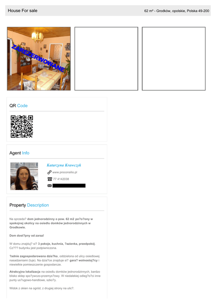 House For sale 62 m² - Grodków, opolskie, Polska 49-200 QR Code Agent Info Katarzyna Krawczyk www.proconsilio.pl 77 4142038 Property Description Na sprzeda? dom jednorodzinny o pow. 62 m2 po?o?ony w spokojnej okolicy na osiedlu domków jednorodzinnych w Grodkowie. Dom dost?pny od zaraz! W domu znajduj? si? 3 pokoje, kuchnia, ?azienka, przedpokój . Cz??? budynku jest podpiwniczona. ?adnie zagospodarowana dzia?ka, oddzielona od ulicy osiedlowej nasadzeniami (tuje). Na dzia?ce znajduje si? gara? wolnostoj?cy i niewielkie pomieszczenie gospodarcze. Atrakcyjna lokalizacja na osiedlu domków jednorodzinnych, bardzo blisko sklep spo?ywczo-przemys?owy. W niedalekiej odleg?o?ci inne punty us?ugowo-handlowe, szko?y. Widok z okien na ogród, z drugiej strony na ulic?. Media: woda, kanalizacja, pr?d, gaz (piecyk 2-funkcyjny- ogrzewanie domu i ogrzewanie wody). W ci?gu ostatnich 3 lat zosta?a zmodernizowana instalacja centralnego ogrzewania (w tym nowe grzejniki, nowy piecyk gazowy 2-funkcyjny). Features Heating system Garden Dom na sprzeda? w stanie widocznym na zdj?ciach, wi?kszo?? mebli zostaje na wyposa?eniu. Basement Fence View Cena 150000 z?- do negocjacji!! Zadzwo? i podaj swoj? cen?!! Zapraszamy na bezp?atn? prezentacj?! Kitchen Storage room Parking 1 Furnished Je?li potrzebujesz kredytu na zakup nieruchomo?ci umów si? z naszym doradc? kredytowym, który bezp?atnie zweryfikuje Twoj? zdolno?? kredytow?. Tel. 77 414 20 38. Uwaga: Informacje dotycz?ce opisu nieruchomo?ci podane s? przez w?a?ciciela, maj? charakter wy??cznie informacyjny i mog? podlega? aktualizacji. Oferta dotycz?ca nieruchomo?ci stanowi zaproszenie do rokowa? zgodnie z art. 71 Kodeksu Cywilnego i nie stanowi oferty okre?lonej w art. 66 i nast?pnych KC. Basic Details Property type : House Offer Type : For sale Offer ID : 1109 Price : 150,000 PLN View : Garden Bedrooms : 2 Rooms : 3 Bathrooms : 1 Usable area : 62 m² Year built : 1970 Total area : 62 m² Address Map Country : Polska Province : opolskie Town : Grodków Zip code : 49-200 Neighborhood Shopping center 30 Minutes City center 10 Minutes Hospital 20 Minutes Police station 10 Minutes Train station 20 Minutes Bus stop 5 Minutes Airport 40 Minutes Coffee shop 10 Minutes Cinema 15 Minutes Park 10 Minutes School 10 Minutes