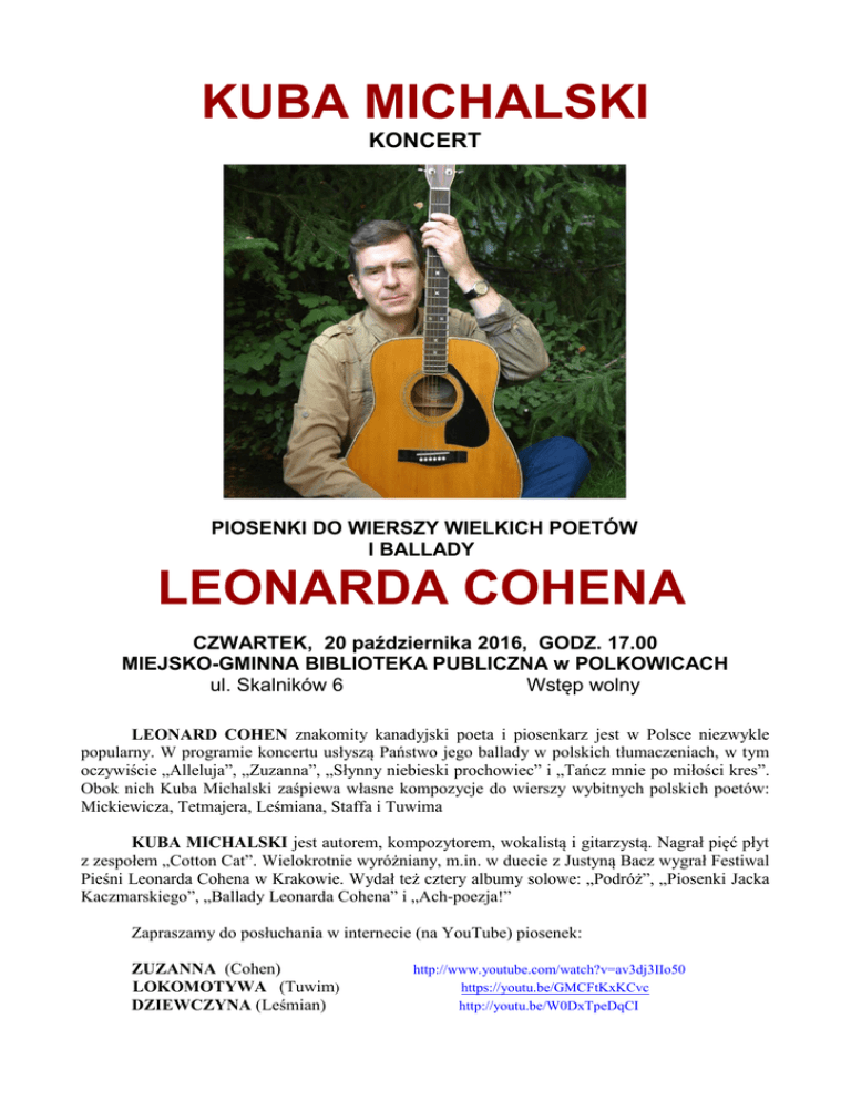 KUBA MICHALSKI KONCERT PIOSENKI DO WIERSZY WIELKICH POETÓW I BALLADY LEONARDA COHENA CZWARTEK, 20 października 2016, GODZ. 17.00 MIEJSKO-GMINNA BIBLIOTEKA PUBLICZNA w POLKOWICACH ul. Skalników 6 Wstęp wolny LEONARD COHEN znakomity kanadyjski poeta i piosenkarz jest w Polsce niezwykle popularny. W programie koncertu usłyszą Państwo jego ballady w polskich tłumaczeniach, w tym oczywiście „Alleluja”, „Zuzanna”, „Słynny niebieski prochowiec” i „Tańcz mnie po miłości kres”. Obok nich Kuba Michalski zaśpiewa własne kompozycje do wierszy wybitnych polskich poetów: Mickiewicza, Tetmajera, Leśmiana, Staffa i Tuwima KUBA MICHALSKI jest autorem, kompozytorem, wokalistą i gitarzystą. Nagrał pięć płyt z zespołem „Cotton Cat”. Wielokrotnie wyróżniany, m.in. w duecie z Justyną Bacz wygrał Festiwal Pieśni Leonarda Cohena w Krakowie. Wydał też cztery albumy solowe: „Podróż”, „Piosenki Jacka Kaczmarskiego”, „Ballady Leonarda Cohena” i „Ach-poezja!” Zapraszamy do posłuchania w internecie (na YouTube) piosenek: ZUZANNA (Cohen) LOKOMOTYWA (Tuwim) DZIEWCZYNA (Leśmian) http://www.youtube.com/watch?v=av3dj3IIo50 https://youtu.be/GMCFtKxKCvc http://youtu.be/W0DxTpeDqCI