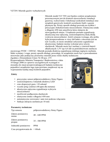 VZ7291 Miernik gazów wybuchowych Miernik model VZ 7291 jest bardzo czułym urządzeniem przeznaczonym jest do kontroli nieszczelności instalacji gazowej, wykrywania i lokalizacji uszkodzeń instalacji oraz urządzeń gazowych, kontroli szczelności butli z gazem płynnym itp. Prosty sposób obsługi pozwala na szybkie i precyzyjne zlokalizowanie nieszczelności. Elastyczna sonda o długości 450 mm umożliwia łatwe dotarcie do niewygodnych miejsc. Urządzenie posiada sygnalizację akustyczną oraz optyczną, sześciostopniową skalę diodą wykrycia nieszczelności. Jeżeli sytuacja wymaga, aby próba była przeprowadzona w ciszy lub hałas z otoczenia jest na tyle wysoki, że może utrudniać usłyszenie sygnalizacji akustycznej, badanie można wykonać przy użyciu słuchawek. Miernik może być zasilany z czterech baterii alkalicznych 1,5V typ AA lub za pośrednictwem zasilacza sieciowego 9VDC / 230VAC. Miernik posiada diodową sygnalizację niskiego napięcia zasilania. Małe wymiary i waga, prosty sposób obsługi, powodują, że urządzenie może być z powodzeniem stosowane jako podręczny przenośny miernik przez różne służby techniczne. Zgodnie z Dziennikiem Ustaw Nr 40 poz. 275 Rozporządzenie Ministra Transportu i Budownictwa z dnia 10 lutego 2006 (w sprawie szczegółowych wymagań w stosunku do stacji przeprowadzających badania techniczne pojazdów) urządzenie tego typu powinno znajdować się na wyposażeniu każdej stacji kontroli pojazdów. Zalety • • • • • • • • • precyzyjny sensor półprzewodnikowy firmy Figaro sześciostopniowy wskaźnik diodowy LED czas ekspozycji gazu <10 sekund wysoki próg czułości (40 ppm dla metanu) akustyczno-optyczna sygnalizacja wykrycia nieszczelności możliwość podłączenia słuchawek elastyczna sonda o długości 450 mm automatyczne zerowanie i auto test podczas włączania funkcja odcięcia zasilania po 10 min Parametry techniczne Typ sensora półprzewodnikowy firmy Figaro Zakres pomiarowy metan 40 - 640 PPM Zakres pomiarowy propan 35 - 580 PPM Jednostki pomiarowe PPM Czas przygotowania do < 60sek pracy Czas ekspozycji gazu Warunki pracy Zakres temperatur < 10sek. -5 ~ +45 °C Zakres wilgotności 5 - 99 RH (bez kondensacji) Warunki przechowywania Zakres temperatur -10 ~ +50 °C (bez baterii) Zakres wilgotności Zasilanie Bateria 5 - 99 RH (bez kondensacji) Zasilacz sieciowy 9V DC / 230VAC 4x1,5V DC baterie alkaliczne, typ AA Wyłącznik zasilania po 10 minutach Parametry mechaniczne Wskaźniki 6 diod LED Sygnalizacja wykrycia diodowa i akustyczna nieszczelności Wymiary miernika 175 x 70 x 38 mm (dł. x szer. x wys.) Waga 340g (z bateriami) Gniazdo typu Jack do podłączenia słuchawek Wyposażenie 4 baterie, plastikowa walizka, instrukcja w języku polskim Komp. elektromagnetyczna znak CE