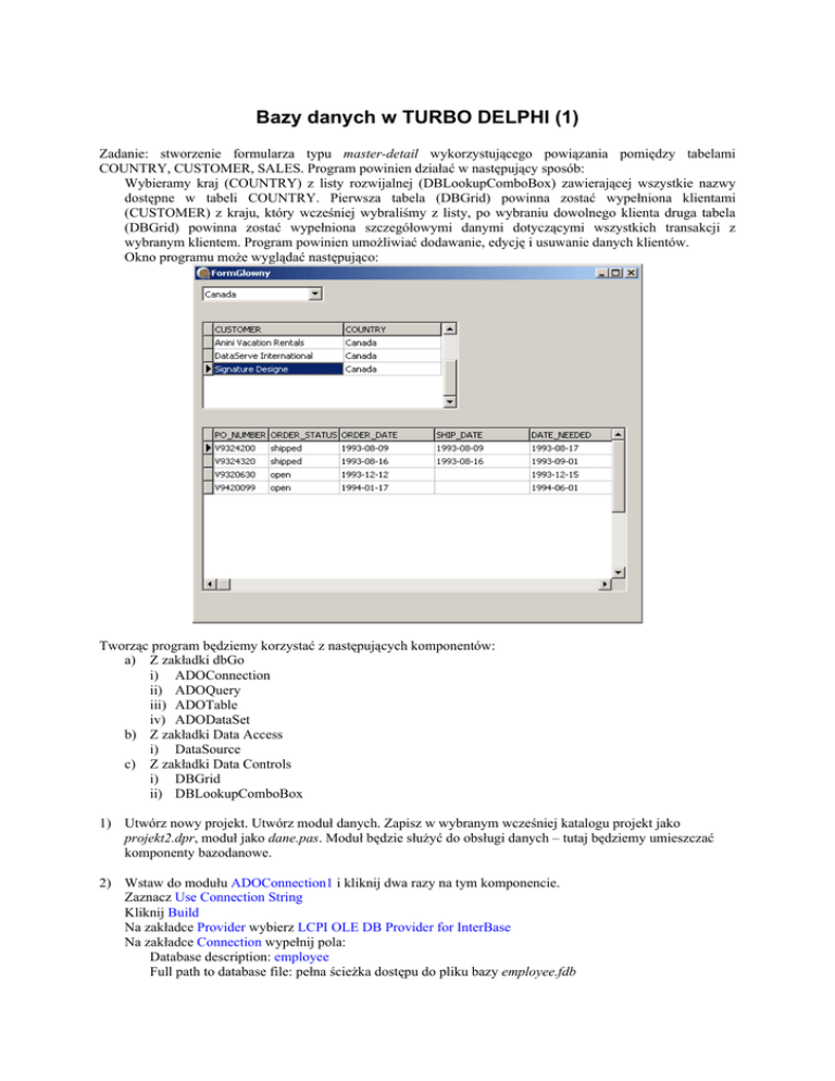 Bazy danych w TURBO DELPHI (1) Zadanie: stworzenie formularza typu master-detail wykorzystującego powiązania pomiędzy tabelami COUNTRY, CUSTOMER, SALES. Program powinien działać w następujący sposób: Wybieramy kraj (COUNTRY) z listy rozwijalnej (DBLookupComboBox) zawierającej wszystkie nazwy dostępne w tabeli COUNTRY. Pierwsza tabela (DBGrid) powinna zostać wypełniona klientami (CUSTOMER) z kraju, który wcześniej wybraliśmy z listy, po wybraniu dowolnego klienta druga tabela (DBGrid) powinna zostać wypełniona szczegółowymi danymi dotyczącymi wszystkich transakcji z wybranym klientem. Program powinien umożliwiać dodawanie, edycję i usuwanie danych klientów. Okno programu może wyglądać następująco: Tworząc program będziemy korzystać z następujących komponentów: a) Z zakładki dbGo i) ADOConnection ii) ADOQuery iii) ADOTable iv) ADODataSet b) Z zakładki Data Access i) DataSource c) Z zakładki Data Controls i) DBGrid ii) DBLookupComboBox 1) Utwórz nowy projekt. Utwórz moduł danych. Zapisz w wybranym wcześniej katalogu projekt jako projekt2.dpr, moduł jako dane.pas. Moduł będzie służyć do obsługi danych – tutaj będziemy umieszczać komponenty bazodanowe. 2) Wstaw do modułu ADOConnection1 i kliknij dwa razy na tym komponencie. Zaznacz Use Connection String Kliknij Build Na zakładce Provider wybierz LCPI OLE DB Provider for InterBase Na zakładce Connection wypełnij pola: Database description: employee Full path to database file: pełna ścieżka dostępu do pliku bazy employee.fdb User: SYSDBA Password: masterkey Zaznacz Save password Zaznacz Enable automatic transaction Na zakładce Advanced wypełnij pola: Database Client: Firebird 2.0 Dynamic library: pełna ścieżka dostępu do pliku fbclient.dll Przejdź na zakładkę Connection i sprawdź połączenie - kliknij Test connection. Zamknij okno właściwości łącza danych. Ustaw kolejne własności w komponencie ADOConnection1: Własność LoginPrompt ustaw na FALSE Własność Connected ustaw na TRUE 3) Wstaw do modułu ADOQuery1 Dla własności Connection wybierz ADOConnection1 Dla własności SQL: select COUNTRY from COUNTRY order by COUNTRY Ustaw własność Active na TRUE 4) Wstaw do modułu DataSource1 Dla własności DataSet wybierz ADOQuery1 5) Utwórz nową formatkę. Zapisz jako glowny.pas. Ustaw własność Name formatki na FormGlowny. 6) Z menu File wybierz Use Unit - dane. 7) Wrzuć na formatkę DBLookupComboBox1 Dla własności ListSource wybierz DataModule1.DataSource1 Dla własności KeyField wybierz COUNTRY 8) Wstaw do modułu ADODataSet1 Dla własności Connection wybierz ADOConnection1 Dla własności Command Text: select CUSTOMER, COUNTRY, CUST_NO from CUSTOMER WHERE COUNTRY=:kraj Ustaw własność Active na TRUE 9) Wstaw do modułu DataSource2 Dla własności DataSet wybierz ADODataSet1 10) Wrzuć na formatkę DBGrid1 Dla własności DataSource wybierz DataModule1.DataSource2 wybierz kolumny które mają się wyświetlać CUSTOMER, COUNTRY i kolumnę która będzie ukryta CUST_NO, klikając na wielokropek przy własności Columns, (lub dwukrotnie kliknij na komponent DBGrid1), a następnie wybierz wszystkie kolumny przyciskiem Add All Files (ewentualnie usuń te, których nie potrzebujesz). Następnie ustaw własności pozostałych kolumn, klikając na nazwę kolumny. Dla kolumny CUST_NO ustaw własność Visible na false, dla pozostałych kolumn na true. 11) Dla DBLookupComboBox1 i zdarzenia OnClick niech wykonuje się: with DataModule1.ADODataSet1 do begin Close; Parameters[0].Value:=DBLookupComboBox1.Text; Open; end; 12) Sprawdź, czy ustawiłeś własności Active dla ADOConnection1, ADOQuery1, ADODataSet na TRUE. 13) Uruchom program i sprawdź, jak działa. Po zamknięciu programu: 14) Ustaw własność Connected w ADOConnection1 na FALSE 15) Wrzuć do modułu ADOTable1 Dla własności Connection wybierz ADOConnection1 Dla własności MasterSource wybierz DataSource2 Dla własności TableName wpisz SALES Klikając na wielokropku własności MasterFields zdefiniuj zależność CUST_NO=CUST_NO. Ustaw własność Active na TRUE 16) Wrzuć do modułu DataSource3 Dla własności DataSet wybierz ADOTable1 17) Wrzuć na formatkę DBGrid2 Dla własności DataSource wybierz DataModule1.DataSource3 Wybierz kolumny, które mają się wyświetlać. 18) W wyniku powyższych działań powinniśmy otrzymać okno przypominające to na rysunku: