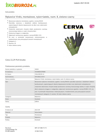 Izabelin 2017-03-04 Karta produktu: Rękawice Virdis, montażowe, nylon+lateks, rozm. 8, zielono-czarny Bezszwowe rękawice montażowe, zgodne z normą EN420 Wyściółka nylonowa z dodatkiem włókien bambusowych, zapewniających idealne dopasowanie do dłoni oraz właściwości antyseptyczne Znakomite właściwości chwytne dzięki powleczeniu warstwą marszczonego lateksu w części chwytnej dłoni Elastyczny ściągacz w nadgarstku Odporność mechaniczna zgodnie z normą EN388: 2131 Do prac: w przemyśle maszynowym, motoryzacyjnym, w budownictwie, przy precyzyjnych pracach montażowych Kategoria: II Rozmiar: 10 Kolor zielono-czarny Cena 22,29 PLN brutto Podstawowe parametry produktu Numer produktu w systemie 18444 Nr dostawcy V0108004299080 Nr Celcen 2346-00150-14 Kod kreskowy 8591806114333 Nazwa produktu Rękawice Virdis, montażowe, nylon+lateks, rozm. 8, zielono-czarny Opis Bezszwowe rękawice montażowe, zgodne z normą EN420; wyściółka nylonowa z dodatkiem włókien bambusowych, zapewniających idealne dopasowanie do dłoni oraz właściwości antyseptyczne; znakomite właściwości chwytne dzięki powleczeniu warstwą marszczonego lateksu w części chwytnej dłoni; elastyczny ściągacz w nadgarstku; odporność mechaniczna zgodnie z normą EN388: 2131; do prac: w przemyśle maszynowym, motoryzacyjnym, w budownictwie, przy precyzyjnych pracach montażowych; kategoria: II; rozmiar: 10; kolor zielono-czarny Kategoria Rękawice Klasa Standard Marka CERVA Cecha W ofercie od 2013-09 Materiał Nylon/lateks Typ Montażowe Produkt Rękawice Rodzaj Standard Eko biuro ul Krasińskiego 23a 05-080 Izabelin NIP: 527-000-75-75 22 864 54 84 Izabelin 2017-03-04 Karta katalogowa produktu cd. Rękawice Virdis, montażowe, nylon+lateks, rozm. 8, zielono-czarny Kolor Kolor Zielony/czarny Wspólny słownik zamówień CPV 18141000-9 Certyfikaty Hit Hit Nowy produkt w ofercie Standard Wymiary Rozmiar 8 Pozostałe zdjęcia produktu Serdecznie zapraszamy do współpracy Eko biuro zespół. Eko biuro ul Krasińskiego 23a 05-080 Izabelin NIP: 527-000-75-75 22 864 54 84