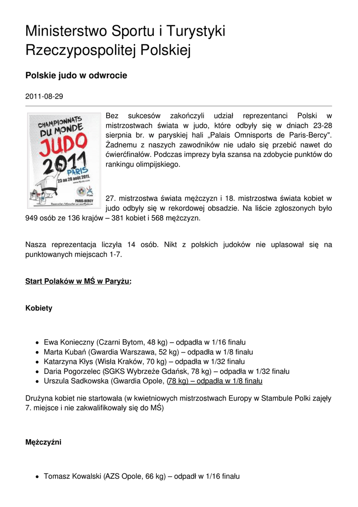 Ministerstwo Sportu i Turystyki Rzeczypospolitej Polskiej Polskie judo w odwrocie 2011-08-29 Bez sukcesów zakończyli udział reprezentanci Polski w mistrzostwach świata w judo, które odbyły się w dniach 23-28 sierpnia br. w paryskiej hali „Palais Omnisports de Paris-Bercy". Żadnemu z naszych zawodników nie udało się przebić nawet do ćwierćfinałów. Podczas imprezy była szansa na zdobycie punktów do rankingu olimpijskiego. 27. mistrzostwa świata mężczyzn i 18. mistrzostwa świata kobiet w judo odbyły się w rekordowej obsadzie. Na liście zgłoszonych było 949 osób ze 136 krajów – 381 kobiet i 568 mężczyzn. Nasza reprezentacja liczyła 14 osób. Nikt z polskich judoków nie uplasował się na punktowanych miejscach 1-7. Start Polaków w MŚ w Paryżu: Kobiety Ewa Konieczny (Czarni Bytom, 48 kg) – odpadła w 1/16 finału Marta Kubań (Gwardia Warszawa, 52 kg) – odpadła w 1/8 finału Katarzyna Kłys (Wisła Kraków, 70 kg) – odpadła w 1/32 finału Daria Pogorzelec (SGKS Wybrzeże Gdańsk, 78 kg) – odpadła w 1/32 finału Urszula Sadkowska (Gwardia Opole, (78 kg) – odpadła w 1/8 finału Drużyna kobiet nie startowała (w kwietniowych mistrzostwach Europy w Stambule Polki zajęły 7. miejsce i nie zakwalifikowały się do MŚ) Mężczyźni Tomasz Kowalski (AZS Opole, 66 kg) – odpadł w 1/16 finału Paweł Zagrodnik (Czarni Bytom, 66 kg) – odpadł w 1/32 finału Tomasz Adamiec (UKJ Ryś Warszawa, 73 kg) – odpadł w 1/8 finału Krzysztof Wiłkomirski (AZS UW Warszawa, 73 kg) – odpadł w 1/32 finału Robert Krawczyk (Czarni Bytom, 90 kg) – odpadł w 1/32 finału Krzysztof Węglarz (Wisła Kraków, 90 kg) – odpadł w 1/16 finału Przemysław Matyjaszek (Czarni Bytom, 100 kg) – odpadł w 1/32 finału Grzegorz Eitel (Gwardia Warszawa, +100 kg) – odpadł w 1/8 finału drużyna – odpadła w 1/8 finału (Polacy przegrali już w 1. rundzie z Francuzami 1:4 i odpadli z rywalizacji) Klasyfikacja medalowa: 1. Francja 6 złotych – 0 srebrnych – 1 brązowy;RAZEM: 7 2. Japonia 5 złotych – 7 srebrnych – 5 brązowych; RAZEM: 17 3. Chiny 1 złoty – 1 srebrny – 0 brązowych;RAZEM: 2 4. Korea Płd. 1 złoty – 0 srebrnych – 3 brązowe; RAZEM: 4 Rosja 1 złoty – 0 srebrnych – 3 brązowe; RAZEM: 4 6. Uzbekistan 1 złoty – 0 srebrnych – 1 brązowy;RAZEM: 2 7. Grecja 1 złoty – 0 srebrnych – 0 brązowych;RAZEM: 1 8. Brazylia 0 złotych – 3 srebrne – 3 brązowe; RAZEM: 6 9. Holandia 0 złotych – 2 srebrne – 1 brązowy;RAZEM: 3 10. Niemcy 0 złotych – 1 srebrny – 1 brązowy;RAZEM: 2 Sklasyfikowano 22 kraje. Przed rokiem, w mistrzostwach świata, które odbyły się w Tokio, najlepiej spisała się Urszula Sadkowska (78 kg), która zajęła 7. miejsce. W historii mistrzostw świata, reprezentanci Polski wywalczyli 30 medali (6+3+21). Ostatnim Polakiem, który stanął na podium MŚ jest Grzegorz Eitel – trzy lata temu we Francji sięgnął po brąz w open. W innych kategoriach wówczas nie rywalizowano. W pozostałych wagach biało-czerwoni czekają na medal od 2003 roku. W Osace brązowy krążek wywalczył wówczas Robert Krawczyk – 81 kg. 1 maja 2012 roku zostanie ogłoszony światowy ranking IJF (98 kobiet + 154 mężczyzn) i światowy ranking IJF z podziałem na kontynenty (Europa ma 25 miejsc: 11 kobiet + 14 mężczyzn), na podstawie którego wyłonieni zostaną prawie wszyscy uczestnicy Igrzysk XXX Olimpiady (w Londynie weźmie udział 386 judoków, w tym 231 mężczyzn i 155 kobiet). Gospodarz Igrzysk XXX Olimpiady, czyli Brytyjczycy mają zagwarantowanych 14 miejsc (7 kobiet + 7 mężczyzn). Trójstronna Komisja Kwalifikacyjna ma do dyspozycji 20 miejsc bez względu na płeć z zachowaniem zasady jeden zawodnik z jednego kraju. Dany kraj może reprezentować tylko jedna osoba w każdej kategorii wagowej (7 + 7). Miejsca Polaków w światowym rankingu IJF na dzień 25 sierpnia 2011 Kobiety (na Igrzyska XXX Olimpiady pojedzie 14 najwyżej sklasyfikowanych zawodniczek w każdej z siedmiu kategorii): 48 kg: 55. miejsce Ewa Konieczny 52 kg: 39. miejsce: Marta Kubań 57 kg: 72. miejsce: Małgorzata Bielak 63 kg: 81. miejsce: Paulina Węglarz 70 kg: 23. miejsce: Katarzyna Kłys 78 kg: 28. miejsce: Daria Pogorzelec 78 kg: 18. miejsce: Urszula Sadkowska Mężczyźni (na Igrzyska XXX Olimpiady pojedzie 22 najwyżej sklasyfikowanych zawodników w każdej z siedmiu kategorii): 60 kg: 90. miejsce: Łukasz Kiełbasiński 66 kg: 24. miejsce: Paweł Zagrodnik; 32. miejsce: Tomasz Kowalski 73 kg: 17. miejsce: Krzysztof Wiłkomirski; 19. miejsce: Tomasz Adamiec* 81 kg: 50. miejsce: Robert Krawczyk 90 kg: 43. miejsce: Krzysztof Węglarz; 64. miejsce: Robert Krawczyk 100 kg: 71. miejsce: Przemysław Matyjaszek 100 kg: 14. miejsce: Janusz Wojnarowicz; 28. miejsce: Grzegorz Eitel * jeżeli w jednej kategorii jest więcej niż jeden zawodnik z danego kraju w „22", o udziale konkretnego zawodnika decyduje macierzysta federacja