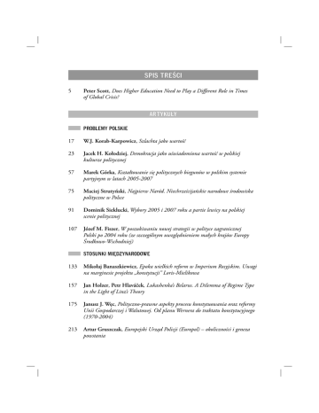 SPIS TREŚCI 5 Peter Scott, Does Higher Education Need to Play a Different Role in Times of Global Crisis? AR TYKUŁY PROBLEMY POLSKIE 17 W.J. Korab-Karpowicz, Szlachta jako wartość 23 Jacek H. Kołodziej, Demokracja jako uświadomiona wartość w polskiej kulturze politycznej 57 Marek Górka, Kształtowanie się politycznych biegunów w polskim systemie partyjnym w latach 2005-2007 75 Maciej Strutyński, Najpierw Naród. Niechrześcijańskie narodowe środowiska polityczne w Polsce 91 Dominik Sieklucki, Wybory 2005 i 2007 roku a partie lewicy na polskiej scenie politycznej 107 Józef M. Fiszer, W poszukiwaniu nowej strategii w polityce zagranicznej Polski po 2004 roku (ze szczególnym uwzględnieniem małych krajów Europy Środkowo-Wschodniej) STOSUNKI MIĘDZYNARODOWE 133 Mikołaj Banaszkiewicz, Epoka wielkich reform w Imperium Rosyjskim. Uwagi na marginesie projektu „konstytucji” Loris-Mielikowa 157 Jan Holzer, Petr Hlaváček, Lukashenka’s Belarus. A Dilemma of Regime Type in the Light of Linz’s Theory 175 Janusz J. Węc, Polityczno-prawne aspekty procesu konstytuowania oraz reformy Unii Gospodarczej i Walutowej. Od planu Wernera do traktatu konstytucyjnego (1970-2004) 213 Artur Gruszczak, Europejski Urząd Policji (Europol) – okoliczności i geneza powstania Spis treści POLITEJA 2(12)/2009 235 Rafał Willa, Lobbing jako element systemu politycznego Unii Europejskiej 249 Rafał Wordliczek, Unia dla Śródziemnomorza – oczekiwania i zagrożenia 263 Karol Derwich, Ruch studencki w Meksyku – 1968 277 Wawrzyniec K. Konarski, Isolationism, Dependency and Clientelism as Traditional Features of the Paraguayan Foreign Policy 299 Grzegorz Nycz, Od krucjaty Wilsona do krucjaty Reagana. Kształtowanie amerykańskiej polityki krzewienia demokracji 323 Przemysław Furgacz, Amerykańska interwencja zbrojna w Iraku 2003-2008. Charakterystyka działań wojennych i okupacji – krytyczne spojrzenie 357 Paulina Napierała, G.W. Bush’s Faith-Based Initiatives Policy and the Idea of the Separation of Church and State in the U.S.A. 383 Konrad Oświecimski, Zaangażowanie grup interesu w proces wyborczy w Stanach Zjednoczonych 411 Marcin Grabowski, Koncepcja biegunowości w systemach międzynarodowych regionu Azji i Pacyfiku 3 PROBLEMY MYŚLI POLITYCZNEJ 433 Piotr Musiewicz, Król-kapłan? Przejawy i uzasadnienia erastianizmu Henryka VIII 451 Michał J. Czarnecki, Z Pireusu do Aten. Intelektualna droga Erica Voegelina do 1938 roku 475 Dariusz Grzybek, Idea narodowa a myśl gospodarcza w pismach Romana Rybarskiego PRZEKŁADY 513 Justyna Kiliańczyk-Zięba, Wzór Rzeczypospolitej rządnej do ciała ludzkiego przystosowany, krótko spisany przez ks. Jana Januszowskiego, archidiakona sądeckiego 527 Piotr Musiewicz, Charles’a Saroléa i Gilberta Keith Chestertona Listy o sprawach polskich 4 Spis treści POLITEJA 2(12)/2009 VARIA 543 Agnieszka Hennel-Brzozowska, Psychological Problems in Families of Diplomats – a Systemic Approach 557 Pervez Iqbal Khan Tareen, American Adventurism in Afghanistan 563 Ewa Pogorzała, Sprawozdanie z debaty „Rola instytucji obywatelskich w demokracji” (Warszawa, 1 czerwca 2009 roku) RECENZJE 571 Bogumił Grott, Dmytro Doncow, Nacjonalizm 579 Dagmara Mrozowska, Jerzy Dębski, Joanna Talewicz-Kwiatkowska, Prześladowania i masowa zagłada Romów podczas II wojny światowej w świetle relacji i wspomnień 583 Damien Thiriet, Europa der Zugehörigkeiten. Integrationswege zwischen Ein- und Auswanderung, red. Rudolf von Thadden, Steffen Kaudelka, Thomas Serrier 585 Patryk Tomaszewski, Wojciech Turek, Arka przymierza. Wojciech Wasiutyński 1910-1994. Biografia polityczna 591 Marcin Zwiercan, Małgorzata Abassy, Inteligencja a kultura. O problemach samoidentyfikacji dziewiętnastowiecznej inteligencji rosyjskiej