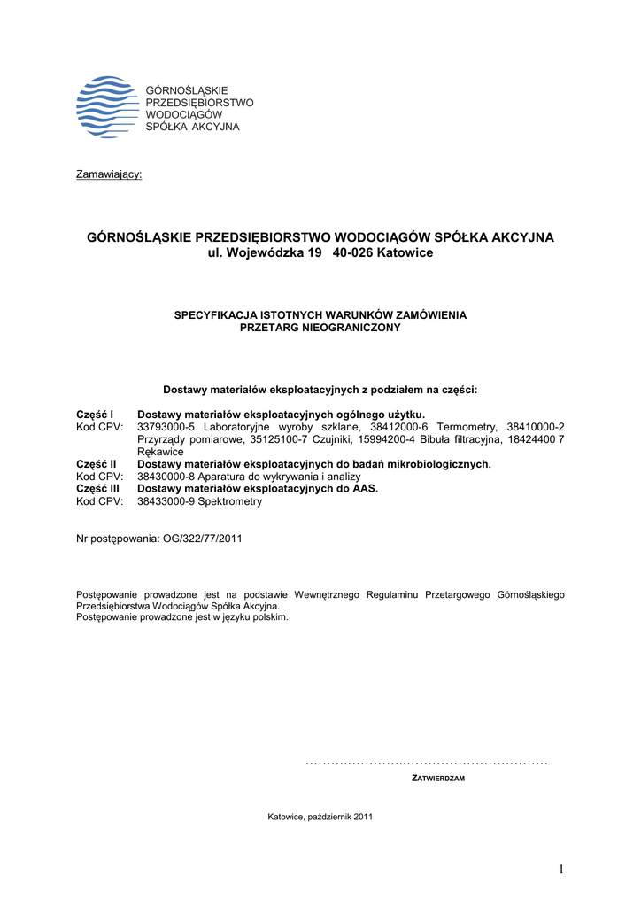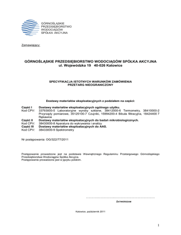 Zamawiający: GÓRNOŚLĄSKIE PRZEDSIĘBIORSTWO WODOCIĄGÓW SPÓŁKA AKCYJNA ul. Wojewódzka 19 40-026 Katowice SPECYFIKACJA ISTOTNYCH WARUNKÓW ZAMÓWIENIA PRZETARG NIEOGRANICZONY Dostawy materiałów eksploatacyjnych z podziałem na części: Część I Kod CPV: Część II Kod CPV: Część III Kod CPV: Dostawy materiałów eksploatacyjnych ogólnego uŜytku. 33793000-5 Laboratoryjne wyroby szklane, 38412000-6 Termometry, 38410000-2 Przyrządy pomiarowe, 35125100-7 Czujniki, 15994200-4 Bibuła filtracyjna, 18424400 7 Rękawice Dostawy materiałów eksploatacyjnych do badań mikrobiologicznych. 38430000-8 Aparatura do wykrywania i analizy Dostawy materiałów eksploatacyjnych do AAS. 38433000-9 Spektrometry Nr postępowania: OG/322/77/2011 Postępowanie prowadzone jest na podstawie Wewnętrznego Regulaminu Przetargowego Górnośląskiego Przedsiębiorstwa Wodociągów Spółka Akcyjna. Postępowanie prowadzone jest w języku polskim. ……….…………..…………………………… ZATWIERDZAM Katowice, październik 2011 1 I. Informacje ogólne. 1. Nazwa zamawiającego: Górnośląskie Przedsiębiorstwo Wodociągów Spółka Akcyjna, adres: 40-026 Katowice, ul. Wojewódzka 19, zarejestrowane w Sądzie Rejonowym Katowice-Wschód w Katowicach, Wydział VIII Gospodarczy Krajowego Rejestru Sądowego pod numerem 0000247533, NIP 634 012 87 88, REGON 271506695, wysokość kapitału zakładowego: 608 393 000zł, wpłacono w całości tel.: +48 32 6038 861, fax: +48 32 6038 614, http://www.gpw.katowice.pl 2. Przedmiot zamówienia: Dostawy materiałów eksploatacyjnych z podziałem na części: Część I Dostawy materiałów eksploatacyjnych ogólnego uŜytku. Kod CPV: 33793000-5 Laboratoryjne wyroby szklane, 38412000-6 Termometry, 38410000-2 Przyrządy pomiarowe, 35125100-7 Czujniki, 15994200-4 Bibuła filtracyjna, 18424400 7 Rękawice Część II Dostawy materiałów eksploatacyjnych do badań mikrobiologicznych. Kod CPV: 38430000-8 Aparatura do wykrywania i analizy Część III Dostawy materiałów eksploatacyjnych do AAS. Kod CPV: 38433000-9 Spektrometry 3. Postępowanie prowadzone będzie w trybie przetargu nieograniczonego w oparciu o Wewnętrzny Regulamin Przetargowy Zamawiającego, a w sprawach nieuregulowanych w oparciu o przepisy Kodeksu cywilnego (Dz. U. Nr 16, poz. 93, z późniejszymi zmianami). 4. Wykonawca powinien zapoznać się z całością specyfikacji istotnych warunków zamówienia. 5. Wykonawca poniesie wszelkie koszty związane z udziałem w postępowaniu. 6. O udzielenie zamówienia mogą ubiegać się podmioty występujące wspólnie. KaŜdy wykonawca moŜe przedłoŜyć tylko jedną ofertę. Oferta wykonawcy, który przedłoŜy więcej niŜ jedną ofertę zostanie odrzucona. 7. Zamawiający dopuszcza składanie ofert częściowych. 8. Zamawiający nie dopuszcza składania ofert wariantowych. Dostawy materiałów eksploatacyjnych ogólnego uŜytku. 9. Dla części I Kod CPV: 33793000-5 Laboratoryjne wyroby szklane, 38412000-6 Termometry, 38410000-2 Przyrządy pomiarowe, 35125100-7 Czujniki, 15994200-4 Bibuła filtracyjna, 18424400 7 Rękawice Zamawiający nie dopuszcza składania oferty równowaŜnej dla materiałów eksploatacyjnych wskazanych w pozycji 21, 28, 58, 59, 62, 65 załącznika nr 1 do SIWZ - opisie Części I przedmiotu zamówienia. 10. Dla części II Dostawy materiałów eksploatacyjnych do badań mikrobiologicznych. Kod CPV: 38430000-8 Aparatura do wykrywania i analizy Zamawiający nie dopuszcza składania oferty równowaŜnej dla materiałów eksploatacyjnych wskazanych w pozycji 1, 2, 3, 5, 13, 16, 19, 21, 22, 23, 24, 26, 27 załącznika nr 2 do SIWZ - opisie Części II przedmiotu zamówienia. 11. Dla części III Dostawy materiałów eksploatacyjnych do AAS. Kod CPV: 38433000-9 Spektrometry Zamawiający nie dopuszcza składania oferty równowaŜnej. 12. Zamawiający nie przewiduje udzielenia zamówień uzupełniających. 13. Zebranie wykonawców – zamawiający nie zamierza zwołać zebrania wykonawców. II. Opis przedmiotu zamówienia. Przedmiotem zamówienia są sukcesywne dostawy dla wszystkich laboratoriów Górnośląskiego Przedsiębiorstwa Wodociągów S.A. materiałów eksploatacyjnych z podziałem na części: Część I Dostawy materiałów eksploatacyjnych ogólnego uŜytku. Kod CPV: 33793000-5 Laboratoryjne wyroby szklane, 38412000-6 Termometry, 38410000-2 Przyrządy pomiarowe, 35125100-7 Czujniki, 15994200-4 Bibuła filtracyjna, 18424400 7 Rękawice Część II Dostawy materiałów eksploatacyjnych do badań mikrobiologicznych. Kod CPV: 38430000-8 Aparatura do wykrywania i analizy Część III Dostawy materiałów eksploatacyjnych do AAS. Kod CPV: 38433000-9 Spektrometry 2 1. OPIS PRZEDMIOTU ZAMÓWIENIA DLA CZĘŚCI I PRZEDMIOTU ZAMÓWIENIA Część I Dostawy materiałów eksploatacyjnych ogólnego uŜytku Kod CPV: 33793000-5 Laboratoryjne wyroby szklane, 38412000-6 Termometry, 38410000-2 Przyrządy pomiarowe, 35125100-7 Czujniki, 15994200-4 Bibuła filtracyjna, 18424400 7 Rękawice 1.1. Część I przedmiotu zamówienia obejmuje sukcesywne dostawy materiałów eksploatacyjnych ogólnego uŜytku zgodnie z opisem przedmiotu zamówienia stanowiącym załącznik nr 1 do SIWZ oraz warunkami dostawy określonymi we wzorze umowy dla części I przedmiotu zamówienia stanowiącym załącznik nr 4 do SIWZ. 1.2. Dostawy przedmiotu zamówienia odbywać się będą sukcesywnie kaŜdorazowo po wezwaniu, transportem Wykonawcy na jego koszt i ryzyko loco do pomieszczeń Wydziału Badania Wody Górnośląskiego Przedsiębiorstwa Wodociągów Spółka Akcyjna, ul. Wojewódzka 19, 40–026 Katowice. 1.3. Dostawy realizowane będą na podstawie e-mailowego lub faksowego wywołania zamawiającego z 21 dniowym wyprzedzeniem z podaniem terminu, ilości i rodzaju produktu dostarczanego w danej partii. 1.4. Dostawy odbywać się będą od poniedziałku do piątku w godzinach od 8.00 do 13.00 1.5. Wykonawca zobowiązany jest, przy dostawie materiał