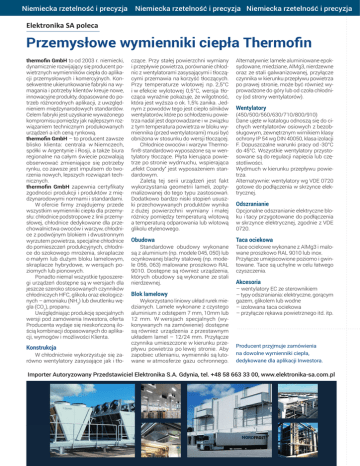 ks l /EC Niemiecka rzetelność i precyzja Niemiecka rzetelność i precyzja Niemiecka rzetelność i precyzja Elektronika SA poleca Przemysłowe wymienniki ciepła Thermofin thermofin GmbH to od 2003 r. niemiecki, dynamicznie rozwijający się producent powietrznych wymienników ciepła do aplikacji przemysłowych i komercyjnych. Konsekwentne ukierunkowanie fabryki na wymagania i potrzeby klientów kreuje nowe, innowacyjne produkty, dopasowane do potrzeb różnorodnych aplikacji, z uwzględnieniem międzynarodowych standardów. Celem fabryki jest uzyskanie wyważonego kompromisu pomiędzy jak najlepszym rozwiązaniem technicznym produkowanych urządzeń a ich ceną rynkową. thermofin GmbH – to producent zawsze blisko klienta: centrala w Niemczech, spółki w Argentynie i Rosji, a także biura regionalne na całym świecie pozwalają obserwować zmieniające się potrzeby rynku, co zawsze jest impulsem do tworzenia nowych, lepszych rozwiązań technicznych. thermofin GmbH zapewnia certyfikaty zgodności produkcji i produktów z międzynarodowymi normami i standardami. W ofercie firmy znajdujemy przede wszystkim wymienniki ciepła dla przemysłu: chłodnice podstropowe z linii przemysłowej, chłodnice dedykowane dla przechowalnictwa owoców i warzyw, chłodnice z podwójnym blokiem i dwustronnym wyrzutem powietrza, specjalne chłodnice do pomieszczeń produkcyjnych, chłodnice do szokowego mrożenia, skraplacze o małym lub dużym bloku lamelowym, skraplacze hybrydowe, w wersjach poziomych lub pionowych. Ponadto niemal wszystkie typoszeregi urządzeń dostępne są w wersjach dla jeszcze szeroko stosowanych czynników chłodniczych HFC, glikolu oraz ekologicznych – amoniaku (NH3) lub dwutlenku węgla (CO2), propanu. Uwzględniając produkcję specjalnych wersji pod zamówienia Inwestora, oferta Producenta wydaje się nieskończoną ilością kombinacji dopasowanych do aplikacji, wymogów i możliwości Klienta. Konstrukcja W chłodnictwie wykorzystuje się zarówno wentylatory zasysające jak i tło- czące. Przy stałej powierzchni wymiany i przepływie powietrza, porównanie chłodnic z wentylatorami zasysającymi i tłoczącymi przemawia na korzyść tłoczących. Przy temperaturze wlotowej np. 2,5°C i w efekcie wylotowej 0,5°C, wersja tłocząca wyraźnie pokazuje, że wilgotność, która jest wyższa o ok. 1,5% zanika. Jednym z powodów tego jest ciepło silników wentylatorów, które po schłodzeniu powietrza nadal jest doprowadzane i w związku z tym temperatura powietrza w bloku wymiennika (przed wentylatorami) musi być obniżona w stosunku do wersji tłoczącej. Chłodnice owoców i warzyw Thermofin® standardowo wyposażone są w wentylatory tłoczące. Płyta kierująca powietrze po stronie wydmuchu, wspierająca „efekt Coandy“ jest wyposażeniem standardowym. Zaletą tej serii urządzeń jest fakt wykorzystania geometrii lameli, zoptymalizowanej do tego typu zastosowań. Dodatkowo bardzo niski stopień ususzki przechowywanych produktów wynika z dużej powierzchni wymiany i małej różnicy pomiędzy temperaturą wlotową a temperaturą odparowania lub wlotową glikolu etylenowego. Alternatywnie: lamele aluminiowane epoksydowane, miedziane, AlMg3, nierdzewne oraz ze stali galwanizowanej, przyłącze czynnika w kierunku przepływu powietrza po prawej stronie, może być również wyprowadzone do góry lub od czoła chłodnicy (od strony wentylatorów). Obudowa Taca ociekowa Standardowe obudowy wykonane są z aluminium (np. modele 045, 050) lub ocynkowanej blachy stalowej (np. modele 056, 063) malowane proszkowo RAL 9010. Dostępne są również urządzenia, których obudowy są wykonane ze stali nierdzewnej. Blok lamelowy Wykorzystano liniowy układ rurek miedzianych. Lamele wykonane z czystego aluminium z odstępem 7 mm, 10mm lub 12 mm. W wersjach specjalnych (wykonywanych na zamówienie) dostępne są również urządzenia z przestawnym układem lamel – 12/24 mm. Przyłącze czynnika umieszczone w kierunku przepływu powietrza po lewej stronie. Aby zapobiec utlenianiu, wymienniki są lutowane w atmosferze gazu ochronnego. Wentylatory (450/500/560/630/710/800/910) Dane ujęte w katalogu odnoszą się do cichych wentylatorów osiowych z bezobsługowym, zewnętrznym wirnikiem klasy ochrony IP 54 wg DIN 40050, klasa izolacji F. Dopuszczalne warunki pracy od -30°C do 45°C. Wszystkie wentylatory przystosowane są do regulacji napięcia lub częstotliwości. Wydmuch w kierunku przepływu powietrza. Alternatywnie: wentylatory wg VDE 0720 gotowe do podłączenia w skrzynce elektrycznej. Odszranianie Opcjonalne odszranianie elektryczne bloku i tacy przygotowane do podłączenia w skrzynce elektrycznej, zgodnie z VDE 0720. Tace ociekowe wykonane z AlMg3 i malowane proszkowo RAL 9010 lub inox. Przyłącze umiejscowione poziomo i gwintowane. Tace są uchylne w celu łatwego czyszczenia. Akcesoria – wentylatory EC ze sterownikiem – typy odszraniania: elektryczne, gorącym gazem, glikolem lub wodne – izolowana taca ociekowa – przyłącze rękawa powietrznego itd. itp. Producent przyjmuje zamówienia na dowolne wymienniki ciepła, dedykowane dla aplikacji Inwestora. Chłodnictwo przemysłowe Importer Autoryzowany Przedstawiciel Elektronika S.A. Gdynia, tel. +48 58 663 33 00, www.elektronika-sa.com.pl om.pl m.pl 15 Niemiecka rzetelność i precyzja Niemiecka rzetelność i precyzja Niemiecka rzetelność i precyzja Przegląd produktów* PAROWNIKI / CHŁODNICE Chłodnice podstropowe linia przemysłowa czynnik chłodniczy seria HFC: TEN, TEL NH3: TAN, TAA, TAS CO2: TON, TOL glikol: TGN, TGL przepływ powietrza: wentylatory tłoczą powietrze przez blok lamelowy Chłodnice podstropowe przechowalnictwo owoców i warzyw czynnik chłodniczy seria HFC:TENA NH3:TANA CO2: TOLA glikol:TGNA przepływ powietrza: wentylatory tłoczą powietrze przez blok lamelowy Chłodnice z podwójnym blokiem linia przemysłowa z dwustronnym wyrzutem powietrza czynnik chłodniczy seria HFC:TED