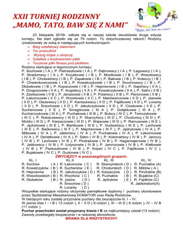 XXII TURNIEJ RODZINNY „MAMO, TATO, BAW SIĘ Z NAMI” 23 listopada 2016r. odbyła się w naszej szkole dwudziesta druga edycja turnieju. Na start zgłosiło się aż 79 rodzin. To dotychczasowy rekord.! Rodziny rywalizowały ze sobą w następujących konkurencjach: • Bieg sztafetowy slalomem • Tor przeszkód • Wyścig trójek z obręczą • Sztafeta z kozłowaniem piłek • Toczenie piłki fitness pod płotkiem Rodziny startujące w tegorocznym turnieju: P. Sochowie ( I A ), P. Pietraszkowie ( I A ), P. Dąbrowscy ( I A ), P. Łagowscy ( I A ), P. Stradomscy ( I A ), P. Krzyśkowie ( I B ), P. Miodkowie ( I B ), P. Wesołowscy ( I B ), P. Cholewińscy ( I B ), P. Zapałowie ( I B ), P. Bałowie ( I B ), P. Koteccy ( I B ) P. Chwieckowiczowie ( I B ), P. Kowalczykowie ( I B ), P. Snochowscy ( I B ), P. Dłubakowie ( I B ), P. Kopaczowie ( I B ), P. Hejznerowie ( I B ), P. Gapińscy ( II A ), P. Drogoszowie ( II A ), P. Angielscy ( II A ), P. Kowalczykowie ( II A ), P. Satro ( II B ) P. Zawiszowie ( II B ), P. Janasowie ( II B ), P. Polańscy ( II B ), P. Pieronowie ( II B ) P. Łakomcowie ( II C ), P. Wzorkowie ( II C ), P. Markiewiczowie ( II D ), P. Jasowie ( II D ), P. Olszewscy ( II D ), P. Kaniszewscy ( II D ), P. Fajdkowie ( II D ), P. Loranty ( II D ), P. Śniochowie ( II D ), P. Jakubczykowie ( II D ), P. Cioskowie ( II E ), P. Sucheniowie ( II E ), P. Smagórowie ( III A ), P. Gołąbkowie ( III A ), P. Kucharczykowie ( III A ), P. Puchałowie ( III B ), P. Bulscy ( III C ), P. Tomczykowie ( III C ), P. Robaczewscy ( III D ), P. Skarzyńscy ( III D ), P. Chodurscy ( III D ), P. Moćko ( III D ), P. Karpaczowie ( III D ), P. Wajsowie ( III D ), P. Ramusowie ( III E ), P. Jędrykowie ( III E ), P. Bieńkowie ( III E ), P. Gudwańscy ( III E ), P. Lechowie ( III E ), P. Baćkowscy ( III F ), P. Majcherowie ( III F ), P. Jędrykowie ( IV A ), P. Miśtowie ( IV A ), P. Jabłońscy ( IV A ), P. Puchałowie ( IV A ), P. Łakomcowie ( IV A ), P. Derlatkowie ( IV A ), P. Satro ( IV B ), P. Kołomańscy ( IV B ), P. Jaroccy ( IV B ), P. Lechowie ( IV B ), P. Pindralowie ( IV B ), P. Hagiemajerowie ( IV B ), P. Jaśkowscy ( IV B ), P. Łotyszowie ( IV B ), P. Jamrozowie ( IV B ), P. Kiełbowie ( IV B ), P. Pastuszkowie ( IV B ), P. Kopeć ( IV C ), P. Fajdkowie ( IV C ), P. Bujakowie ( IV C ), P. Guzkowie ( IV C ). ZWYCIĘZCY w poszczególnych grupach: KL. I KL.II KL. III KL. IV R. Sochów ( A ) R. Łakomców ( C ) R. Skarzyńskich ( D ) R. Puchałów (A) R. Kowalczyków ( B ) R. Sucheniów ( E ) R. Chodurskich ( D ) R. Miśtów ( A ) R. Hejznerów ( B ) R. Jakubczyków ( D ) R. Karpaczów ( D ) R. Pindralów (B) R. Wesołowskich ( B ) R. Wzorków ( C ) R. Puchałów ( B ) R. Bujaków (C) R. Dłubaków ( B ) R. Jasów (D) R. Jędryków ( E ) R. Fajdków (C) R. Śniochów ( D ) R. Jabłońskich(A) R. Loranty ( D ) Wszystkie startujące rodziny otrzymały pamiątkowe dyplomy i puchary ufundowane przez Spółdzielnię Mieszkaniową DOMATOR oraz Radę Rodziców. W bieżącym roku zostały przyznane puchary dla zwycięzców kl. I – IV. W pionie klas I – I B ( 13 rodzin ), II – II D ( 8 rodzin ), III – III D ( 6 rodzin ), IV – IV B (11 rodzin ). Puchar przechodni został przyznany klasie I B za najliczniejszy udział (13 rodzin). Zawody przebiegały bezpiecznie i w radosnej atmosferze. BRAWA DLA WSZYSTKICH!!!