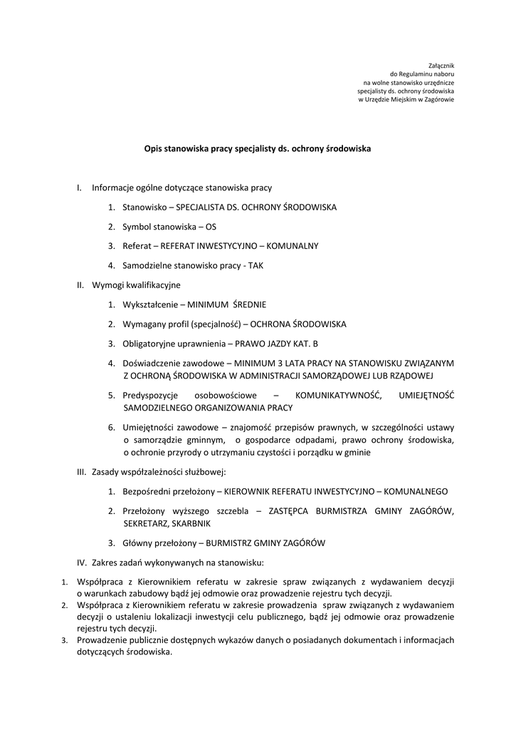 Załącznik do Regulaminu naboru na wolne stanowisko urzędnicze specjalisty ds. ochrony środowiska w Urzędzie Miejskim w Zagórowie Opis stanowiska pracy specjalisty ds. ochrony środowiska I. Informacje ogólne dotyczące stanowiska pracy 1. Stanowisko – SPECJALISTA DS. OCHRONY ŚRODOWISKA 2. Symbol stanowiska – OS 3. Referat – REFERAT INWESTYCYJNO – KOMUNALNY 4. Samodzielne stanowisko pracy - TAK II. Wymogi kwalifikacyjne 1. Wykształcenie – MINIMUM ŚREDNIE 2. Wymagany profil (specjalność) – OCHRONA ŚRODOWISKA 3. Obligatoryjne uprawnienia – PRAWO JAZDY KAT. B 4. Doświadczenie zawodowe – MINIMUM 3 LATA PRACY NA STANOWISKU ZWIĄZANYM Z OCHRONĄ ŚRODOWISKA W ADMINISTRACJI SAMORZĄDOWEJ LUB RZĄDOWEJ 5. Predyspozycje osobowościowe – KOMUNIKATYWNOŚĆ, SAMODZIELNEGO ORGANIZOWANIA PRACY UMIEJĘTNOŚĆ 6. Umiejętności zawodowe – znajomość przepisów prawnych, w szczególności ustawy o samorządzie gminnym, o gospodarce odpadami, prawo ochrony środowiska, o ochronie przyrody o utrzymaniu czystości i porządku w gminie III. Zasady współzależności służbowej: 1. Bezpośredni przełożony – KIEROWNIK REFERATU INWESTYCYJNO – KOMUNALNEGO 2. Przełożony wyższego szczebla – ZASTĘPCA BURMISTRZA GMINY ZAGÓRÓW, SEKRETARZ, SKARBNIK 3. Główny przełożony – BURMISTRZ GMINY ZAGÓRÓW IV. Zakres zadań wykonywanych na stanowisku: Współpraca z Kierownikiem referatu w zakresie spraw związanych z wydawaniem decyzji o warunkach zabudowy bądź jej odmowie oraz prowadzenie rejestru tych decyzji. 2. Współpraca z Kierownikiem referatu w zakresie prowadzenia spraw związanych z wydawaniem decyzji o ustaleniu lokalizacji inwestycji celu publicznego, bądź jej odmowie oraz prowadzenie rejestru tych decyzji. 3. Prowadzenie publicznie dostępnych wykazów danych o posiadanych dokumentach i informacjach dotyczących środowiska. 1. 4. 5. 6. 7. 8. 9. 10. 11. 12. 13. 14. 15. 16. 17. 18. Udostępnianie na potrzeby społeczeństwa posiadanych opracowań, informacji i decyzji dotyczących środowiska. Prowadzenie spraw związanych z wydawaniem decyzji o środowiskowych uwarunkowaniach zgody na realizację przedsięwzięć. Sporządzanie w tym zakresie ogłoszeń i obwieszczeń oraz ich publikowanie. Prowadzenie spraw związanych z planami i programami w ochronie środowiska. Przygotowywanie pozwoleń na emitowanie hałasu do środowiska. Sporządzanie obowiązującej sprawozdawczości z zakresu ochrony środowiska, Promocja i propagowanie oraz realizacja zadań w zakresie edukacji ekologicznej. Zbieranie informacji o rodzaju, ilości i miejscach występowania substancji stwarzających szczególne zagrożenie dla środowiska. Prowadzenie spraw związanych z wydawaniem decyzji (z wyłączeniem kompetencji wojewody): 1) na wytwarzanie odpadów oraz zatwierdzających program gospodarki odpadami niebezpiecznymi, także przyjmowanie informacji o wytwarzanych odpadach, 2) na prowadzenie działalności w zakresie zbierania, transportu, odzysku lub unieszkodliwiania odpadów, 3) nakazujących usunięcie odpadów z miejsc nie przeznaczonych do ich składowania. Prowadzenie rejestru posiadaczy odpadów, którzy są zwolnieni z obowiązku uzyskiwania zezwoleń na prowadzenie działalności w zakresie zbierania, transportu, odzysku lub unieszkodliwiania odpadów innych niż komunalne. Prowadzenie spraw wynikających z programu dotyczącego usuwania i unieszkodliwiania azbestu. Wydawanie zezwoleń na usuwanie drzew i krzewów. Wymierzanie kar pieniężnych za usuwanie drzew i krzewów bez zezwolenia. Prowadzenie spraw związanych z gospodarką odpadami. Przygotowywanie aktów prawnych związanych z gospodarką odpadami, w szczególności projektów uchwał i zarządzeń. Prowadzenie programu GOK+, a w szczególności prowadzenie rejestrów: osób, nieruchomości, deklaracji, zmian, przedsiębiorców, ilości i asortymentu odbieranych odpadów (monitoring). V. Odpowiedzialność Pracownika: Pracownik ponosi odpowiedzialność służbową przed Burmistrzem Gminy Zagórów. VI. Informacja o warunkach pracy na stanowisku: praca w podstawowym systemie czasu pracy, praca z komputerem i urządzeniami biurowymi, kontakt z interesantami, wyjazdy w teren, sytuacje stresowe związane z prowadzeniem postępowań o dużym stopniu złożoności)