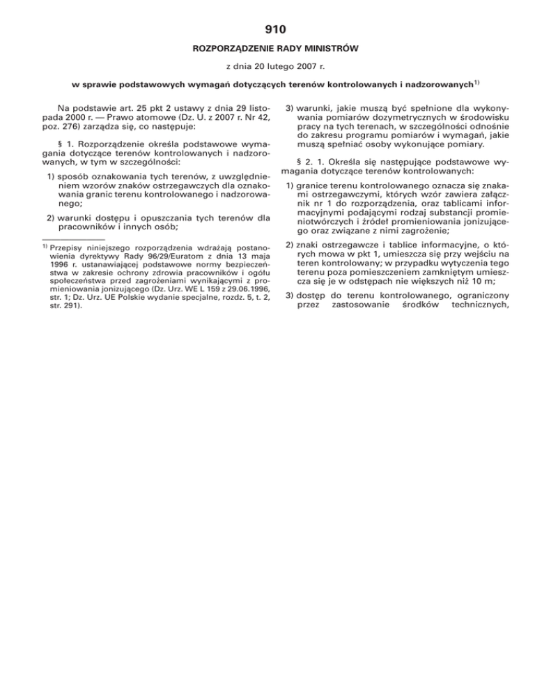 910 ROZPORZÑDZENIE RADY MINISTRÓW z dnia 20 lutego 2007 r. w sprawie podstawowych wymagaƒ dotyczàcych terenów kontrolowanych i nadzorowanych1) Na podstawie art. 25 pkt 2 ustawy z dnia 29 listopada 2000 r. — Prawo atomowe (Dz. U. z 2007 r. Nr 42, poz. 276) zarzàdza si´, co nast´puje: § 1. Rozporzàdzenie okreÊla podstawowe wymagania dotyczàce terenów kontrolowanych i nadzorowanych, w tym w szczególnoÊci: 1) sposób oznakowania tych terenów, z uwzgl´dnieniem wzorów znaków ostrzegawczych dla oznakowania granic terenu kontrolowanego i nadzorowanego; 2) warunki dost´pu i opuszczania tych terenów dla pracowników i innych osób; ——————— 1) Przepisy niniejszego rozporzàdzenia wdra˝ajà postanowienia dyrektywy Rady 96/29/Euratom z dnia 13 maja 1996 r. ustanawiajàcej podstawowe normy bezpieczeƒstwa w zakresie ochrony zdrowia pracowników i ogó∏u spo∏eczeƒstwa przed zagro˝eniami wynikajàcymi z promieniowania jonizujàcego (Dz. Urz. WE L 159 z 29.06.1996, str. 1; Dz. Urz. UE Polskie wydanie specjalne, rozdz. 5, t. 2, str. 291). 3) warunki, jakie muszà byç spe∏nione dla wykonywania pomiarów dozymetrycznych w Êrodowisku pracy na tych terenach, w szczególnoÊci odnoÊnie do zakresu programu pomiarów i wymagaƒ, jakie muszà spe∏niaç osoby wykonujàce pomiary. § 2. 1. OkreÊla si´ nast´pujàce podstawowe wymagania dotyczàce terenów kontrolowanych: 1) granice terenu kontrolowanego oznacza si´ znakami ostrzegawczymi, których wzór zawiera za∏àcznik nr 1 do rozporzàdzenia, oraz tablicami informacyjnymi podajàcymi rodzaj substancji promieniotwórczych i êróde∏ promieniowania jonizujàcego oraz zwiàzane z nimi zagro˝enie; 2) znaki ostrzegawcze i tablice informacyjne, o których mowa w pkt 1, umieszcza si´ przy wejÊciu na teren kontrolowany; w przypadku wytyczenia tego terenu poza pomieszczeniem zamkni´tym umieszcza si´ je w odst´pach nie wi´kszych ni˝ 10 m; 3) dost´p do terenu kontrolowanego, ograniczony przez zastosowanie Êrodków technicznych, Dziennik Ustaw Nr 131 — 9654 — w szczególnoÊci drzwi, bram lub widocznych blokad, majà: a) pracownicy zatrudnieni na tym terenie, b) pacjenci poddawani zabiegom diagnostycznym lub terapeutycznym, c) za zgodà kierownika jednostki organizacyjnej lub upowa˝nionej przez niego osoby — inne przeszkolone osoby wyposa˝one w dawkomierze osobiste umo˝liwiajàce bezpoÊrednie okreÊlenie dawki od nara˝enia zewn´trznego otrzymanej w czasie przebywania na tym terenie, d) pracownicy organu, który wyda∏ zezwolenie w zakresie bezpieczeƒstwa jàdrowego i ochrony radiologicznej na wykonywanie dzia∏alnoÊci zwiàzanej z nara˝eniem na tym terenie, upowa˝nieni do prowadzenia kontroli; 4) osoby, o których mowa w pkt 3 lit. a i lit. c, majà dost´p do terenu kontrolowanego i jego opuszczania na podstawie przepustek, kart wst´pu lub identyfikatorów; 5) prace na terenie kontrolowanym prowadzi si´ zgodnie z instrukcjami pracy odpowiednimi dla zagro˝enia zwiàzanego z wyst´pujàcymi substancjami promieniotwórczymi i êród∏ami promieniowania jonizujàcego oraz wykonywanymi czynnoÊciami. 2. Je˝eli na terenie kontrolowanym wyst´puje mo˝liwoÊç rozprzestrzeniania si´ ska˝eƒ promieniotwórczych, poza wymaganiami, o których mowa w ust. 1, zapewnia si´: 1) przy wejÊciu — mo˝liwoÊç zmiany odzie˝y osobistej na odzie˝ roboczà oraz pomiar ska˝eƒ osobistych i wnoszonego sprz´tu; 2) przy wyjÊciu — pojemniki na ska˝onà odzie˝, pomiar ska˝eƒ osobistych i wynoszonego sprz´tu oraz Êrodki i urzàdzenia do usuwania tych ska˝eƒ, zale˝ne od prowadzonych prac, a tak˝e zmian´ odzie˝y ska˝onej na nieska˝onà. § 3. 1. OkreÊla si´ nast´pujàce podstawowe wymagania dotyczàce terenów nadzorowanych: Poz. 910 2. Je˝eli jest to uzasadnione rodzajem czynnoÊci wykonywanych na terenie nadzorowanym, poza wymaganiami, o których mowa w ust. 1, opracowuje si´ instrukcje pracy odpowiednie do zagro˝enia zwiàzanego z wyst´pujàcymi êród∏ami i wykonywanymi czynnoÊciami. § 4. 1. OkreÊla si´ nast´pujàce warunki wykonywania pomiarów dozymetrycznych w Êrodowisku pracy na terenach kontrolowanych i nadzorowanych: 1) ustalenie miejsca, czasu i cz´stotliwoÊci przeprowadzania pomiarów; 2) ustalenie rodzajów wykonywanych pomiarów; 3) wskazanie metod, przyrzàdów oraz procedur pomiarowych. 2. Zakres programu pomiarów dozymetrycznych w Êrodowisku pracy, o których mowa w ust. 1, obejmuje: 1) pomiar mocy dawki oraz okreÊlenie rodzaju promieniowania; 2) pomiar i identyfikacj´ ska˝eƒ promieniotwórczych powierzchni i powietrza — w przypadku mo˝liwoÊci rozprzestrzeniania si´ ska˝eƒ promieniotwórczych. 3. Pomiary, o których mowa w ust. 1, umo˝liwiajà: 1) ciàg∏à ocen´ warunków pracy, w tym ocen´ nara˝enia pracowników i innych osób znajdujàcych si´ na terenach kontrolowanych albo nadzorowanych; 2) kontrol´ przestrzegania limitów u˝ytkowych dawek okreÊlonych w zezwoleniu na prowadzenie dzia∏alnoÊci na tych terenach; 3) weryfikacj´ granic terenu kontrolowanego i nadzorowanego; 4) ocen´ nara˝enia osób znajdujàcych si´ poza tymi terenami, spowodowanego prowadzonà dzia∏alnoÊcià, w tym w wyniku usuwania substancji promieniotwórczych z tych terenów. 1) granice terenu nadzorowanego oznacza si´ znakami ostrzegawczymi, których wzór zawiera za∏àcznik nr 2 do rozporzàdzenia; § 5. Pomiary dozymetryczne w Êrodowisku pracy mogà wykonywaç osoby: 2) granice terenu nadzorowanego mo˝na oznaczyç tablicami informacyjnymi podajàcymi rodzaj substancji promieniotwórczych i êróde∏ promieniowania jonizujàcego oraz zwiàzane z nimi zagro˝enie; 2) przeszkolone przez inspektora ochrony radiologicznej w zakresie wykonywania pomiarów. 3) znaki ostrzegawcze i tablice informacyjne, o których mowa w pkt 1 i 2, umieszcza si´ przy wejÊciu na teren nadzorowany; w przypadku wytyczenia tego terenu poza pomieszczeniem zamkni´tym u
