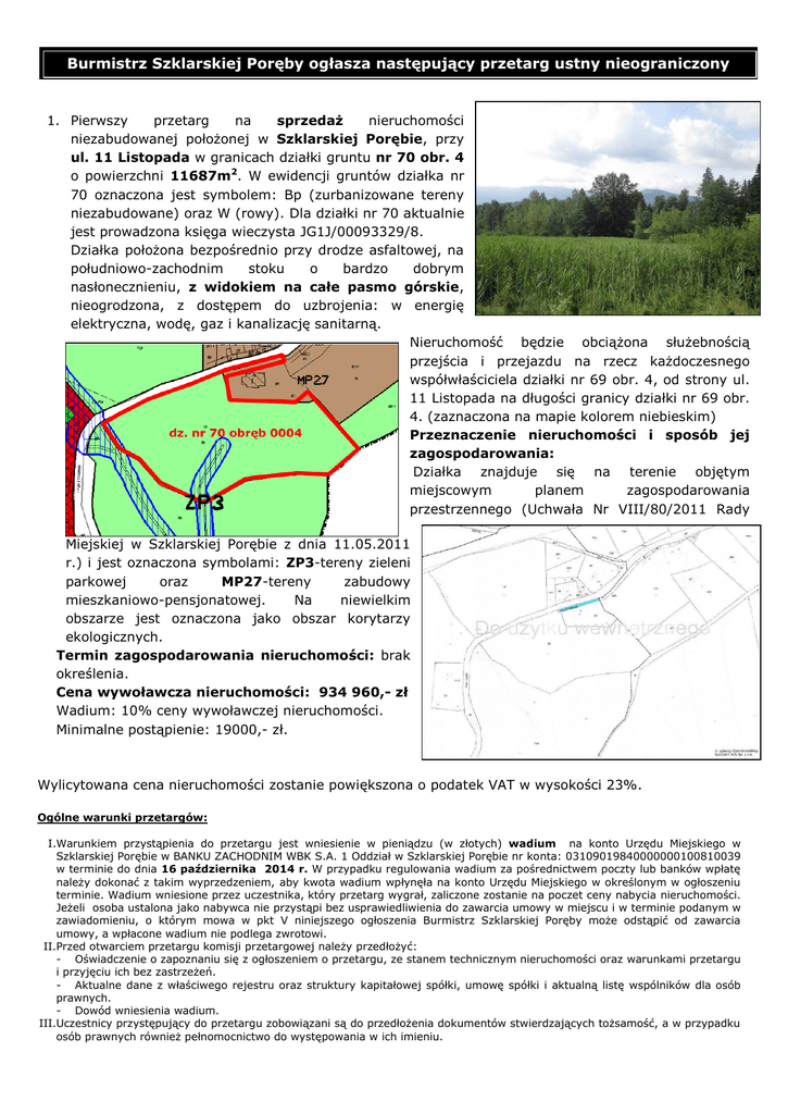 Burmistrz Szklarskiej Poręby ogłasza następujący przetarg ustny nieograniczony 1. Pierwszy przetarg na sprzedaż nieruchomości niezabudowanej położonej w Szklarskiej Porębie, przy ul. 11 Listopada w granicach działki gruntu nr 70 obr. 4 o powierzchni 11687m2. W ewidencji gruntów działka nr 70 oznaczona jest symbolem: Bp (zurbanizowane tereny niezabudowane) oraz W (rowy). Dla działki nr 70 aktualnie jest prowadzona księga wieczysta JG1J/00093329/8. Działka położona bezpośrednio przy drodze asfaltowej, na południowo-zachodnim stoku o bardzo dobrym nasłonecznieniu, z widokiem na całe pasmo górskie, nieogrodzona, z dostępem do uzbrojenia: w energię elektryczna, wodę, gaz i kanalizację sanitarną. Nieruchomość będzie obciążona służebnością przejścia i przejazdu na rzecz każdoczesnego współwłaściciela działki nr 69 obr. 4, od strony ul. 11 Listopada na długości granicy działki nr 69 obr. 4. (zaznaczona na mapie kolorem niebieskim) Przeznaczenie nieruchomości i sposób jej zagospodarowania: Działka znajduje się na terenie objętym miejscowym planem zagospodarowania przestrzennego (Uchwała Nr VIII/80/2011 Rady Miejskiej w Szklarskiej Porębie z dnia 11.05.2011 r.) i jest oznaczona symbolami: ZP3-tereny zieleni parkowej oraz MP27-tereny zabudowy mieszkaniowo-pensjonatowej. Na niewielkim obszarze jest oznaczona jako obszar korytarzy ekologicznych. Termin zagospodarowania nieruchomości: brak określenia. Cena wywoławcza nieruchomości: 934 960,- zł Wadium: 10% ceny wywoławczej nieruchomości. Minimalne postąpienie: 19000,- zł. Wylicytowana cena nieruchomości zostanie powiększona o podatek VAT w wysokości 23%. Ogólne warunki przetargów: I.Warunkiem przystąpienia do przetargu jest wniesienie w pieniądzu (w złotych) wadium na konto Urzędu Miejskiego w Szklarskiej Porębie w BANKU ZACHODNIM WBK S.A. 1 Oddział w Szklarskiej Porębie nr konta: 03109019840000000100810039 w terminie do dnia 16 października 2014 r. W przypadku regulowania wadium za pośrednictwem poczty lub banków wpłatę należy dokonać z takim wyprzedzeniem, aby kwota wadium wpłynęła na konto Urzędu Miejskiego w określonym w ogłoszeniu terminie. Wadium wniesione przez uczestnika, który przetarg wygrał, zaliczone zostanie na poczet ceny nabycia nieruchomości. Jeżeli osoba ustalona jako nabywca nie przystąpi bez usprawiedliwienia do zawarcia umowy w miejscu i w terminie podanym w zawiadomieniu, o którym mowa w pkt V niniejszego ogłoszenia Burmistrz Szklarskiej Poręby może odstąpić od zawarcia umowy, a wpłacone wadium nie podlega zwrotowi. II.Przed otwarciem przetargu komisji przetargowej należy przedłożyć: - Oświadczenie o zapoznaniu się z ogłoszeniem o przetargu, ze stanem technicznym nieruchomości oraz warunkami przetargu i przyjęciu ich bez zastrzeżeń. - Aktualne dane z właściwego rejestru oraz struktury kapitałowej spółki, umowę spółki i aktualną listę wspólników dla osób prawnych. - Dowód wniesienia wadium. III.Uczestnicy przystępujący do przetargu zobowiązani są do przedłożenia dokumentów stwierdzających tożsamość, a w przypadku osób prawnych również pełnomocnictwo do występowania w ich imieniu. IV.Przetarg jest ważny bez względu na liczbę uczestników przetargu, jeżeli przynajmniej jeden uczestnik zaoferował co najmniej jedno postąpienie powyżej ceny wywoławczej . V.O miejscu i terminie zawarcia umowy nabycia nieruchomości w formie aktu notarialnego osoba ustalona jako nabywca nieruchomości zostanie zawiadomiona pisemnie, najpóźniej w ciągu 21 dni od dnia rozstrzygnięcia przetargu. VI. Koszty aktu notarialnego, opłatę sądową i wznowienia granic przedmiotowych nieruchomości ponosi nabywca. VII.Cudzoziemcy (w rozumieniu ustawy z dnia 24 marca 1920 r. o nabywaniu nieruchomości przez cudzoziemców) w przypadku wygrania przetargu zobowiązani są przed podpisaniem umowy notarialnej uzyskać zezwolenie Ministra Spraw Wewnętrznych i Administracji na nabycie nieruchomości w przypadkach, gdy zezwolenie to jest wymagane. VIII.Burmistrz Szklarskiej Poręby może odwołać przetarg jedynie z ważnych powodów. Przetarg odbędzie się w dniu 21 października 2014 r. o godz. 1200 w sali nr 2 Urzędu Miejskiego w Szklarskiej Porębie przy ul. Buczka 2 Szczegółowych informacji udziela Referat Rozwoju, Planowania Przestrzennego i Nieruchomości tut. Urzędu, pokój nr 11 lub telefonicznie (75) 75 47 712 lub (75) 75 47 715. Dodatkowe informacje o nieruchomościach będących przedmiotem przetargów dostępne są również w internecie pod adresem: www.szklarskaporeba.pl
