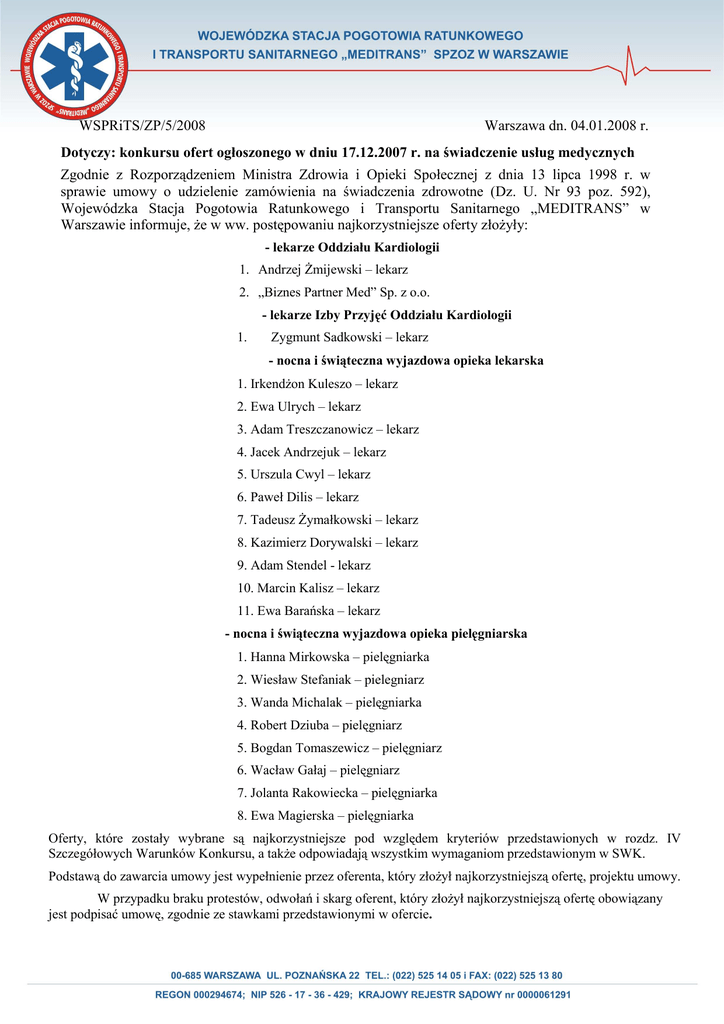 WSPRiTS/ZP/5/2008 Warszawa dn. 04.01.2008 r. Dotyczy: konkursu ofert ogłoszonego w dniu 17.12.2007 r. na świadczenie usług medycznych Zgodnie z Rozporządzeniem Ministra Zdrowia i Opieki Społecznej z dnia 13 lipca 1998 r. w sprawie umowy o udzielenie zamówienia na świadczenia zdrowotne (Dz. U. Nr 93 poz. 592), Wojewódzka Stacja Pogotowia Ratunkowego i Transportu Sanitarnego „MEDITRANS” w Warszawie informuje, Ŝe w ww. postępowaniu najkorzystniejsze oferty złoŜyły: - lekarze Oddziału Kardiologii 1. Andrzej śmijewski – lekarz 2. „Biznes Partner Med” Sp. z o.o. - lekarze Izby Przyjęć Oddziału Kardiologii 1. Zygmunt Sadkowski – lekarz - nocna i świąteczna wyjazdowa opieka lekarska 1. IrkendŜon Kuleszo – lekarz 2. Ewa Ulrych – lekarz 3. Adam Treszczanowicz – lekarz 4. Jacek Andrzejuk – lekarz 5. Urszula Cwyl – lekarz 6. Paweł Dilis – lekarz 7. Tadeusz śymałkowski – lekarz 8. Kazimierz Dorywalski – lekarz 9. Adam Stendel - lekarz 10. Marcin Kalisz – lekarz 11. Ewa Barańska – lekarz - nocna i świąteczna wyjazdowa opieka pielęgniarska 1. Hanna Mirkowska – pielęgniarka 2. Wiesław Stefaniak – pielegniarz 3. Wanda Michalak – pielęgniarka 4. Robert Dziuba – pielęgniarz 5. Bogdan Tomaszewicz – pielęgniarz 6. Wacław Gałaj – pielęgniarz 7. Jolanta Rakowiecka – pielęgniarka 8. Ewa Magierska – pielęgniarka Oferty, które zostały wybrane są najkorzystniejsze pod względem kryteriów przedstawionych w rozdz. IV Szczegółowych Warunków Konkursu, a takŜe odpowiadają wszystkim wymaganiom przedstawionym w SWK. Podstawą do zawarcia umowy jest wypełnienie przez oferenta, który złoŜył najkorzystniejszą ofertę, projektu umowy. W przypadku braku protestów, odwołań i skarg oferent, który złoŜył najkorzystniejszą ofertę obowiązany jest podpisać umowę, zgodnie ze stawkami przedstawionymi w ofercie.