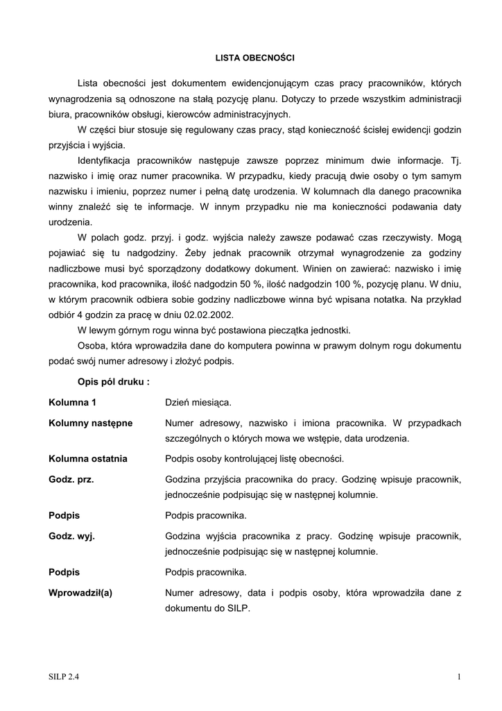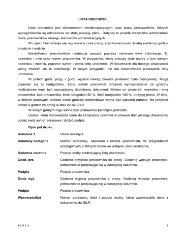 /,67$2%(&12&, /LVWD REHFQRFL MHVW GRNXPHQWHP HZLGHQFMRQXMF\P F]DV SUDF\ SUDFRZQLNyZ NWyU\FK Z\QDJURG]HQLD V RGQRV]RQH QD VWDá SR]\FM SODQX 'RW\F]\ WR SU]HGH ZV]\VWNLP DGPLQLVWUDFML biuUDSUDFRZQLNyZREVáXJLNLHURZFyZDGPLQLVWUDF\MQ\FK :F] FLELXUVWRVXMHVL UHJXORZDQ\F]DVSUDF\VWGNRQLHF]QRüFLVáHMHZLGHQFMLJRG]LQ SU]\MFLDLZ\MFLD ,GHQW\ILNDFMD SUDFRZQLNyZ QDVW SXMH ]DZV]H SRSU]H] PLQLPXP GZLH LQIRUPDFMH 7M nazwisko i LPL RUD] QXPHU SUDFRZQLND : SU]\SDGNX NLHG\ SUDFXM GZLH RVRE\ R W\P VDP\P QD]ZLVNXLLPLHQLXSRSU]H]QXPHULSHáQGDW XURG]HQLD:NROXPQDFKGODGDQHJRSUDFRZQLND ZLQQ\ ]QDOH(ü VL WH LQIRUPDFMH : LQQ\P SU]\SDGNX QLH PD NRQLHF]QRFL SRGDZDQLD GDW\ urodzenia. : SRODFK JRG] SU]\M L JRG] Z\MFLD QDOH*\ ]DZV]H SRGDZDü F]DV U]HF]\ZLVW\ 0RJ SRMDZLDü VL WX QDGJRG]LQ\ )HE\ MHGQDN SUDFRZQLN RWU]\PDá Z\QDJURG]HQLH ]D JRG]LQ\ QDGOLF]ERZH PXVL E\ü VSRU]G]RQ\ GRGDWNRZ\ GRNXPHQW :LQLHQ RQ ]DZLHUDü QD]ZLVNR L LPL SUDFRZQLNDNRGSUDFRZQLNDLORüQDGJRG]LQLORüQDGJRG]LQSR]\FM SODQX:GQLX Z NWyU\P SUDFRZQLN RGELHUD VRELH JRG]LQ\ QDGOLF]ERZH ZLQQD E\ü ZSLVDQD QRWDWND1DSU]\NáDG RGELyUJRG]LQ]DSUDF ZGQLX W lewym górn\PURJXZLQQDE\üSRVWDZLRQDSLHF]WNDMHGQRVWNL 2VREDNWyUDZSURZDG]LáDGDQHGRNRPSXWHUDSRZLQQDZSUDZ\PGROQ\PURJXGRNXPHQWX SRGDüVZyMQXPHUDGUHVRZ\L]áR*\üSRGSLV Opis pól druku : Kolumna 1 ']LHPLHVLFD .ROXPQ\QDVW SQH Numer adresowy, nazwisko i imiona pracownika. W przypadkach V]F]HJyOQ\FKRNWyU\FKPRZDZHZVW SLHGDWDXURG]HQLD Kolumna ostatnia 3RGSLVRVRE\NRQWUROXMFHMOLVW REHFQRFL Godz. prz. *RG]LQD SU]\MFLD SUDFRZQLND GR SUDF\ *RG]LQ ZSLVXMH SUDFRZQLN MHGQRF]HQLHSRGSLVXMFVL ZQDVW SQHMNROXPQLH Podpis Podpis pracownika. Godz. wyj. *RG]LQD Z\MFLD SUDFRZQLND ] SUDF\ *RG]LQ ZSLVXMH SUDFRZQLN MHGQRF]HQLHSRGSLVXMFVL ZQDVW SQHMNROXPQLH Podpis Podpis pracownika. :SURZDG]LáD Numer adresowy, data i podpis osoby, kWyUD ZSURZDG]LáD GDQH ] dokumentu do SILP. SILP 2.4 1