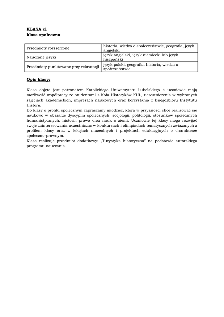KLASA cl klasa społeczna Przedmioty rozszerzone Nauczane języki Przedmioty punktowane przy rekrutacji historia, wiedza o społeczeństwie, geografia, język angielski język angielski, język niemiecki lub język hiszpański język polski, geografia, historia, wiedza o społeczeństwie Opis klasy: Klasa objęta jest patronatem Katolickiego Uniwersytetu Lubelskiego a uczniowie mają możliwość współpracy ze studentami z Koła Historyków KUL, uczestniczenia w wybranych zajęciach akademickich, imprezach naukowych oraz korzystania z księgozbioru Instytutu Historii. Do klasy o profilu społecznym zapraszamy młodzież, która w przyszłości chce realizować się naukowo w obszarze dyscyplin społecznych, socjologii, politologii, stosunków społecznych humanistycznych, historii, prawa oraz nauk o ziemi. Uczniowie tej klasy mogą rozwijać swoje zainteresowania uczestnicząc w konkursach i olimpiadach tematycznych związanych z profilem klasy oraz w lekcjach muzealnych i projektach edukacyjnych o charakterze społeczno-prawnym. Klasa realizuje przedmiot dodatkowy: „Turystyka historyczna” na podstawie autorskiego programu nauczania.