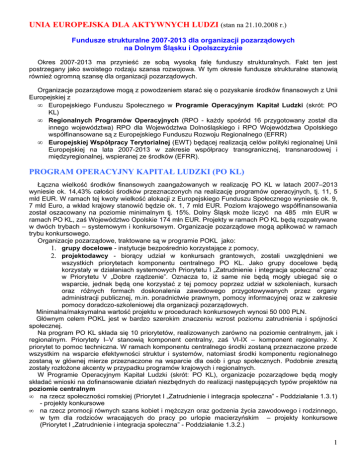 UNIA EUROPEJSKA DLA AKTYWNYCH LUDZI (stan na 21.10.2008 r.) Fundusze strukturalne 2007-2013 dla organizacji pozarządowych na Dolnym Śląsku i Opolszczyźnie Okres 2007-2013 ma przynieść ze sobą wysoką falę funduszy strukturalnych. Fakt ten jest postrzegany jako swoistego rodzaju szansa rozwojowa. W tym okresie fundusze strukturalne stanowią również ogromną szansę dla organizacji pozarządowych. Organizacje pozarządowe mogą z powodzeniem starać się o pozyskanie środków finansowych z Unii Europejskiej z • Europejskiego Funduszu Społecznego w Programie Operacyjnym Kapitał Ludzki (skrót: PO KL) • Regionalnych Programów Operacyjnych (RPO - każdy spośród 16 przygotowany został dla innego województwa) RPO dla Województwa Dolnośląskiego i RPO Województwa Opolskiego współfinansowane są z Europejskiego Funduszu Rozwoju Regionalnego (EFRR) • Europejskiej Współpracy Terytorialnej (EWT) będącej realizacją celów polityki regionalnej Unii Europejskiej na lata 2007-2013 w zakresie współpracy transgranicznej, transnarodowej i międzyregionalnej, wspieranej ze środków (EFRR). PROGRAM OPERACYJNY KAPITAŁ LUDZKI (PO KL) Łączna wielkość środków finansowych zaangażowanych w realizację PO KL w latach 2007–2013 wyniesie ok. 14,43% całości środków przeznaczonych na realizację programów operacyjnych, tj. 11, 5 mld EUR. W ramach tej kwoty wielkość alokacji z Europejskiego Funduszu Społecznego wyniesie ok. 9, 7 mld Euro, a wkład krajowy stanowić będzie ok. 1, 7 mld EUR. Poziom krajowego współfinansowania został oszacowany na poziomie minimalnym tj. 15%. Dolny Śląsk może liczyć na 485 mln EUR w ramach PO KL, zaś Województwo Opolskie 174 mln EUR. Projekty w ramach PO KL będą rozpatrywane w dwóch trybach – systemowym i konkursowym. Organizacje pozarządowe mogą aplikować w ramach trybu konkursowego. Organizacje pozarządowe, traktowane są w programie POKL jako: 1. grupy docelowe - instytucje bezpośrednio korzystające z pomocy, 2. projektodawcy - biorący udział w konkursach grantowych, zostali uwzględnieni we wszystkich priorytetach komponentu centralnego PO KL. Jako grupy docelowe będą korzystały w działaniach systemowych Priorytetu I „Zatrudnienie i integracja społeczna” oraz w Priorytetu V „Dobre rządzenie”. Oznacza to, iż same nie będą mogły ubiegać się o wsparcie, jednak będą one korzystać z tej pomocy poprzez udział w szkoleniach, kursach oraz różnych formach doskonalenia zawodowego przygotowywanych przez organy administracji publicznej, m.in. poradnictwie prawnym, pomocy informacyjnej oraz w zakresie pomocy doradczo-szkoleniowej dla organizacji pozarządowych. Minimalna/maksymalna wartość projektu w procedurach konkursowych wynosi 50 000 PLN. Głównym celem POKL jest w bardzo szerokim znaczeniu wzrost poziomu zatrudnienia i spójności społecznej. Na program PO KL składa się 10 priorytetów, realizowanych zarówno na poziomie centralnym, jak i regionalnym. Priorytety I–V stanowią komponent centralny, zaś VI-IX – komponent regionalny. X priorytet to pomoc techniczna. W ramach komponentu centralnego środki zostaną przeznaczone przede wszystkim na wsparcie efektywności struktur i systemów, natomiast środki komponentu regionalnego zostaną w głównej mierze przeznaczone na wsparcie dla osób i grup społecznych. Podobnie zresztą zostały rozłożone akcenty w przypadku programów krajowych i regionalnych. W Programie Operacyjnym Kapitał Ludzki (skrót: PO KL), organizacje pozarządowe będą mogły składać wnioski na dofinansowanie działań niezbędnych do realizacji następujących typów projektów na poziomie centralnym • na rzecz społeczności romskiej (Priorytet I „Zatrudnienie i integracja społeczna” - Poddziałanie 1.3.1) - projekty konkursowe • na rzecz promocji równych szans kobiet i mężczyzn oraz godzenia życia zawodowego i rodzinnego, w tym dla rodziców wracających do pracy po urlopie macierzyńskim – projekty konkursowe (Priorytet I „Zatrudnienie i integracja społeczna” - Poddziałanie 1.3.2.) 1 • • • • • rozwój kapitału ludzkiego w przedsiębiorstwach – projekty konkursowe (Priorytet II „Rozwój zasobów ludzkich i potencjału adaptacyjnego przedsiębiorstw oraz poprawa stanu zdrowia osób pracujących” - Poddziałanie 2.1.1.), wzmacniające efektywny system kształcenia i doskonalenia nauczycieli, modernizacja treści i metod kształcenia oraz upowszechnienie uczenia się przez całe życie - projekty konkursowe (Priorytet III „Wysoka jakość systemu oświaty” - poddziałania: 3.3.2., 3.3.4, 3.4.3), wzmacniające potencjał dydaktyczny uczelni lub rozwój kwalifikacji kadr system badań i rozwoju (B+R), jak również wzrost świadomości roli nauki w rozwoju gospodarczym (Priorytet IV „Szkolnictwo wyższe i nauka” - Poddziałanie 4.1.1. oraz działanie 4.2), rozwój i wzmocnienie potencjał III sektora, organizacji pozarządowych – projekty konkursowe na budowę sieci porozumień oraz poradnictwo obywatelskie i prawne (Priorytet V „Dobre rządzenie”, Działanie 5.4. – „Rozwój potencjału III sektora”, Poddziałanie 5.4.2 „Rozwój dialogu obywatelskiego”) wspierające współpracę pomiędzy organizacjami partnerów społecznych na poziomie terytorialnym i branżowym (Priorytet V „Dobre rządzenie”, Działanie 5.5 „Rozwój dialogu społecznego”, Podziałanie 5.5.2 „Wzmocnienie uczestników dialogu społecznego”. W PO KL organizacje pozarządowe będą mogły składać wnioski na dofinansowanie działań niezbędnych do realizacji następujących typów projektów na poziomie regionalnym: • zmierzające do wspierania osób pozostających bez zatrudnienia na regionalnym rynku pracy, wsparcia oraz promocji przedsiębiorczości i samozatrudnienia oraz inicjatywy lokalne na rzecz podnoszenia poziomu aktywności zawodowej na obszarach wiejskich (Priorytet VI „Rynek pracy otwarty dla wszy