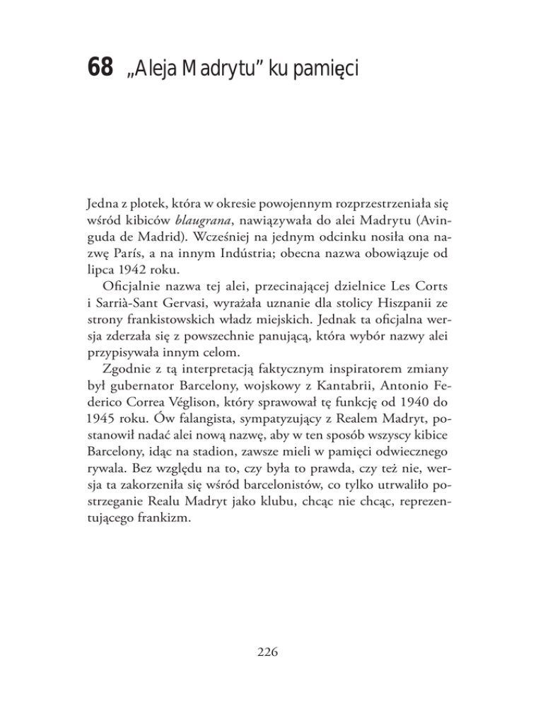 68 „Aleja Madrytu” ku pamiÚci Jedna z plotek, która w okresie powojennym rozprzestrzeniała się wśród kibiców blaugrana, nawiązywała do alei Madrytu (Avinguda de Madrid). Wcześniej na jednym odcinku nosiła ona nazwę París, a na innym Indústria; obecna nazwa obowiązuje od lipca 1942 roku. Oficjalnie nazwa tej alei, przecinającej dzielnice Les Corts i Sarrià-Sant Gervasi, wyrażała uznanie dla stolicy Hiszpanii ze strony frankistowskich władz miejskich. Jednak ta oficjalna wersja zderzała się z powszechnie panującą, która wybór nazwy alei przypisywała innym celom. Zgodnie z tą interpretacją faktycznym inspiratorem zmiany był gubernator Barcelony, wojskowy z Kantabrii, Antonio Federico Correa Véglison, który sprawował tę funkcję od 1940 do 1945 roku. Ów falangista, sympatyzujący z Realem Madryt, postanowił nadać alei nową nazwę, aby w ten sposób wszyscy kibice Barcelony, idąc na stadion, zawsze mieli w pamięci odwiecznego rywala. Bez względu na to, czy była to prawda, czy też nie, wersja ta zakorzeniła się wśród barcelonistów, co tylko utrwaliło postrzeganie Realu Madryt jako klubu, chcąc nie chcąc, reprezentującego frankizm. 226 Madridista zmieniï nazwÚ alei Wydaje się, że historia ta zyskała na wiarygodności także wśród madridistów. A przynajmniej wyjaśnia to legenda jednego z sympatyków „Królewskich”, który został przyłapany in fl agranti, kiedy we wszystkich nazwach do „de” dopisywał „l”, ponieważ dzięki temu można było przeczytać Avinguda del Madrid*. * Avinguda de Madrid to aleja Madrytu (miasta); Avinguda del Madrid – aleja Realu Madryt. 227