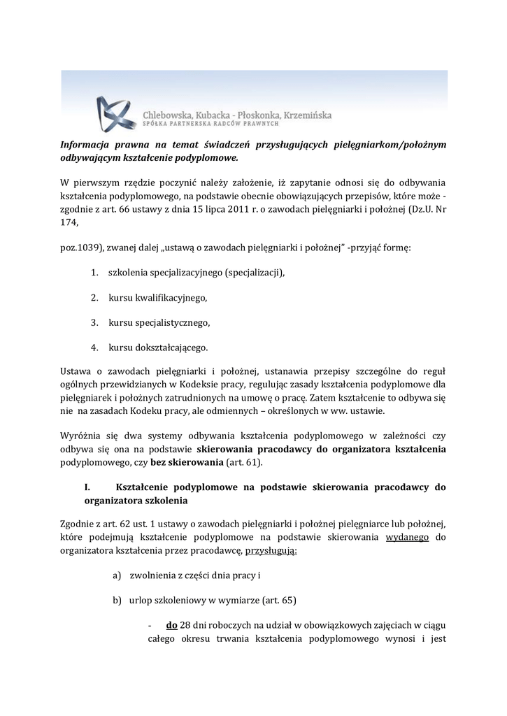 Informacja prawna na temat świadczeń przysługujących pielęgniarkom/położnym odbywającym kształcenie podyplomowe. W pierwszym rzędzie poczynić należy założenie, iż zapytanie odnosi się do odbywania kształcenia podyplomowego, na podstawie obecnie obowiązujących przepisów, które może zgodnie z art. 66 ustawy z dnia 15 lipca 2011 r. o zawodach pielęgniarki i położnej (Dz.U. Nr 174, poz.1039), zwanej dalej „ustawą o zawodach pielęgniarki i położnej” -przyjąć formę: 1. szkolenia specjalizacyjnego (specjalizacji), 2. kursu kwalifikacyjnego, 3. kursu specjalistycznego, 4. kursu dokształcającego. Ustawa o zawodach pielęgniarki i położnej, ustanawia przepisy szczególne do reguł ogólnych przewidzianych w Kodeksie pracy, regulując zasady kształcenia podyplomowe dla pielęgniarek i położnych zatrudnionych na umowę o pracę. Zatem kształcenie to odbywa się nie na zasadach Kodeku pracy, ale odmiennych – określonych w ww. ustawie. Wyróżnia się dwa systemy odbywania kształcenia podyplomowego w zależności czy odbywa się ona na podstawie skierowania pracodawcy do organizatora kształcenia podyplomowego, czy bez skierowania (art. 61). I. Kształcenie podyplomowe na podstawie skierowania pracodawcy do organizatora szkolenia Zgodnie z art. 62 ust. 1 ustawy o zawodach pielęgniarki i położnej pielęgniarce lub położnej, które podejmują kształcenie podyplomowe na podstawie skierowania wydanego do organizatora kształcenia przez pracodawcę, przysługują: a) zwolnienia z części dnia pracy i b) urlop szkoleniowy w wymiarze (art. 65) do 28 dni roboczych na udział w obowiązkowych zajęciach w ciągu całego okresu trwania kształcenia podyplomowego wynosi i jest ustalany przez pracodawcę w zależności od czasu trwania kształcenia podyplomowego. do 6 dni roboczych dla osób przystępujących do egzaminu państwowego roboczych i jest ustalany przez pracodawcę w zależności od czasu trwania kształcenia podyplomowego i egzaminów. Świadczenia te są płatne według zasad obowiązujących przy obliczaniu wynagrodzenia za urlop wypoczynkowy. Jak stwierdza przepis one przysługują czyli ustanowiono bezwzględny nakaz udzielania takich świadczeń. Pracodawca, u którego pielęgniarka lub położna na podstawie skierowania odbywa kształcenie podyplomowe zawiera z nią pielęgniarką lub położną, umowę określającą wzajemne prawa i obowiązki stron (art. 64 ust. 1). Pracodawca może przyznać pielęgniarce lub położnej, również dodatkowe świadczenia, w szczególności: 1) zwrócić koszty przejazdu, zakwaterowania i wyżywienia na zasadach obowiązujących przy podróżach służbowych na obszarze kraju, o ile nauka odbywa się w innej miejscowości niż miejsce zamieszkania i miejsce pracy pracownika; 2) pokryć opłaty za naukę pobierane przez organizatora kształcenia (w całości lub części); 3) udzielić dodatkowego urlopu szkoleniowego. Te dodatkowe świadczenia mogą – na żądanie pracodawcy w pewnych sytuacjach podlegać zwrotowi, np. w przypadku gdy w trakcie kształcenia podyplomowego lub po jego ukończeniu w terminie określonym w umowie, nie dłuższym niż 3 lata pracodawca rozwiąże stosunek pracy bez wypowiedzenia z winy pielęgniarki lub położnej II. Kształcenie podyplomowe bez skierowania pracodawcy do organizatora szkolenia Przepisy ustawy przewidują, że w takiej sytuacji może być udzielony: bezpłatny urlop i zwolnienie z części dnia pracy, bez zachowania prawa do wynagrodzenia, w wymiarze ustalonym na zasadzie porozumienia między pracodawcą a pracownikiem. Okres bezpłatnego urlopu, o którym mowa w ust. 1, wlicza się do okresu zatrudnienia u danego pracodawcy w zakresie wszelkich uprawnień wynikających z ustawy z dnia 26 czerwca 1974 r. - Kodeks pracy. Zatem świadczenia takie - w wypadku braku skierowania pracodawcy do organizatora kształcenia - nie są obligatoryjne. Przy czym należy zauważyć, że podstawową zasadą prawa pracy jest obowiązek pracodawcy ułatwiania pracownikom podnoszenia kwalifikacji zawodowych (art. 17 Kodeksu pracy). Powyższy obowiązek wynika też z art. 94 pkt 6 Kodeksu pracy. Jednakże pomimo tak brzmiących przepisów prawa pracy należy wskazać, iż pracodawca nie ma obowiązku stwarzania warunków do uzyskania określonych kwalifikacji (por. wyrok Sądu Najwyższego z dnia 25 maja 2000 r., I PKN 657/99, OSNAPiUS 2001, nr 22, poz. 660, oraz uzasadnienie uchwały Sądu Najwyższego z dnia 10 marca 2005 r., II PZP 2/05, OSNP 2005, nr 16, poz. 240), w tym obowiązku ponoszenia kosztów edukacji pracownika. Jak wynika z treści stanowiska orzecznictwa sądów do pr acodawcy należy „ułatwianie" podnoszenia kwalifik acji, przez co należy rozumieć nieodmawianie bez uzasadnionyc h przycz yn zgody na korzy stanie z wybranej przez pracownika formy kształcenia or az tworzenie pozytywnej atmosfery wobec ucz ących się pracownik ów . Pracodawca może wyrazić zgodę na kształcenie się pracownika (także w czasie pracy), jednak z żadnych przepisów nie wynika dla pracodawcy bezwzględny obowiązek ponoszenia w takiej sytuacji kosztów zdobywania przez pracownika wykształcenia. Przy czym pracodawca powinien jednak mieć na uwadze, że pominięcie pracownika w typowaniu do udziału w szkoleniach podnoszących kwalifikacje zawodowe może być uznane za naruszenie zasady równego traktowania w zatrudnieniu (art. 183b § 1 pkt 3 Kodeku pracy). Podstawowa zatem, dla odpowiedzi na zadane pytanie, kwestia tyczy się tego, czy w przypadku danego kształcenia pracodawca wystosował skierowanie do organizatora kształcenia, czy pielęgniarka sama zawierała umowę z organizatorem szkolenia. Informacja, z której wynika, iż pracodawca opłaca kurs sugeruje, iż pracodawca dokonał skierowania do organizatora kształcenia. W praktyce wygląda to w ten sposób, iż na umowach z organizatorami szkolenia pracodawca - jeżeli kieruje pielęgniarkę/położną np. na kurs -