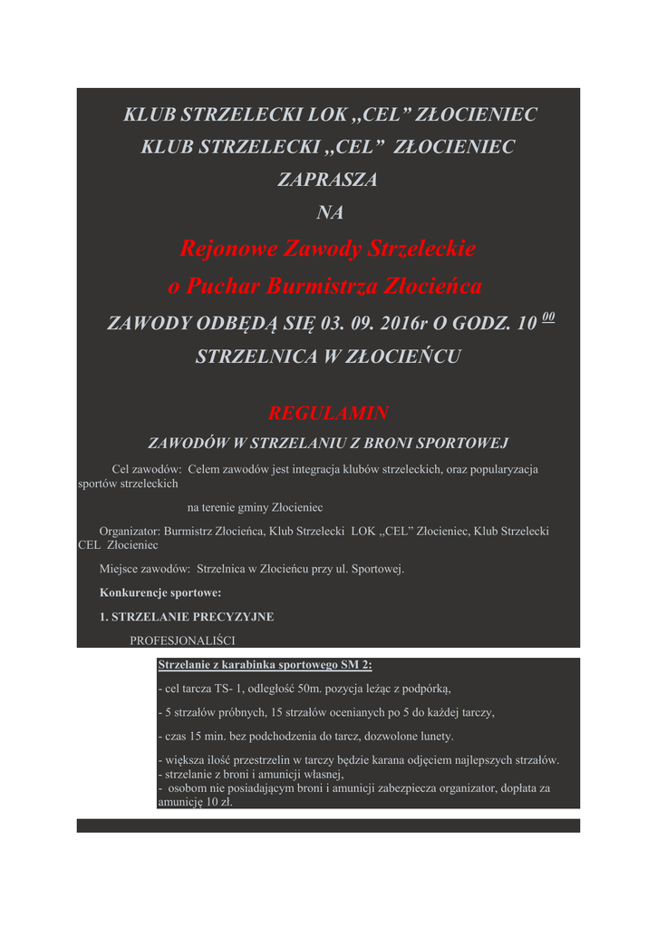 KLUB STRZELECKI LOK ,,CEL” ZŁOCIENIEC KLUB STRZELECKI ,,CEL” ZŁOCIENIEC ZAPRASZA NA Rejonowe Zawody Strzeleckie o Puchar Burmistrza Złocieńca ZAWODY ODBĘDĄ SIĘ 03. 09. 2016r O GODZ. 10 00 STRZELNICA W ZŁOCIEŃCU REGULAMIN ZAWODÓW W STRZELANIU Z BRONI SPORTOWEJ Cel zawodów: Celem zawodów jest integracja klubów strzeleckich, oraz popularyzacja sportów strzeleckich na terenie gminy Złocieniec Organizator: Burmistrz Złocieńca, Klub Strzelecki LOK ,,CEL” Złocieniec, Klub Strzelecki CEL Złocieniec Miejsce zawodów: Strzelnica w Złocieńcu przy ul. Sportowej. Konkurencje sportowe: 1. STRZELANIE PRECYZYJNE PROFESJONALIŚCI Strzelanie z karabinka sportowego SM 2: - cel tarcza TS- 1, odległość 50m. pozycja leżąc z podpórką, - 5 strzałów próbnych, 15 strzałów ocenianych po 5 do każdej tarczy, - czas 15 min. bez podchodzenia do tarcz, dozwolone lunety. - większa ilość przestrzelin w tarczy będzie karana odjęciem najlepszych strzałów. - strzelanie z broni i amunicji własnej, - osobom nie posiadającym broni i amunicji zabezpiecza organizator, dopłata za amunicję 10 zł. AMATORZY Strzelanie z karabinka sportowego SM 2: - cel tarcza TS- 1 odległość 50m. pozycja leżąc z podpórką, - 3 strzały próbne, 10 strzałów ocenianych po 5 do każdej tarczy, - czas 15 min. bez podchodzenia do tarcz, organizator zapewnia lunety, - większa ilość przestrzelin w tarczy będzie karana odjęciem najlepszych strzałów. - amatorzy tylko z broni i amunicji organizatora. Organizator ustala klasyfikacje: - zespołową: profesjonaliści, amatorzy - indywidualną profesjonaliści: senior seniorka, junior juniorka do 18 lat. - indywidualną amatorzy: senior seniorka, junior juniorka do 18 lat Warunki uczestnictwa-zgłoszenia zespołów: - profesjonaliści: zespoły 3 osobowe, oraz indywidualnie zawodnicy nie mający drużyn, - amatorzy: zespoły 3 osobowe, oraz indywidualnie zawodnicy nie mający drużyn - zgłoszenie udziału w zawodach składać telefonicznie lub mailowo do dnia 01. 09. 2016r. Krzysztof Wanecki tel. 604564280 lub Krzysztof Burak tel. 606890135. Email: [email protected] Wpisowe: 1. Profesjonaliści: 20 zł. 2. Amatorzy: 15 zł. Organizator zapewnia: posiłek w trakcie zawodów. Punktacja zawodów: - zespołowo: suma punktów uzyskanych przez 3 zawodników określa miejsce w klasyfikacji generalnej drużyny, przy równej ilości punktów decyduje ogólna ilość ,,10, 10 centralnych 9, itd.”. - indywidualnie suma punktów, przy równej ilości punktów decyduje ilość ,,10, 10 centralnych 9, itd.”. Wszelkie sprawy sporne odnośnie uzyskanych punktów przez poszczególnych zawodników, oraz drużyny będą rozpatrywane przez komisję sędziowską. Harmonogram zawodów: godz. 945 do 1000 zapisy drużyn i zawodników indywidualnych, - godz. 1000 otwarcie Zawodów Strzeleckich, - od 1200 wydawanie posiłku , ok. 1400 ogłoszenie klasyfikacji zespołowej i indywidualnej wręczenie nagród.