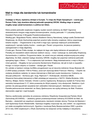 Mali to misja dla żandarmów lub komandosów 2013-01-16 Działając w Afryce, będziemy silniejsi w Europie. To misja dla Wojsk Specjalnych – ocenia gen. Roman Polko, były dowódca elitarnej jednostki specjalnej GROM. Według niego w operacji mogliby wziąć udział komandosi z Lublińca lub Gliwic. Które polskie jednostki wojskowe mogłyby wysłać swoich żołnierzy do Mali? Ogromne doświadczenie misyjne mają wojska konwencjonalne, choćby jednostki 11 Lubuskiej Dywizji Kawalerii Pancernej i 6 Brygada Powietrznodesantowa. Według gen. Bogusława Packa, rektora Akademii Obrony Narodowej, byłego szefa Żandarmerii Wojskowej, do Afryki Zachodniej pojechać powinni tylko doradcy wojskowi, którzy wspomogą lokalne wojska. – Angażowanie w tej chwili w tego typu operacje większych pododdziałów wojskowych i sprzętu byłoby trudne – uważa gen. Pacek i przypomina, że jeszcze jesteśmy zaangażowali w misję afgańską. Z kolei gen. Roman Polko dodaje, że najlepsi do tego celu będą żołnierze sił specjalnych. – Potrafią oni niewielkimi siłami dokonać wielkich rzeczy – mówi i wskazuje na Jednostkę Wojskową Komandosów z Lublińca. Przypomina także, że szkoli ona już oddziały antyterrorystyczne policji afgańskiej. Do Mali, zdaniem byłego dowódcy GROM, mogliby też pojechać żołnierze jednostki specjalnej Agat z Gliwic. – To w większości byli żandarmi. Mają doświadczenia z misji w Afryce – mówi generał. – Mogłaby to być ponownie Żandarmeria Wojskowa, tak jak to było w wypadku Konga i w dużym stopniu w Czadzie – dodaje gen. Pacek. Do udziału w każdym rodzaju konfliktu przygotowani są od stycznia żołnierze Grupy Bojowej UE. Z 2000 tysięcy przeszło 1700 to Polacy, poza tym dyżurują także Francuzi i Niemcy. – Dopóki nie zostaną określone zadania, to nasza interwencja w Mali jest czysto teoretyczna. Czekamy na decyzje polityczne – tłumaczy gen. bryg. Rajmund T. Andrzejczak, dowódca GBUE. Wsparcia francuskiej interwencji w Mali udzielają już sojusznicy z NATO: Wielka Brytania, USA, Niemcy, Belgia, Dania i Kanada. Chodzi o pomoc logistyczną. Brytyjczycy wysłali do Francji dwa samoloty transportowe C-17, które przewożą do Afryki pojazdy i inny ekwipunek. Niektóre z tych państw nie planują jednak wysyłania tam oddziałów interwencyjnych. Sekretarz obrony Leon Panetta jednoznacznie stwierdził, że Stany Zjednoczone nie wyślą żołnierzy do Mali. Podobne stanowisko zajął też i rząd brytyjski. Niemcy zaoferowały samoloty do przewozu żołnierzy Wspólnoty Gospodarczej Państw Afryki Zachodniej (ECOWAS). – Jesteśmy gotowi przetransportować żołnierzy ECOWAS do Mali, do Bamako – stwierdzili we wspólnym oświadczeniu niemiecki minister obrony Thomas de Maiziere i szef dyplomacji Guido Westerwelle. Operacja mogłaby rozpocząć się „bez zwłoki”, bo uzgodniono już wiele szczegółów technicznych. Zgodnie z rezolucją Rady Bezpieczeństwa ONZ z grudnia 2012 roku 3300 wojskowych z Afryki Zachodniej ma wesprzeć armię malijską w odzyskaniu Autor: mks, wr Strona: 1 kontroli na północą kraju. Prezydent Francois Hollande powiedział, że Francja chciałaby przekazać im prowadzenie operacji w ciągu najbliższych dni lub tygodni. O szczegółach misji dowódcy armii ECOWAS rozmawiają od wczoraj w Bamako. Szefowa dyplomacji UE Cathrine Ashton zapowiedziała przyspieszenie unijnej misji szkoleniowej. Instruktorzy wojskowi z Europy mają przygotować do walki z islamistami kilka batalionów armii Mali. Czytaj też: Polskie wojsko w Mali? ONZ daje Francuzom zielone światło NATO za interwencją francuską w Mali Francuzi mogą ugrzęznąć w wojnie Londyn wspiera interwencję w Mali Francuska interwencja w Mali. MSZ popiera Autor: mks, wr Strona: 2
