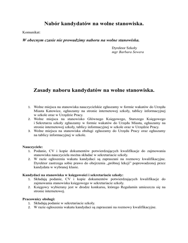 Nabór kandydatów na wolne stanowiska. Komunikat: W obecnym czasie nie prowadzimy naboru na wolne stanowiska. Dyrektor Szkoły mgr Barbara Sewera Zasady naboru kandydatów na wolne stanowiska. 1. Wolne miejsca na stanowiska nauczycielskie zgłaszamy w formie wakatów do Urzędu Miasta Katowice, ogłaszamy na stronie internetowej szkoły, tablicy informacyjnej w szkole oraz w Urzędzie Pracy. 2. Wolne miejsca na stanowisko Głównego Księgowego, Starszego Księgowego i Sekretarza szkoły zgłaszamy w formie wakatów do Urzędu Miasta, ogłaszamy na stronie internetowej szkoły, tablicy informacyjnej w szkole oraz w Urzędzie Pracy. 3. Wolne miejsca na stanowiska obsługi zgłaszamy do Urzędu Pracy oraz ogłaszamy na tablicy informacyjnej w szkole. Nauczyciele: 1. Podanie, CV i kopie dokumentów potwierdzających kwalifikacje do zajmowania stanowiska nauczyciela można składać w sekretariacie szkoły. 2. W razie ogłoszenia wakatu kandydaci są zapraszani na rozmowy kwalifikacyjne. Dyrektor zastrzega sobie prawo do obejrzenia „próbnej lekcji” poprowadzonej przez kandydata w wybranej klasie. Kandydaci na stanowiska w księgowości i sekretariacie szkoły: 1. Składają podanie, CV i kopie dokumentów potwierdzających kwalifikacje do zajmowania stanowiska księgowego w sekretariacie szkoły. 2. Księgowy wybierany jest w drodze konkursu, którego Regulamin umieszcza się na stronie internetowej. Pracownicy obsługi: 1. Składają podanie w sekretariacie szkoły. 2. W razie ogłoszenia wakatu kandydaci są zapraszani na rozmowy kwalifikacyjne.