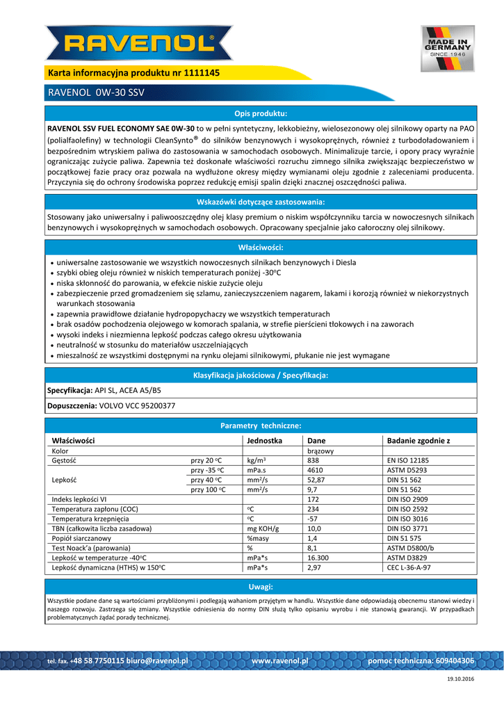 Karta informacyjna produktu nr 1111145 RAVENOL 0W-30 SSV Opis produktu: RAVENOL SSV FUEL ECONOMY SAE 0W-30 to w pełni syntetyczny, lekkobieżny, wielosezonowy olej silnikowy oparty na PAO (polialfaolefiny) w technologii CleanSynto® do silników benzynowych i wysokoprężnych, również z turbodoładowaniem i bezpośrednim wtryskiem paliwa do zastosowania w samochodach osobowych. Minimalizuje tarcie, i opory pracy wyraźnie ograniczając zużycie paliwa. Zapewnia też doskonałe właściwości rozruchu zimnego silnika zwiększając bezpieczeństwo w początkowej fazie pracy oraz pozwala na wydłużone okresy między wymianami oleju zgodnie z zaleceniami producenta. Przyczynia się do ochrony środowiska poprzez redukcję emisji spalin dzięki znacznej oszczędności paliwa. Wskazówki dotyczące zastosowania: Stosowany jako uniwersalny i paliwooszczędny olej klasy premium o niskim współczynniku tarcia w nowoczesnych silnikach benzynowych i wysokoprężnych w samochodach osobowych. Opracowany specjalnie jako całoroczny olej silnikowy. Właściwości: • • • • • • • • • uniwersalne zastosowanie we wszystkich nowoczesnych silnikach benzynowych i Diesla szybki obieg oleju również w niskich temperaturach poniżej -30oC niska skłonność do parowania, w efekcie niskie zużycie oleju zabezpieczenie przed gromadzeniem się szlamu, zanieczyszczeniem nagarem, lakami i korozją również w niekorzystnych warunkach stosowania zapewnia prawidłowe działanie hydropopychaczy we wszystkich temperaturach brak osadów pochodzenia olejowego w komorach spalania, w strefie pierścieni tłokowych i na zaworach wysoki indeks i niezmienna lepkość podczas całego okresu użytkowania neutralność w stosunku do materiałów uszczelniających mieszalność ze wszystkimi dostępnymi na rynku olejami silnikowymi, płukanie nie jest wymagane Klasyfikacja jakościowa / Specyfikacja: Specyfikacja: API SL, ACEA A5/B5 Dopuszczenia: VOLVO VCC 95200377 Parametry techniczne: Właściwości Kolor Gęstość Lepkość Indeks lepkości VI Temperatura zapłonu (COC) Temperatura krzepnięcia TBN (całkowita liczba zasadowa) Popiół siarczanowy Test Noack’a (parowania) Lepkość w temperaturze -40oC Lepkość dynamiczna (HTHS) w 150oC Jednostka przy 20 oC przy -35 oC przy 40 oC przy 100 oC kg/m3 mPa.s mm2/s mm2/s oC oC mg KOH/g %masy % mPa*s mPa*s Dane Badanie zgodnie z brązowy 838 4610 52,87 9,7 172 234 -57 10,0 1,4 8,1 16.300 2,97 EN ISO 12185 ASTM D5293 DIN 51 562 DIN 51 562 DIN ISO 2909 DIN ISO 2592 DIN ISO 3016 DIN ISO 3771 DIN 51 575 ASTM D5800/b ASTM D3829 CEC L-36-A-97 Uwagi: Wszystkie podane dane są wartościami przybliżonymi i podlegają wahaniom przyjętym w handlu. Wszystkie dane odpowiadają obecnemu stanowi wiedzy i naszego rozwoju. Zastrzega się zmiany. Wszystkie odniesienia do normy DIN służą tylko opisaniu wyrobu i nie stanowią gwarancji. W przypadkach problematycznych żądać porady technicznej. tel. fax. +48 58 7750115 [email protected] www.ravenol.pl pomoc techniczna: 609404306 19.10.2016