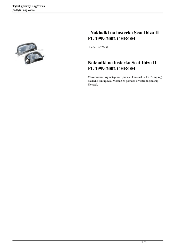 Tytuł główny nagłówka podtytuł nagłówka Nakładki na lusterka Seat Ibiza II FL 1999-2002 CHROM Cena: 69.99 zł Nakładki na lusterka Seat Ibiza II FL 1999-2002 CHROM Chromowane asymetryczne (prawa i lewa nakładka różnią się) nakładki tuningowe. Montaż za pomocą dwustronnej taśmy klejącej. 1/1 Powered by TCPDF (www.tcpdf.org)