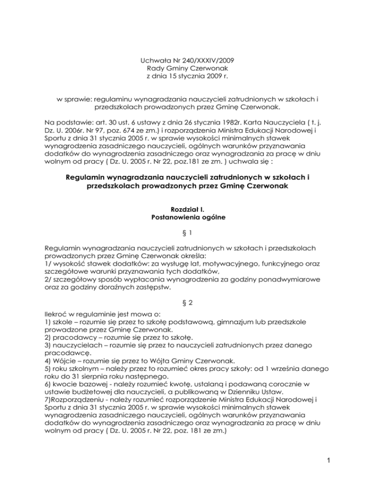 Uchwała Nr 240/XXXIV/2009 Rady Gminy Czerwonak z dnia 15 stycznia 2009 r. w sprawie: regulaminu wynagradzania nauczycieli zatrudnionych w szkołach i przedszkolach prowadzonych przez Gminę Czerwonak. Na podstawie: art. 30 ust. 6 ustawy z dnia 26 stycznia 1982r. Karta Nauczyciela ( t. j. Dz. U. 2006r. Nr 97, poz. 674 ze zm.) i rozporządzenia Ministra Edukacji Narodowej i Sportu z dnia 31 stycznia 2005 r. w sprawie wysokości minimalnych stawek wynagrodzenia zasadniczego nauczycieli, ogólnych warunków przyznawania dodatków do wynagrodzenia zasadniczego oraz wynagradzania za pracę w dniu wolnym od pracy ( Dz. U. 2005 r. Nr 22, poz.181 ze zm. ) uchwala się : Regulamin wynagradzania nauczycieli zatrudnionych w szkołach i przedszkolach prowadzonych przez Gminę Czerwonak Rozdział I. Postanowienia ogólne §1 Regulamin wynagradzania nauczycieli zatrudnionych w szkołach i przedszkolach prowadzonych przez Gminę Czerwonak określa: 1/ wysokość stawek dodatków: za wysługę lat, motywacyjnego, funkcyjnego oraz szczegółowe warunki przyznawania tych dodatków, 2/ szczegółowy sposób wypłacania wynagrodzenia za godziny ponadwymiarowe oraz za godziny doraźnych zastępstw. §2 Ilekroć w regulaminie jest mowa o: 1) szkole – rozumie się przez to szkołę podstawową, gimnazjum lub przedszkole prowadzone przez Gminę Czerwonak. 2) pracodawcy – rozumie się przez to szkołę. 3) nauczycielach – rozumie się przez to nauczycieli zatrudnionych przez danego pracodawcę. 4) Wójcie – rozumie się przez to Wójta Gminy Czerwonak. 5) roku szkolnym – naleŜy przez to rozumieć okres pracy szkoły: od 1 września danego roku do 31 sierpnia roku następnego. 6) kwocie bazowej - naleŜy rozumieć kwotę, ustalaną i podawaną corocznie w ustawie budŜetowej dla nauczycieli, a publikowaną w Dzienniku Ustaw. 7)Rozporządzeniu - naleŜy rozumieć rozporządzenie Ministra Edukacji Narodowej i Sportu z dnia 31 stycznia 2005 r. w sprawie wysokości minimalnych stawek wynagrodzenia zasadniczego nauczycieli, ogólnych warunków przyznawania dodatków do wynagrodzenia zasadniczego oraz wynagradzania za pracę w dniu wolnym od pracy ( Dz. U. 2005 r. Nr 22, poz. 181 ze zm.) 1 8) Karcie Nauczyciela – naleŜy rozumieć ustawę z dnia 26 stycznia 1982 r. Karta Nauczyciela ( t. j. Dz. U 2006 r. Nr 97, poz. 674 ze zm.) §3 1. Regulamin obejmuje wszystkich nauczycieli szkół. 2. Regulaminu nie stosuje się do pracowników szkół nie będących nauczycielami. §4 Wszystkie procenty wyliczone od kwoty bazowej określonej dla nauczycieli, ustalanej corocznie w ustawie budŜetowej podaje się w zaokrągleniu do pełnych złotych. Rozdział II. Dodatki §5 1. Nauczycielowi przysługuje dodatek za wysługę lat. 2. Wysokość dodatku określa art. 33 ust. 1. Karty Nauczyciela. 3. Okresy zatrudnienia oraz inne okresy uprawniające do dodatku określa § 7 Rozporządzenia. 4. Dodatek przysługuje: 1) począwszy od pierwszego dnia miesiąca kalendarzowego następującego po miesiącu, w którym nauczyciel nabył prawo do dodatku lub do wyŜszej stawki dodatku, jeŜeli nabycie prawa nastąpiło w ciągu miesiąca. 2) za dany miesiąc, jeŜeli nabycie prawa do dodatku lub wyŜszej jego stawki nastąpiło od pierwszego dnia miesiąca. 5. Dodatek przysługuje za okres urlopu dla poratowania zdrowia oraz za dni, za które nauczyciel otrzymuje wynagrodzenie chyba, Ŝe przepis szczególny stanowi inaczej. Dodatek ten przysługuje równieŜ za dni nieobecności w pracy wskutek choroby, bądź konieczności osobistego sprawowania opieki nad dzieckiem lub innym chorym członkiem rodziny, za które nauczyciel otrzymuje wynagrodzenie lub zasiłek z ubezpieczenia społecznego. 6. Dodatek wypłaca się z góry, w terminie wypłaty wynagrodzenia. §6 1. Ogólne warunki przyznawania nauczycielom dodatku motywacyjnego określa § 6 Rozporządzenia. 2. Kwota przeznaczona na dodatki motywacyjne dla nauczycieli na dany rok kalendarzowy jest wprowadzona do budŜetu Gminy Czerwonak dla kaŜdej szkoły zgodnie z ilością etatów wykazanych w sprawozdaniu MENiS EN – 3 ,,Sprawozdanie o stanie etatów wykazanych w dniu 10.09….” według, którego wyliczana jest subwencja oświatowa. Kwota ta stanowi dla kaŜdej grupy awansu zawodowego dwunastokrotność 5, 5 % kwoty bazowej pomnoŜonej przez ilość etatów. Kwota przeznaczona na dodatki motywacyjne dla dyrektorów, stanowi w budŜecie kaŜdej szkoły dwunastokrotność 50% podstawy wynagrodzenia zasadniczego dyrektora. 3. Dodatek nie moŜe przewyŜszać 50 % podstawy wynagrodzenia zasadniczego. 2 4. Dodatek przyznaje się nauczycielowi na czas określony, nie dłuŜszy niŜ jeden rok szkolny. 5. Nauczycielowi dodatek przyznaje dyrektor szkoły, a dyrektorowi Wójt . Wysokość dodatku motywacyjnego dla nauczyciela oraz okres jego przyznania uwzględniając poziom spełnienia warunków, o których mowa w ust 6. ustala dyrektor, a w stosunku do dyrektora Wójt. 6. Warunkiem przyznania nauczycielowi dodatku motywacyjnego jest: 1) uzyskiwanie szczególnych osiągnięć dydaktycznych, wychowawczych i opiekuńczych a w szczególności : a) uzyskiwanie przez uczniów z uwzględnieniem ich moŜliwości oraz warunków pracy nauczycieli, dobrych osiągnięć dydaktyczno- wychowawczych potwierdzanych wynikami klasyfikacji lub promocji, efektami egzaminów i sprawdzianów albo sukcesami w konkursach, zawodach, olimpiadach itp., b) umiejętne rozwiązywanie problemów wychowawczych uczniów we współpracy z rodzicami, c) pełne rozpoznanie środowiska wychowawczego uczniów, aktywne i efektywne działanie na rzecz uczniów potrzebujących szczególnej opieki. 2) jakość świadczonej pracy, w tym związanej z powierzonym stanowiskiem kierowniczym, dodatkowym zadaniem lub zajęciem, w szczególności: a) systematyczne i efektywne przygotowanie się do przydzielonych obowiązków, b) podnoszenie umiejętności zawodowych, c) wzbogacanie własnego warsztatu pracy, d) dbałość o estetyk