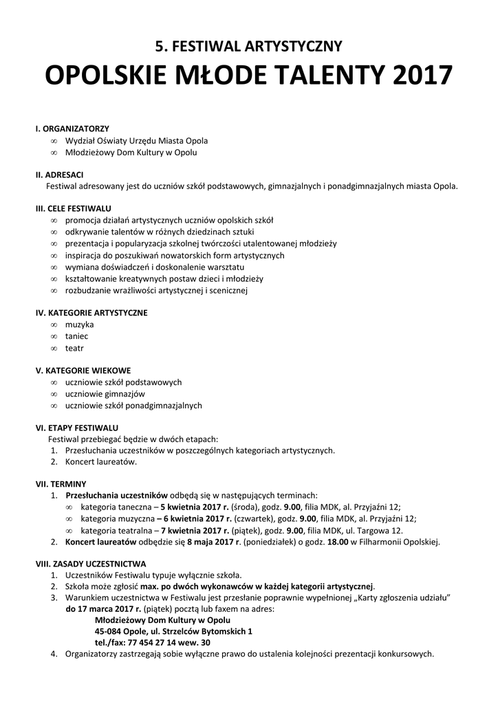5. FESTIWAL ARTYSTYCZNY OPOLSKIE MŁODE TALENTY 2017 I. ORGANIZATORZY • Wydział Oświaty Urzędu Miasta Opola • Młodzieżowy Dom Kultury w Opolu II. ADRESACI Festiwal adresowany jest do uczniów szkół podstawowych, gimnazjalnych i ponadgimnazjalnych miasta Opola. III. CELE FESTIWALU • promocja działań artystycznych uczniów opolskich szkół • odkrywanie talentów w różnych dziedzinach sztuki • prezentacja i popularyzacja szkolnej twórczości utalentowanej młodzieży • inspiracja do poszukiwań nowatorskich form artystycznych • wymiana doświadczeń i doskonalenie warsztatu • kształtowanie kreatywnych postaw dzieci i młodzieży • rozbudzanie wrażliwości artystycznej i scenicznej IV. KATEGORIE ARTYSTYCZNE • muzyka • taniec • teatr V. KATEGORIE WIEKOWE • uczniowie szkół podstawowych • uczniowie gimnazjów • uczniowie szkół ponadgimnazjalnych VI. ETAPY FESTIWALU Festiwal przebiegać będzie w dwóch etapach: 1. Przesłuchania uczestników w poszczególnych kategoriach artystycznych. 2. Koncert laureatów. VII. TERMINY 1. Przesłuchania uczestników odbędą się w następujących terminach: • kategoria taneczna – 5 kwietnia 2017 r. (środa), godz. 9.00, filia MDK, al. Przyjaźni 12; • kategoria muzyczna – 6 kwietnia 2017 r. (czwartek), godz. 9.00, filia MDK, al. Przyjaźni 12; • kategoria teatralna – 7 kwietnia 2017 r. (piątek), godz. 9.00, filia MDK, ul. Targowa 12. 2. Koncert laureatów odbędzie się 8 maja 2017 r. (poniedziałek) o godz. 18.00 w Filharmonii Opolskiej. VIII. ZASADY UCZESTNICTWA 1. Uczestników Festiwalu typuje wyłącznie szkoła. 2. Szkoła może zgłosić max. po dwóch wykonawców w każdej kategorii artystycznej. 3. Warunkiem uczestnictwa w Festiwalu jest przesłanie poprawnie wypełnionej „Karty zgłoszenia udziału” do 17 marca 2017 r. (piątek) pocztą lub faxem na adres: Młodzieżowy Dom Kultury w Opolu 45-084 Opole, ul. Strzelców Bytomskich 1 tel./fax: 77 454 27 14 wew. 30 4. Organizatorzy zastrzegają sobie wyłączne prawo do ustalenia kolejności prezentacji konkursowych. Kategoria taneczna 1. W Festiwalu mogą wziąć udział soliści, duety, miniformacje i formacje taneczne. 2. Każdy wykonawca przygotowuje 1 choreografię w dowolnej technice. 3. Czas prezentacji powinien wynosić od 2 do 4 minut. Kategoria muzyczna 1. W Festiwalu mogą wziąć udział soliści i zespoły wokalne, instrumentalne i wokalno-instrumentalne. 2. Każdy wykonawca przygotowuje 2 utwory (piosenki lub melodie) spopularyzowane przez Krajowy Festiwal Piosenki Polskiej w Opolu, z czego w konkursie zaprezentuje 1 utwór. 3. Czas prezentacji nie może przekroczyć 5 minut. Kategoria teatralna 1. W Festiwalu mogą wziąć udział zarówno zespoły, jak i wykonawcy indywidualni. 2. Forma prezentacji jest dowolna (teatr dramatyczny, pantomima, kabaret, monodram itd.). 3. Czas prezentacji nie może przekroczyć 30 minut. 4. Czas montażu i przygotowywania zespołu na scenie nie może przekroczyć 15 minut. 5. Organizatorzy nie udostępniają żadnych elementów scenograficznych i rekwizytów. IX. JURY I NAGRODY 1. Laureatów Festiwalu wyłonią powołane przez organizatorów komisje konkursowe poszczególnych kategorii. 2. Podczas koncertu laureatów zwycięskim szkołom zostanie nadany tytuł „SZKOŁA PROMUJĄCA MŁODE TALENTY”. Koordynator Festiwalu: Agnieszka Włoch tel. 608 450 503 5. FESTIWAL ARTYSTYCZNY OPOLSKIE MŁODE TALENTY 2017 KARTA ZGŁOSZENIA UDZIAŁU UWAGA! Dla każdego wykonawcy należy wypełnić ODDZIELNĄ KARTĘ. 1. Szkoła zgłaszająca: ………………………………………………………………………………………………………………………………………………. 2. Imię i nazwisko uczestnika lub nazwa zespołu: ……………………………………………………………………………………………………. …………………………………………………………………………………………………………………………………………………………………………….. 3. Kategoria wiekowa (prosimy zaznaczyć znakiem X): O szkoła podstawowa O gimnazjum O szkoła ponadgimnazjalna 4. Kategoria artystyczna (prosimy zaznaczyć tylko jedną): O muzyka O taniec O teatr 5. Tytuły utworów muzycznych / tytuł choreografii / tytuł prezentacji teatralnej: …………………………………………………………………………………………………………………………………………………………………………….. 6. Czas trwania prezentacji: ……… minut. Czas na przygotowanie (dotyczy tylko prezentacji teatralnej): ……… minut. 7. Zapotrzebowanie techniczne: ……………………………………………………………………………………………………………………………… ……………………………………………………………………………………………………………………………………………………………………………. ……………………………………………………………………………………………………………………………………………………………………………. ……………………………………………………………………………………………………………………………………………………………………………. 8. Imię i nazwisko nauczyciela - opiekuna artystycznego: ……………………………………………………………………………………….. 9. Kontakt z nauczycielem: telefon ………………………………… e-mail ……………………………………………………………………………. UWAGA! Zgłoszenie uczestnictwa jest równoznaczne z akceptacją regulaminu Festiwalu. ………………………………………………… …………………………