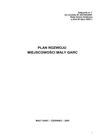 Załącznik nr 1 do uchwały Nr XX/185/2005 Rady Gminy Subkowy z dnia 05 lipca 2005 r. PLAN ROZWOJU MIEJSCOWOŚCI MAŁY GARC MAŁY GARC – CZERWIEC – 2005 1 1. WSTĘP 1.1 CEL OPRACOWANIA Prezentowany Plan Rozwoju Miejscowości Mały Garc, to dokument określający przedsięwzięcia infrastrukturalne zaplanowane na terenie miejscowości Mały Garc w latach 2005 - 2006. W okresie tym zaplanowane jest tylko jedno przedsięwzięcie „Budowa Wiejskiego Domu Kultury w Małym Garcu”. Jednocześnie Plan Rozwoju Miejscowości Mały Garc stanowi podstawę do wypracowania wieloletniego planu zadań infrastrukturalnych na lata 2007-2013 oraz przemian społecznych w sołectwie i wsi Mały Garc. Priorytety rozwoju miejscowości zawarte w Planie Rozwoju Miejscowości Mały Garc wynikają z wizji rozwoju wsi Mały Garc, która w swych założeniach służyć ma mobilizacji lokalnych społeczności do: podejmowania przedsięwzięć na rzecz poprawy warunków i jakości życia na wsi, tworzenia warunków dla rozwoju funkcji gospodarczych oraz społecznych i kulturalnych wsi, wspierania realizacji działań inwestycyjnych z zakresu modernizacji remontów oraz wyposażenia obiektów pełniących funkcje kulturalne, rekreacyjne i sportowe, odnowy obiektów charakterystycznych dla tradycji budownictwa wiejskiego regionu i ich adaptacja na cele kulturalne i społeczne, modernizacji przestrzeni publicznej we wsi (chodniki, place, parki, rynki, parkingi, itp.), wspierania rozwoju publicznej infrastruktury związanej z rozwojem funkcji turystycznych wsi, promocji regionu. Dla realizacji właśnie tych potrzeb, wychodząc na przeciw inicjatywie mieszkańców, przy udziale Rady Sołeckiej oraz Samorządu Gminy Subkowy powstał niniejszy Plan. Przedsięwzięcia w nim ujęte, to zadania dalekosiężne. Ich realizacja musi być zsynchronizowana z innymi działaniami infrastrukturalnymi, zaplanowanymi na terenie gminy oraz na obszarach poszczególnych sołectw. Stąd też, Plan Rozwoju Miejscowości Mały Garc, jest zgodny z Planem Rozwoju 2 Lokalnego Gminy 1 , obraną Strategią Rozwoju Gminy Subkowy 2 oraz wytycznymi zawartymi w Rozporządzeniu Ministra Rolnictwa i Rozwoju Wsi z dnia 17 grudnia 2004 r. w sprawie trybu składania i wzoru wniosku o dofinansowanie realizacji projektu w ramach Sektorowego Programu Operacyjnego „Restrukturyzacja i modernizacja sektora żywnościowego oraz rozwój obszarów wiejskich 2004 – 2006” w zakresie działania „Odnowa wsi oraz zachowanie i ochrona dziedzictwa kulturowego”. 1.2. PRZEDMIOT OPRACOWANIA Na opracowanie Planu Rozwoju Miejscowości Mały Garc składa się: Charakterystyka miejscowości Planowane kierunki rozwoju miejscowości na bazie wizji rozwoju wsi Mały Garc Inwentaryzacja istniejących zasobów służąca ujęciu stanu rzeczywistego Ocena mocnych i słabych stron miejscowości Opis planowanego przedsięwzięcia Szacunkowy kosztorys planowanego przedsięwzięcia Harmonogram planowanego przedsięwzięcia Uzasadnienia przyjęcia Planu Rozwoju Miejscowości Mały Garc 1 2 PRL Gminy – Uchwała Nr XVI/162/05 Rady Gminy Subkowy z dnia 27 stycznia 2005 r. Gmina Subkowy posiada Strategię Rozwoju Gminy do 2015 roku, zatwierdzoną uchwałą Rady Gminy Nr XVII/136/2000 z dnia 24.08.2000r. w sprawie przyjęcia Strategii Rozwoju Gminy Subkowy. 3 2. CHARAKTERYSTYKA WSI MAŁY GARC 2.1 INFORMACJE OGÓLNE Sołectwo Mały Garc, położone jest w powiecie tczewskim, na terenie gminy Subkowy, 6 km od miejscowości Subkowy, w kierunku południowo – wschodnim ku dolinie Wisły, na granicy z Gminą Pelplin. 2.2 RYS HISTORYCZNY WSI Tradycja osadnicza Małego Garca sięga drugiej połowy XIII w. Pierwsza wzmianka w dokumentach pochodzi z roku 1282, kiedy to książę Mestwin II wymieniony jest jako właściciel małego Garca. Po wojnie trzynastoletniej dobra te stały się własnością cystersów pelplińskich i oddawane były w dzierżawę z przerwami do II połowy XIX wieku. W tym czasie właścicielami majątku M. Garc została rodzina Loewenthalów, która to doprowadziła do jego rozkwitu. W części dworskiej wzniesiono okazały dwupiętrowy budynek, wokół którego założono park w oparciu o istniejący i nowo sadzony drzewostan. Ponad to, z roku na rok kolejni Loewenthalowie powiększali i unowocześniali część folwarczną majątku. Na początku lat 20 –tych XX wieku majątek został sprzedany rodzinie, Radzymińskich, którzy to gospodarowali nim wzorcowo do wybuchu II wojny światowej. Po wyzwoleniu Radzymińscy, których zawierucha wojenna przeniosła do Ameryki, otrzymali od rządu polskiego odszkodowanie za pozostawione mienie, a majątek stał 4 się własnością Skarbu Państwa. Na jego bazie utworzone zostały PGR. Działalność państwowego gospodarstwa przyczyniła się do częściowej utraty zabytkowego charakteru posiadłości jak i też do znacznego zubożenia jej części parkowej. W czerwcu 1994 roku gospodarstwo wraz z częścią dworsko-parkową przejął w dzierżawę były dyrektor PGR mgr inż. Stanisław Dziak, który po dwóch latach został jego właścicielem. Oddanie majątku w ręce fachowca miło pozytywny wpływ na zachowanie zabytkowego charakteru majątku jak i na sytuację społeczno – gospodarczą. Ludność wsi Mały Garc Sołectwo Mały Garc zamieszkuje 183 osoby. Stanowi to blisko 4 % całkowitej liczby populacji mieszkańców gminy. Z pośród grupy wiekowej od 18 do 65 lat zdecydowaną większość stanowią ludzie młodzi oraz osoby w wieku średnim. Środowisko przyrodnicze Sołectwo Mały Garc usytuowane jest w obszarze doliny dolnej Wisły, nieopodal Niziny Walichnowskiej. Na obrzeżu sołectwa znajduje się Jezioro Pelplińskie o pow. 17,84 ha z charakterystycznym rozcięciem erozyjnym w skarpie starorzecza Wisły. Jezioro jest połączone z Wisłą, dlatego też, ichtiofauna zbiornika jest zbliżona do składu gatunkowego rzeki. Są to tereny bogate w różnorodne zespoły roślinne z skrzypami bagiennymi, ze