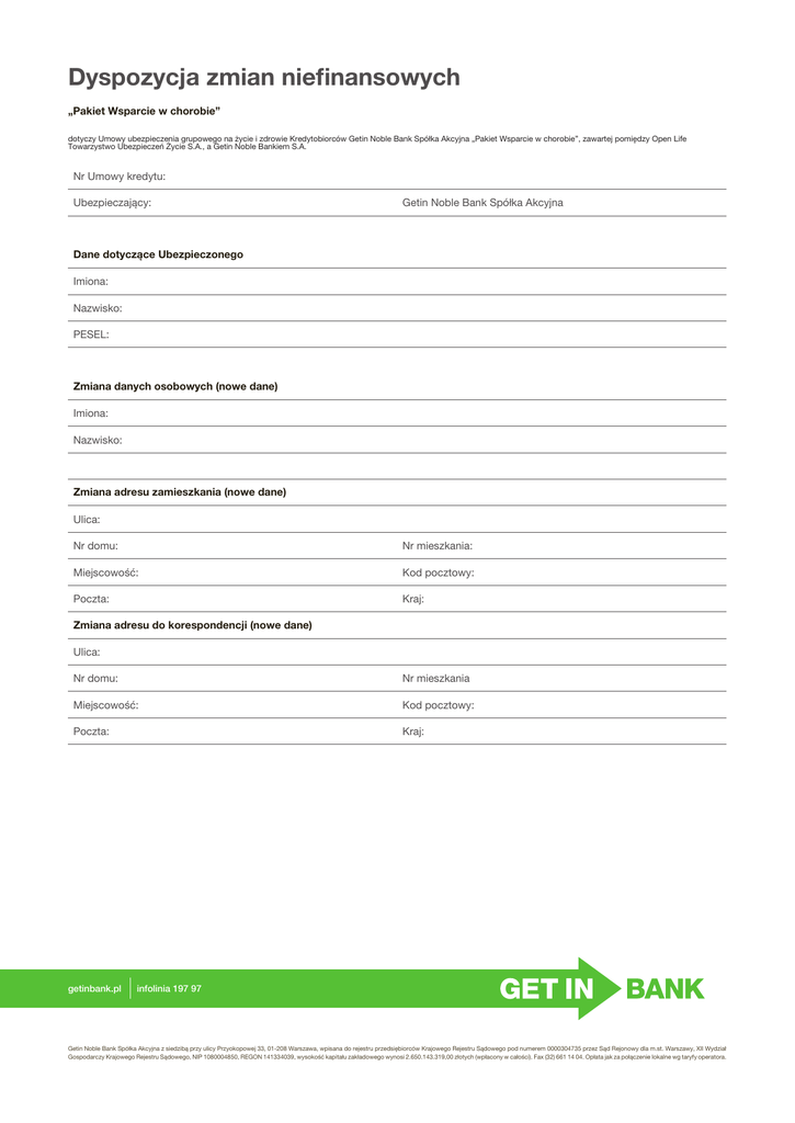 Dyspozycja zmian niefinansowych „Pakiet Wsparcie w chorobie” dotyczy Umowy ubezpieczenia grupowego na życie i zdrowie Kredytobiorców Getin Noble Bank Spółka Akcyjna „Pakiet Wsparcie w chorobie”, zawartej pomiędzy Open Life Towarzystwo Ubezpieczeń Życie S.A., a Getin Noble Bankiem S.A. Nr Umowy kredytu: Ubezpieczający: Getin Noble Bank Spółka Akcyjna Dane dotyczące Ubezpieczonego Imiona: Nazwisko: PESEL: Zmiana danych osobowych (nowe dane) Imiona: Nazwisko: Zmiana adresu zamieszkania (nowe dane) Ulica: Nr domu: Nr mieszkania: Miejscowość: Kod pocztowy: Poczta: Kraj: Zmiana adresu do korespondencji (nowe dane) Ulica: Nr domu: Nr mieszkania Miejscowość: Kod pocztowy: Poczta: Kraj: getinbank.pl infolinia 197 97 Getin Noble Bank Spółka Akcyjna z siedzibą przy ulicy Przyokopowej 33, 01-208 Warszawa, wpisana do rejestru przedsiębiorców Krajowego Rejestru Sądowego pod numerem 0000304735 przez Sąd Rejonowy dla m.st. Warszawy, XII Wydział Gospodarczy Krajowego Rejestru Sądowego, NIP 1080004850, REGON 141334039, wysokość kapitału zakładowego wynosi 2.650.143.319,00 złotych (wpłacony w całości). Fax (32) 661 14 04. Opłata jak za połączenie lokalne wg taryfy operatora. Zmiana Uposażonych (nowe dane) Niniejszym unieważniam wszystkie swoje poprzednie dyspozycje dotyczące Uposażonych i nie wyznaczam Uposażonych. Niniejszym unieważniam wszystkie swoje poprzednie dyspozycje dotyczące Uposażonych i jednocześnie wyznaczam, jako Uposażonych następujące osoby: 1. Dane Uposażonego: Imiona: Nazwisko/Nazwa: PESEL albo data urodzenia/ REGON: Udział w świadczeniu: Adres do korespondencji Ulica: Nr domu: Nr mieszkania: Miejscowość: Kod pocztowy: Poczta: Kraj: 2. Dane Uposażonego: Imiona: Nazwisko/Nazwa: PESEL albo data urodzenia/ REGON: Udział w świadczeniu: Adres do korespondencji Ulica: Nr domu: Nr mieszkania: Miejscowość: Kod pocztowy: Poczta: Kraj: 3. Dane Uposażonego: Imiona: Nazwisko/Nazwa: PESEL albo data urodzenia/ REGON: Udział w świadczeniu: Adres do korespondencji Ulica: Nr domu: Nr mieszkania: Miejscowość: Kod pocztowy: Poczta: Kraj: getinbank.pl infolinia 197 97 Getin Noble Bank Spółka Akcyjna z siedzibą przy ulicy Przyokopowej 33, 01-208 Warszawa, wpisana do rejestru przedsiębiorców Krajowego Rejestru Sądowego pod numerem 0000304735 przez Sąd Rejonowy dla m.st. Warszawy, XII Wydział Gospodarczy Krajowego Rejestru Sądowego, NIP 1080004850, REGON 141334039, wysokość kapitału zakładowego wynosi 2.650.143.319,00 złotych (wpłacony w całości). Fax (32) 661 14 04. Opłata jak za połączenie lokalne wg taryfy operatora. 4. Dane Uposażonego: Imiona: Nazwisko/Nazwa: PESEL albo data urodzenia/ REGON: Udział w świadczeniu: Adres do korespondencji Ulica: Nr domu: Nr mieszkania: Miejscowość: Kod pocztowy: Poczta: Kraj: 5. Dane Uposażonego: Imiona: Nazwisko/Nazwa: PESEL albo data urodzenia/ REGON: Udział w świadczeniu: Adres do korespondencji Ulica: Nr domu: Nr mieszkania: Miejscowość: Kod pocztowy: Poczta: Kraj: MIEJSCOWOŚĆ I DATA ZŁOŻENIA DYSPOZYCJI PODPIS UBEZPIECZONEGO Potwierdzenie przyjęcia oświadczenia. Potwierdzenie zgodności danych Ubezpieczonego z dokumentem tożsamości. DATA, MIEJSCOWOŚĆ getinbank.pl IMIĘ I NAZWISKO, PIECZĄTKA I PODPIS UPOWAŻNIONEGO PRZEDSTAWICIELA BANKU infolinia 197 97 Getin Noble Bank Spółka Akcyjna z siedzibą przy ulicy Przyokopowej 33, 01-208 Warszawa, wpisana do rejestru przedsiębiorców Krajowego Rejestru Sądowego pod numerem 0000304735 przez Sąd Rejonowy dla m.st. Warszawy, XII Wydział Gospodarczy Krajowego Rejestru Sądowego, NIP 1080004850, REGON 141334039, wysokość kapitału zakładowego wynosi 2.650.143.319,00 złotych (wpłacony w całości). Fax (32) 661 14 04. Opłata jak za połączenie lokalne wg taryfy operatora.