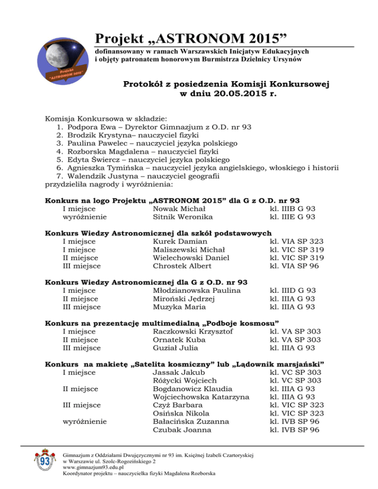 Projekt „ASTRONOM 2015” dofinansowany w ramach Warszawskich Inicjatyw Edukacyjnych i objęty patronatem honorowym Burmistrza Dzielnicy Ursynów Protokół z posiedzenia Komisji Konkursowej w dniu 20.05.2015 r. Komisja Konkursowa w składzie: 1. Podpora Ewa – Dyrektor Gimnazjum z O.D. nr 93 2. Brodzik Krystyna– nauczyciel fizyki 3. Paulina Pawelec – nauczyciel języka polskiego 4. Rozborska Magdalena – nauczyciel fizyki 5. Edyta Świercz – nauczyciel języka polskiego 6. Agnieszka Tymińska – nauczyciel języka angielskiego, włoskiego i historii 7. Walendzik Justyna – nauczyciel geografii przydzieliła nagrody i wyróżnienia: Konkurs na logo Projektu „ASTRONOM 2015” dla G z O.D. nr 93 I miejsce Nowak Michał kl. IIIB G 93 wyróżnienie Sitnik Weronika kl. IIIE G 93 Konkurs Wiedzy Astronomicznej dla szkół podstawowych I miejsce Kurek Damian kl. I miejsce Maliszewski Michał kl. II miejsce Wielechowski Daniel kl. III miejsce Chrostek Albert kl. Konkurs Wiedzy Astronomicznej dla G z O.D. nr 93 I miejsce Młodzianowska Paulina II miejsce Miroński Jędrzej III miejsce Muzyka Maria VIA SP 323 VIC SP 319 VIC SP 319 VIA SP 96 kl. IIID G 93 kl. IIIA G 93 kl. IIIA G 93 Konkurs na prezentację multimedialną „Podboje kosmosu” I miejsce Raczkowski Krzysztof kl. VA SP 303 II miejsce Ornatek Kuba kl. VA SP 303 III miejsce Guział Julia kl. IIIA G 93 Konkurs na makietę „Satelita kosmiczny” lub „Lądownik marsjański” I miejsce Jassak Jakub kl. VC SP 303 Różycki Wojciech kl. VC SP 303 II miejsce Bogdanowicz Klaudia kl. IIIA G 93 Wojciechowska Katarzyna kl. IIIA G 93 III miejsce Czyż Barbara kl. VIC SP 323 Osińska Nikola kl. VIC SP 323 wyróżnienie Bałacińska Zuzanna kl. IVB SP 96 Czubak Joanna kl. IVB SP 96 Gimnazjum z Oddziałami Dwujęzycznymi nr 93 im. Księżnej Izabeli Czartoryskiej w Warszawie ul. Szolc-Rogozińskiego 2 www.gimnazjum93.edu.pl Koordynator projektu – nauczycielka fizyki Magdalena Rozborska Projekt „ASTRONOM 2015” dofinansowany w ramach Warszawskich Inicjatyw Edukacyjnych i objęty patronatem honorowym Burmistrza Dzielnicy Ursynów Konkurs fotograficzny „Fazy Księżyca” I miejsce Andrzejewska Oliwia II miejsce Popławska Natalia III miejsce Wittke Zuzanna kl. IVC SP 81 kl. VIB SP 96 kl. VIB SP 96 Konkurs na film „Start mojej rakiety kosmicznej” lub „Miękkie lądowanie” I miejsce Jassak Jakub kl. VC SP 303 II miejsce Wycech Tomasz kl. IIIB G 93 III miejsce Cieślak Bartłomiej kl. VC SP 303 wyróżnienie Kamiński Michał kl. IIIB G 93 Nagród za I miejsce Nagród za II miejsce Nagród za III miejsce Wyróżnień Gimnazjum z Oddziałami Dwujęzycznymi nr 93 im. Księżnej Izabeli Czartoryskiej w Warszawie ul. Szolc-Rogozińskiego 2 www.gimnazjum93.edu.pl Koordynator projektu – nauczycielka fizyki Magdalena Rozborska Razem: 9 7 7 4