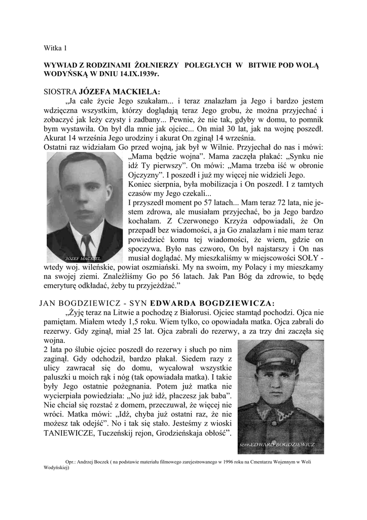 Witka 1 WYWIAD Z RODZINAMI ŻOŁNIERZY POLEGŁYCH W BITWIE POD WOLĄ WODYŃSKĄ W DNIU 14.IX.1939r. SIOSTRA JÓZEFA MACKIELA: „Ja całe życie Jego szukałam... i teraz znalazłam ja Jego i bardzo jestem wdzięczna wszystkim, którzy doglądają teraz Jego grobu, że można przyjechać i zobaczyć jak leży czysty i zadbany... Pewnie, że nie tak, gdyby w domu, to pomnik bym wystawiła. On był dla mnie jak ojciec... On miał 30 lat, jak na wojnę poszedł. Akurat 14 września Jego urodziny i akurat On zginął 14 września. Ostatni raz widziałam Go przed wojną, jak był w Wilnie. Przyjechał do nas i mówi: „Mama będzie wojna”. Mama zaczęła płakać: „Synku nie idź Ty pierwszy”. On mówi: „Mama trzeba iść w obronie Ojczyzny”. I poszedł i już my więcej nie widzieli Jego. Koniec sierpnia, była mobilizacja i On poszedł. I z tamtych czasów my Jego czekali... I przyszedł moment po 57 latach... Mam teraz 72 lata, nie jestem zdrowa, ale musiałam przyjechać, bo ja Jego bardzo kochałam. Z Czerwonego Krzyża odpowiadali, że On przepadł bez wiadomości, a ja Go znalazłam i nie mam teraz powiedzieć komu tej wiadomości, że wiem, gdzie on spoczywa. Było nas czworo, On był najstarszy i On nas musiał doglądać. My mieszkaliśmy w miejscowości SOŁY wtedy woj. wileńskie, powiat oszmiański. My na swoim, my Polacy i my mieszkamy na swojej ziemi. Znaleźliśmy Go po 56 latach. Jak Pan Bóg da zdrowie, to będę emeryturę odkładać, żeby tu przyjeżdżać.” JAN BOGDZIEWICZ - SYN EDWARDA BOGDZIEWICZA : „Żyję teraz na Litwie a pochodzę z Białorusi. Ojciec stamtąd pochodzi. Ojca nie pamiętam. Miałem wtedy 1,5 roku. Wiem tylko, co opowiadała matka. Ojca zabrali do rezerwy. Gdy zginął, miał 25 lat. Ojca zabrali do rezerwy, a za trzy dni zaczęła się wojna. 2 lata po ślubie ojciec poszedł do rezerwy i słuch po nim zaginął. Gdy odchodził, bardzo płakał. Siedem razy z ulicy zawracał się do domu, wycałował wszystkie paluszki u moich rąk i nóg (tak opowiadała matka). I takie były Jego ostatnie pożegnania. Potem już matka nie wycierpiała powiedziała: „No już idź, płaczesz jak baba”. Nie chciał się rozstać z domem, przeczuwał, że więcej nie wróci. Matka mówi: „Idź, chyba już ostatni raz, że nie możesz tak odejść”. No i tak się stało. Jesteśmy z wioski TANIEWICZE, Tuczeńskij rejon, Grodzieńskaja obłość”. Opr.: Andrzej Boczek ( na podstawie materiału filmowego zarejestrowanego w 1996 roku na Cmentarzu Wojennym w Woli Wodyńskiej)