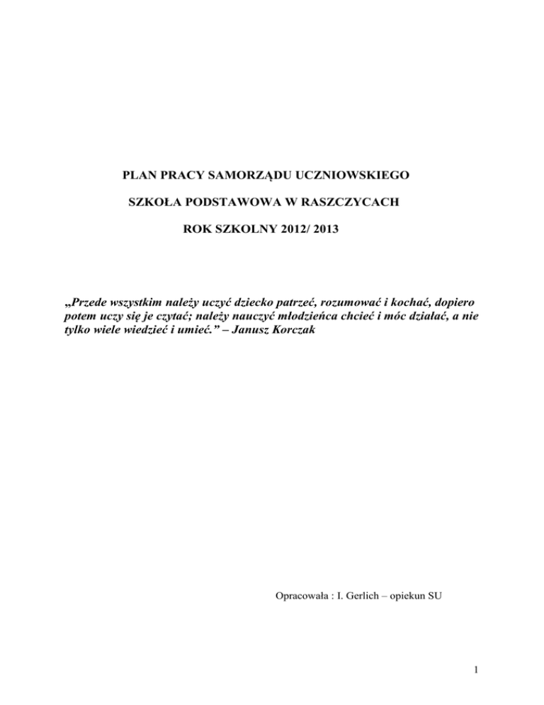 PLAN PRACY SAMORZĄDU UCZNIOWSKIEGO SZKOŁA PODSTAWOWA W RASZCZYCACH ROK SZKOLNY 2012/ 2013 „Przede wszystkim należy uczyć dziecko patrzeć, rozumować i kochać, dopiero potem uczy się je czytać; należy nauczyć młodzieńca chcieć i móc działać, a nie tylko wiele wiedzieć i umieć.” – Janusz Korczak Opracowała : I. Gerlich – opiekun SU 1 Opiekun Samorządu Uczniowskiego: mgr Ilona Gerlich Zarząd Przewodnicząca: Monika Cuber Zastępcy przewodniczącej: Angelika Hajduczek Szymon Smołka Sekcja kulturalna: Szef: Wiktoria Wranik Członkowie: Monika Cuber, Emilia Drożdż, Jeskia Goliwąs, Mirela Halama, Piotr Procek, Szymon Smołka, Wiktoria Kokot, Martyna Lincner, Dawid Grzonka, Dawid Kuszneruk, Patryk Gajda Sekcja dekoracyjna: Szef: Mirela Halama Członkowie: Dominika Gembalczyk, Kamila Aksman, Agata Kocjan, Marcela Waśko, Emilia Powała, Paulina Piontek, Andrzej Palica, Wiktoria Wranik, Wiktoria Kokot, Mateusz Pytel, Jesika Goliwąs, Monika Cuber, Emilia Drożdż, Martyna Lincner, Martyna Siedlaczek Sekcja porządkowa: Szef: Jesika Goliwąs, Członkowie: Kamila Aksman, Agata Kocjan, Paulina Piontek, Andrzej Palica, Wiktoria Wranik, Wiktoria Kokot, Mateusz Pytel, Monika Cuber, Emilia Drożdż, Martyna Lincner, Martyna Siedlaczek, Piotr Procek, Adam Węglorz, Tomasz Stoś, Marcela Waśko Sekcja sportowa: Szef: Szymon Smołka Członkowie: Emilia Powała, Radosław Kokot, Łukasz Bytomski, Kevin Halama, Dawid Kuszneruk, Dawid Grzonka, Patryk Gajda, Mateusz Henek, Milan Mrozek, Paulina Piontek, Andrzej Palica, Wiktoria Wranik, Wiktoria Kokot, Mateusz Pytel, Monika Cuber, Emilia Drożdż, Martyna Lincner, Martyna Siedlaczek, Piotr Procek, Adam Węglorz, Tomasz Stoś, Sekcja techniczna: Szef: Kacper Gawron Członkowie: Szymon Pielczyk, Łukasz Groń, Łukasz Bytomski, Milan Mrozek, Mateusz Henek, Adam Węglorz, Kamil Konieczny, Kamil Gawlik, Dawid Grzonka, Dawid Kuszneruk, Jakub Powała, Martyna Lincner Sekcja pomocy koleżeńskiej: Szef: Angelika Hajduczek Członkowie: Monika Cuber, Emilia Drożdż, Wiktoria Wranik, Jesika Goliwąs, Adam Węglorz, Szymon Pielczyk 2 I. Organizacja pracy Samorządu Uczniowskiego w nowym roku szkolnym. 1. Wybory samorządów klasowych. 2. Przeprowadzenie wyborów na stanowisko opiekuna SU. 3. Uruchomienie działalności Samorządu Uczniowskiego – wybory zarządu, poszczególnych sekcji. 4. Opracowanie planu pracy z uwzględnieniem a) koncepcji pracy szkoły na rok 2012/2013 b) regulaminu SU c) propozycji uczniów 5. Ustalenie terminów spotkań SU, apeli SU. 6. Przepływ informacji w formie ustnej, pisemnej- tablica informacyjna na korytarzu, apele SU 7. Reaktywowanie gazetki szkolnej” Szkolny Szpieg” Osoby odpowiedzialne: wychowawcy klas, opiekun SU, dyrekcja, redaktorzy Martyna Lincner, Marcela Waśko Termin realizacji: wrzesień, październik, II. Uczestnictwo w pracy szkoły. Kształtowanie odpowiedzialności za podejmowane zadania; Dbanie o mienie szkolne i bezpieczeństwo w szkole. 1. Działalność SU wg opracowanego planu pracy. 2. Zapoznanie się z regulaminem. a) Praw i obowiązków ucznia b) Wewnątrzszkolnego systemu oceniania. 3. Współpraca SU z: a) dyrekcją szkoły b) wychowawcami klas c) biblioteką i świetlicą środowiskową d) pracownikami obsługi i administracji e) innymi organizacjami, kołami zainteresowań działającymi na terenie szkoły. 4. Organizacja i funkcjonowanie dyżurów na terenie szkoły. 5. Udział sekcji porządkowej w sprawdzaniu obuwia zmiennego oraz czystości w szatnikonkurs na najczystszy boks w szatni. 6. Dbałość o ład i estetykę sal lekcyjnych, toalet i korytarzy. 7. Podejmowanie prac społecznych na rzecz klasy i szkoły 8. Przestrzeganie zasad kulturalnego zachowania w salach lekcyjnych, na korytarzach, na terenie szkoły i poza nią, w czasie imprez szkolnych, sportowych 9. Pomoc i dyżury w bibliotece szkolnej. Osoby odpowiedzialne: wychowawcy klas, opiekun SU, zarząd SU, Monika Cuber, sekcja porządkowa, kierownik sekcji- Jesika Goliwąs, wszyscy uczniowie Termin realizacji: cały rok III. Edukacja ekologiczna. 1. Udział w akcjach ekologicznych: „Sprzątanie Świata” i Światowych Obchodach Dnia Ziemi. 3 2. 3. 4. 5. 6. 7. Udział SU w pracach porządkowych na rzecz szkoły i najbliższego otoczenia Udział w konkursach wiedzy i plastycznych o tematyce ekologicznej Zapoznanie uczniów z problemami ekologii Segregacja śmieci na trenie szkoły, miejsca zamieszkania Zbiórka makulatury, baterii, puszek prowadzona w szkole Wyjścia do Łężczoka, Rud, Szkółki Kontenerowej w Nędzy i itp. Osoby odpowiedzialne: nauczyciel przyrody, wychowawcy klas, opiekun SU, wszyscy nauczyciele i uczniowie Termin realizacji: wrzesień, wg terminów planu pracy szkoły i godz wych, cały rok, IV. Edukacja zdrowotna. 1. Dbanie o higienę osobistą, estetykę ubioru. 2. Kultura spędzania wolnego czasu: a) wyjścia na basen b) wyjścia do kina, teatru, muzeum, wystawę c) udział w zawodach sportowych d) udział w imprezach towarzyskich- szkolnych lub środowiskowych 3. Higiena pracy a) dyscyplina na lekcjach, w autobusie, podczas wyjść i wycieczek b) ograniczenie hałasu na przerwach 4. Udział w akcjach : „ Trzeźwy Umysł „ oraz „ Sznupek” 5. Współpraca z pielęgniarką – pogadanki z o higienie osobistej 6. Współpraca z logopedą i ortopedą. 7. Współpraca z Poradnią Pedagogiczno- Psychologiczną 8. Śniadanie jako najważniejszy posiłek – pogadanki na temat właściwego, racjonalnego odżywiania 9. Udział w akcji : „Owoce i warzywa w szkole” 10. Realizacje zadań z planu Szkoły Promującej Zdrowie 11. Instruktaż udzielania pierwszej pomocy w ramach akcji: „Ratujemy i uczymy ratować” J. Owsiaka Osoby odpowiedzialne: opiekun SU, wszyscy nauczyciele, pielęgniarka, logopeda Termin realizacji: cały rok, V. Edukacja europejska. 1. Poznanie podstawowych informacji o Unii Europejskiej . 2. Popularyzowanie nauki języka angielskiego i niemieckiego w szkole popr