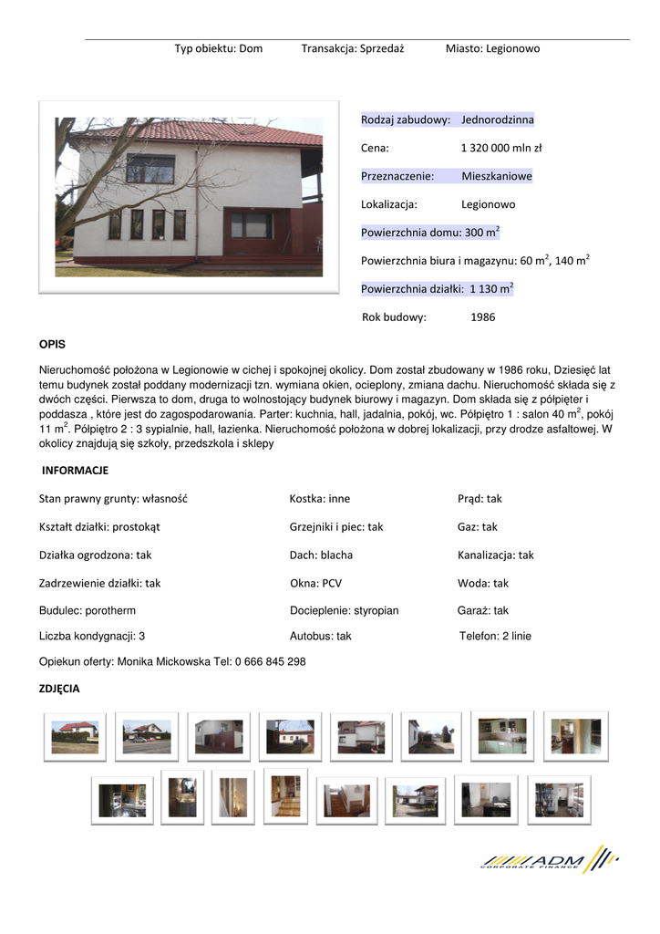 Typ obiektu: Dom Transakcja: Sprzedaż Miasto: Legionowo Rodzaj zabudowy: Jednorodzinna Cena: 1 320 000 mln zł Przeznaczenie: Mieszkaniowe Lokalizacja: Legionowo Powierzchnia domu: 300 m2 Powierzchnia biura i magazynu: 60 m2, 140 m2 Powierzchnia działki: 1 130 m2 Rok budowy: 1986 OPIS Nieruchomość położona w Legionowie w cichej i spokojnej okolicy. Dom został zbudowany w 1986 roku, Dziesięć lat temu budynek został poddany modernizacji tzn. wymiana okien, ocieplony, zmiana dachu. Nieruchomość składa się z dwóch części. Pierwsza to dom, druga to wolnostojący budynek biurowy i magazyn. Dom składa się z półpięter i 2 poddasza , które jest do zagospodarowania. Parter: kuchnia, hall, jadalnia, pokój, wc. Półpiętro 1 : salon 40 m , pokój 2 11 m . Półpiętro 2 : 3 sypialnie, hall, łazienka. Nieruchomość położona w dobrej lokalizacji, przy drodze asfaltowej. W okolicy znajdują się szkoły, przedszkola i sklepy INFORMACJE Stan prawny grunty: własność Kostka: inne Prąd: tak Kształt działki: prostokąt Grzejniki i piec: tak Gaz: tak Działka ogrodzona: tak Dach: blacha Kanalizacja: tak Zadrzewienie działki: tak Okna: PCV Woda: tak Budulec: porotherm Docieplenie: styropian Garaż: tak Liczba kondygnacji: 3 Autobus: tak Telefon: 2 linie Opiekun oferty: Monika Mickowska Tel: 0 666 845 298 ZDJĘCIA
