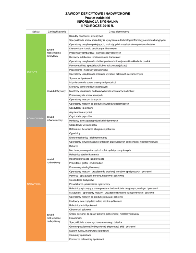 ZAWODY DEFICYTOWE I NADWYŻKOWE Powiat nakielski INFORMACJA SYGNALNA II PÓŁROCZE 2015 R. Sekcja Zaklasyfikowanie Grupa elementarna Doradcy finansowi i inwestycyjni Specjaliści do spraw sprzedaży (z wyłączeniem technologii informacyjno-komunikacyjnych) Operatorzy urządzeń pakujących, znakujących i urządzeń do napełniania butelek zawód maksymalnie deficytowy Kierownicy w handlu detalicznym i hurtowym Pracownicy lombardów i instytucji pożyczkowych Kierowcy autobusów i motorniczowie tramwajów Operatorzy urządzeń do obróbki powierzchniowej metali i nakładania powłok Farmaceuci bez specjalizacji lub w trakcie specjalizacji Pszczelarze i hodowcy jedwabników DEFICYT Operatorzy urządzeń do produkcji wyrobów szklanych i ceramicznych Spawacze i pokrewni Inżynierowie do spraw przemysłu i produkcji Kierowcy samochodów ciężarowych zawód deficytowy Monterzy konstrukcji budowlanych i konserwatorzy budynków Pracownicy do spraw transportu Operatorzy maszyn do szycia Operatorzy maszyn do produkcji wyrobów papierniczych Spedytorzy i pokrewni Asystenci nauczycieli RÓWNOWAGA zawód zrównoważony Czyściciele pojazdów Hodowcy zwierząt gospodarskich i domowych Sprzedawcy w stacji paliw Betoniarze, betoniarze zbrojarze i pokrewni Ogrodnicy Elektromechanicy i elektromonterzy Operatorzy innych maszyn i urządzeń przetwórczych gdzie indziej niesklasyfikowani Dekarze Mechanicy maszyn i urządzeń rolniczych i przemysłowych Robotnicy obróbki kamienia zawód nadwyżkowy Ręczni pakowacze i znakowacze Projektanci grafiki i multimediów Pracownicy obsługi biurowej Operatorzy maszyn i urządzeń do produkcji wyrobów spożywczych i pokrewni Pomoce i sprzątaczki biurowe, hotelowe i pokrewne Gospodarze budynków NADWYŻKA Posadzkarze, parkieciarze i glazurnicy Robotnicy wykonujący prace proste w budownictwie drogowym, wodnym i pokrewni Maszyniści i operatorzy maszyn i urządzeń dźwigowo-transportowych i pokrewni Operatorzy maszyn do produkcji obuwia i pokrewni Hodowcy zwierząt gdzie indziej niesklasyfikowani Robotnicy leśni i pokrewni Obuwnicy i pokrewni zawód maksymalnie nadwyżkowy Średni personel do spraw zdrowia gdzie indziej niesklasyfikowany Ekonomiści Specjaliści do spraw wychowania małego dziecka Górnicy podziemnej i odkrywkowej eksploatacji złóż i pokrewni Dyżurni ruchu, manewrowi i pokrewni Ceramicy i pokrewni Formierze odlewniczy i pokrewni Sekcja NADWYŻKA Zaklasyfikowanie zawód maksymalnie nadwyżkowy Grupa elementarna Analitycy systemów komputerowych i programiści gdzie indziej niesklasyfikowani Pracownicy opieki osobistej w ochronie zdrowia i pokrewni gdzie indziej niesklasyfikowani Sportowcy i dżokeje *Monitoring zawodów deficytowych i nadwyżkowych został wykonany według nowej metodologii przygotowanej w ramach projektu współfinansowanego ze środków UE w ramach EFS „Opracowanie nowych zaleceń metodycznych prowadzenia monitoringu zawodów deficytowych i nadwyżkowych na lokalnym rynku pracy".