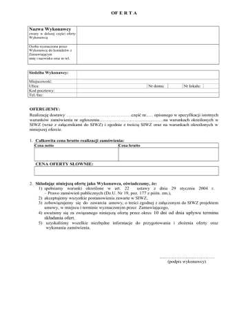 OF E R T A Nazwa Wykonawcy zwany w dalszej części oferty Wykonawcą Osoba wyznaczona przez Wykonawcę do kontaktów z Zamawiającym imię i nazwisko oraz nr tel. Siedziba Wykonawcy: Miejscowość: Ulica: Kod pocztowy: Tel./fax: Nr domu: Nr lokalu: OFERUJEMY: Realizację dostawy ……………………………………..……………część nr..… opisanego w specyfikacji istotnych warunków zamówienia nr ogłoszenia………………………..……..……na warunkach określonych w SIWZ (wraz z załącznikami do SIWZ) i zgodnie z treścią SIWZ oraz na warunkach określonych w niniejszej ofercie. 1. Całkowita cena brutto realizacji zamówienia: Cena netto Cena brutto CENA OFERTY SŁOWNIE: 2. Składając niniejszą ofertę jako Wykonawca, oświadczamy, że: 1) spełniamy warunki określone w art. 22 ustawy z dnia 29 stycznia 2004 r. – Prawo zamówień publicznych (Dz.U. Nr 19, poz. 177 z późn. zm.), 2) akceptujemy wszystkie postanowienia zawarte w SIWZ, 3) zobowiązujemy się do zawarcia umowy, o treści zgodnej z załączonym do SIWZ projektem umowy, w miejscu i terminie wyznaczonym przez Zamawiającego, 4) uważamy się za związanego niniejszą ofertą przez okres 10 dni od dnia upływu terminu składania ofert. 5) uzyskaliśmy wszelkie niezbędne informacje do przygotowania i złożenia oferty oraz wykonania zamówienia. ……………………………… (podpis wykonawcy) Formularz cenowy do oferty dostawa warzyw i owoców – część 1 L.p. 1. 2. 3. 4. 5. 6. 7. 8. 9. 10. 11. 12. 13. 14. 15. 16. 17. 18. 19. 20. 21. 22. 23. 24. Opis przedmiotu zamówienia Brzoskwinia Buraki czerwone Arbuz Cebula Cytryna Cukinia Czosnek Fasola Jaś Fasola szparagowa Groszek łuskany Gruszka Banan Jabłka do bezpośredniego spożycia Jabłko suszone Kalafior Kapusta kiszona Kapusta pekińska Śledź w oleju Śliwka kalifornijska 12 g Kapusta świeża Kapusta świeża Koper Sałata lodowa Mandarynka Jedn. miary kg kg kg kg kg kg kg kg kg kg kg kg kg kg szt kg szt kg szt kg szt pęczek szt kg Ilość 150 1000 130 700 170 120 30 80 150 30 60 90 1250 5 300 450 100 80 20 250 300 500 150 80 Cena jedn. netto załącznik nr 1 Cena jedn. brutto Wartość netto Wartość brutto L.p. 25. 26. 27. 28. 29. 30. 31. 32. 33. 34. 35. 36. 37. 38. 39. 40. 41. Opis przedmiotu zamówienia Marchew Ogórek świeży Papryka Pieczarki Pietruszka Pomarańcza Pomidor Brokuł Pory Morela Rzodkiewka Sałata zielona Seler Szczypiorek Śliwa Pietruszka nać pęczki Ziemniaki Jedn. miary kg kg kg kg kg kg kg szt szt kg pęczek szt kg pęczek kg szt kg Ilość Cena jedn. netto Cena jedn. butto Wartość netto Wartość brutto 1400 250 50 250 100 50 350 150 180 100 150 350 180 500 200 350 7500 Razem: ……………………………. (podpis) Formularz cenowy do oferty dostawa jaj - część 2 L.p. 1. Opis przedmiotu zamówienia Jaja klasy M2A Jedn. miary szt Ilość Cena jedn. netto załącznik nr 2 Cena jedn. brutto Wartość netto Wartość brutto 9000 ……………………………. (podpis)